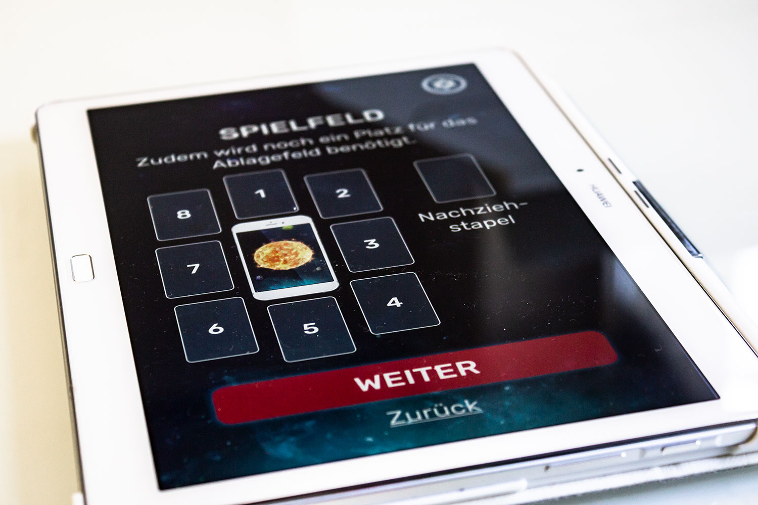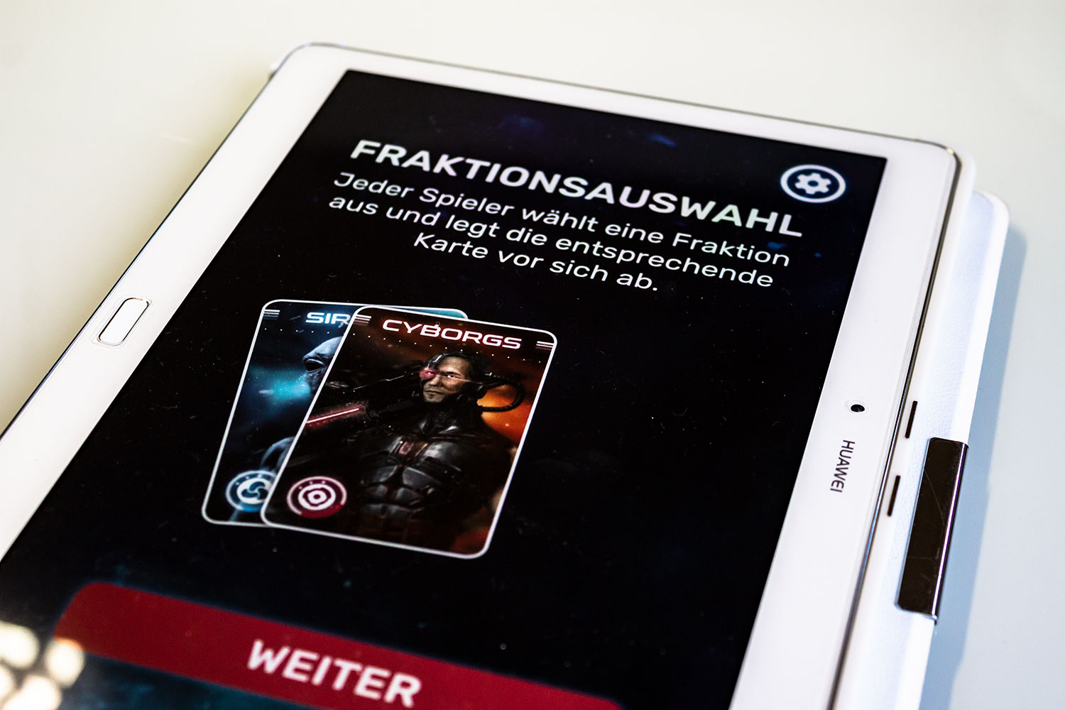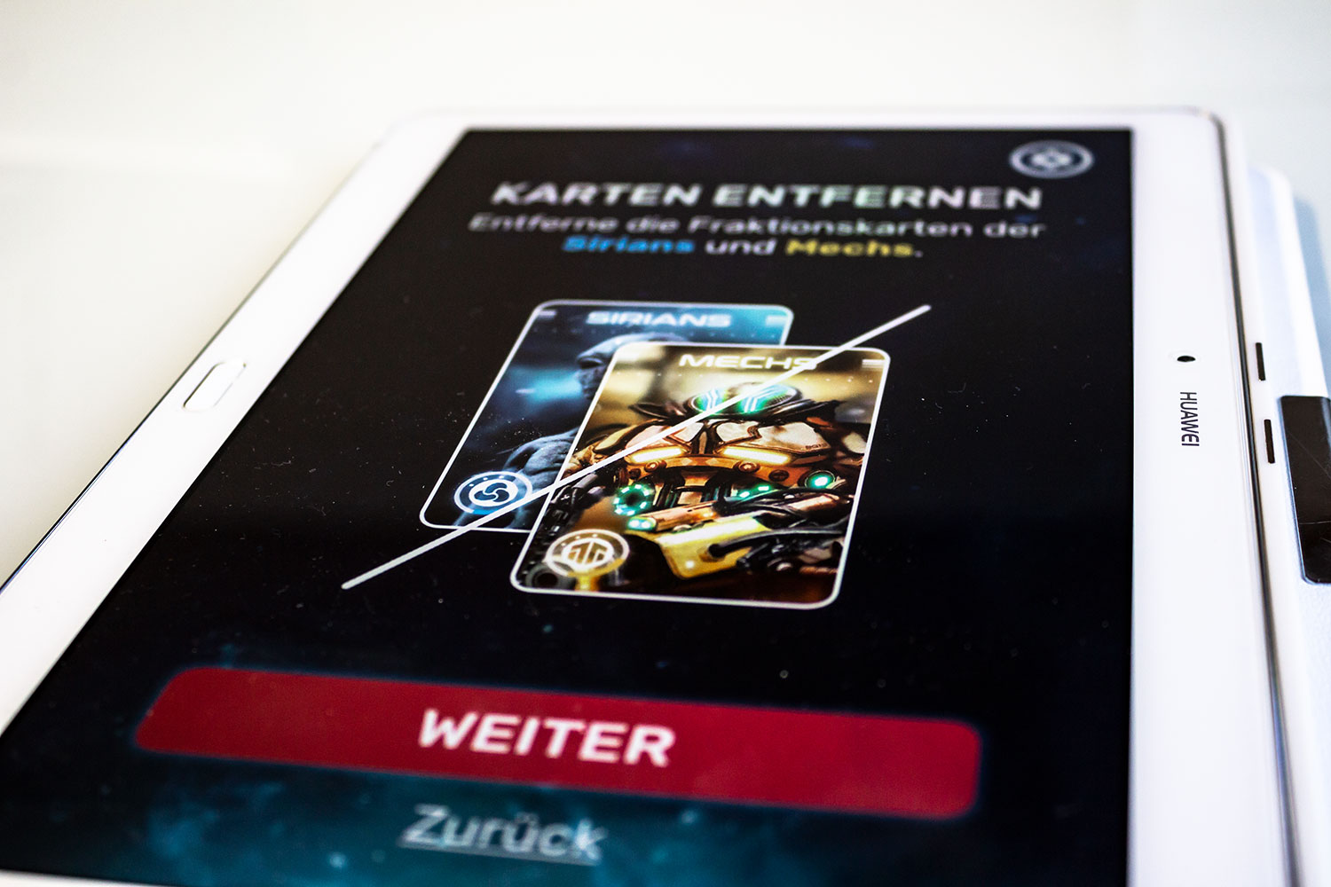 Zur Spielvorbereitung muss die App installiert werden und das Tablet oder das Handy in die Tischmitte gelegt werden. Nun wird entschieden, wie viele Runden gespielt wird. Dann wird eingestellt, wie viele Spieler (2-4) mitmachen wollen und welche Fraktion sie auswählen. Das beeinflusst die Zusammenstellung des Nachziehstapels, wird von der App aber ebenfalls beschrieben. Sonderkarten werden bis auf Raumschiffkarten vorerst aus dem Stapel herausgeholt und griffbereit zu Seite gelegt. Sind die Karten gemischt, werden sie bereitgelegt und Jeder Spieler bekommt 7 Karten auf die Hand, von denen 5 behalten werden. Die überzähligen landen auf dem Ablagestapel.