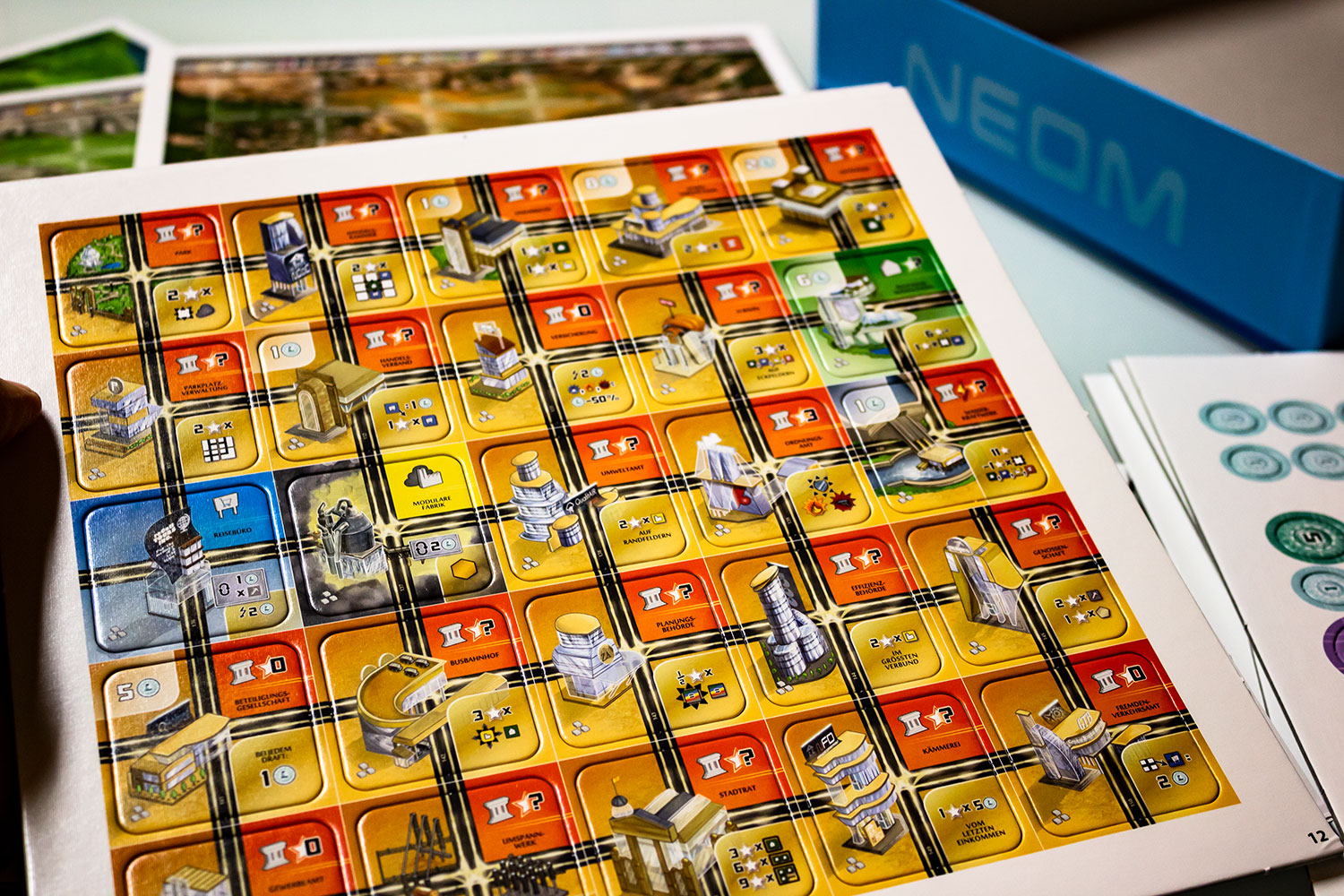 „NEOM“ ist ein sehr intuitiv zu spielendes Spiel. Das aus 7 Wonder bekannte Ziehen und Weitergeben funktioniert hier hervorragend. Das Spiel läuft mit diesem Ansatz selbst zu fünft angenehm flüssig. Jeder Spieler hat Spaß, denn nach und nach entsteht eine immer größere Stadt. Diese sollte gut geplant sein, damit die guten Plättchen sinnvoll eingebaut werden können.