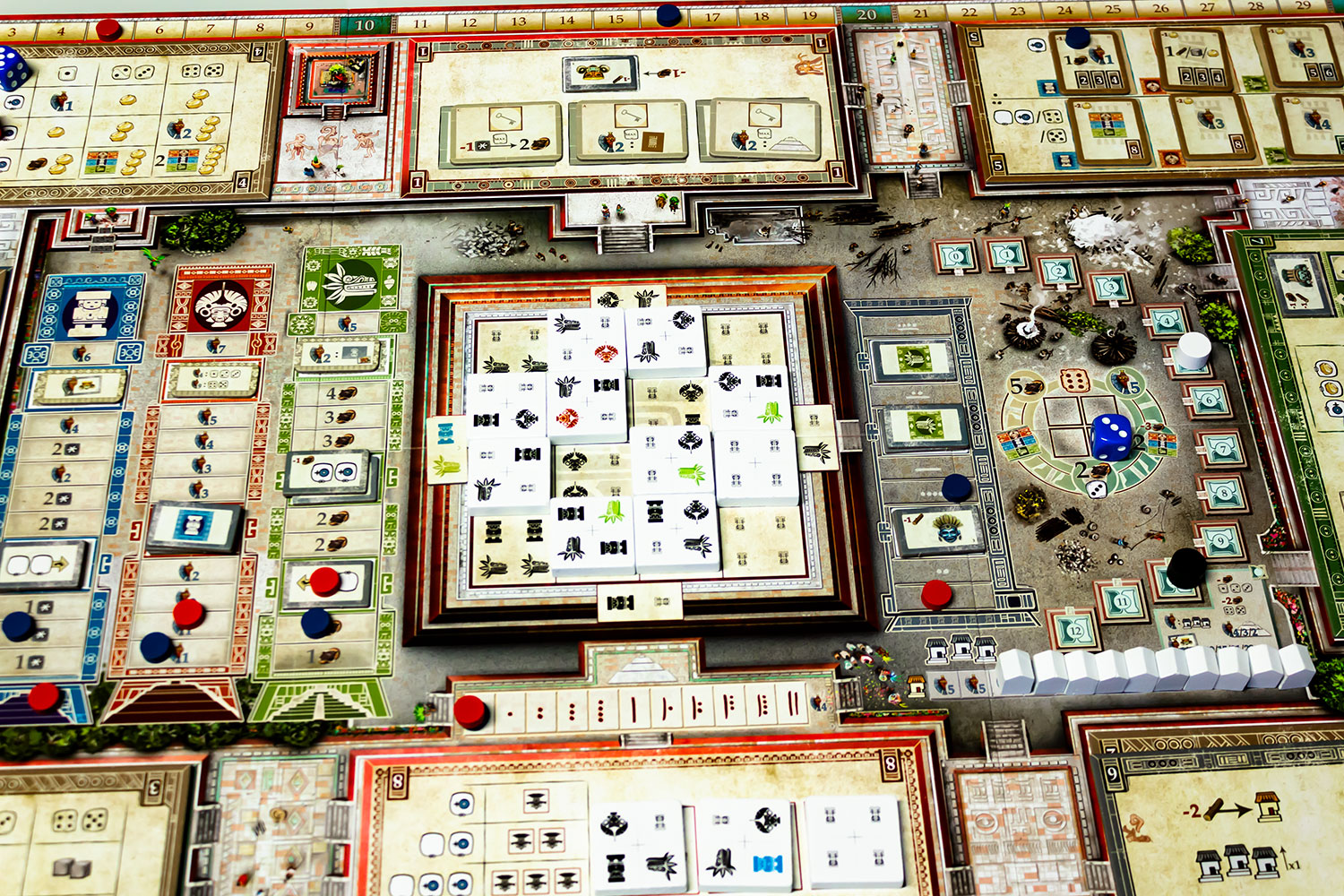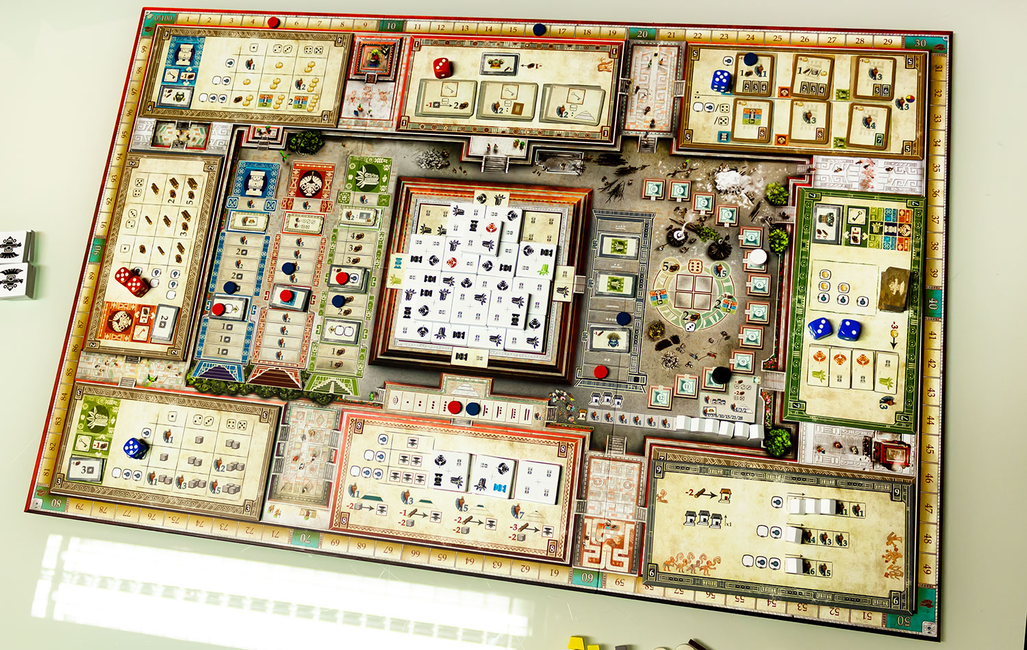 „Teotihuacan“, oder wie viele meiner Mitspieler zu sagen pflegen „das Spiel mit dem unaussprechlichen Namen“, ist ein recht komplexes Spiel, bezogen auf die Möglichkeiten, die es bietet. Die Spielfunktionen sind jedoch sehr simpel. Es gibt Würfel als Arbeiter. Keine Angst - diese dienen nur als eine Speicherfunktion des Alters der Arbeiter. Sie werden nie geworfen und es gibt keinen Glücksfaktor im Spiel.