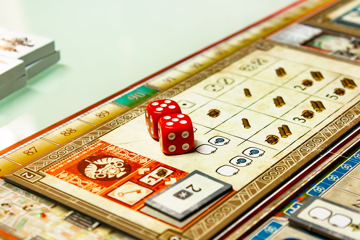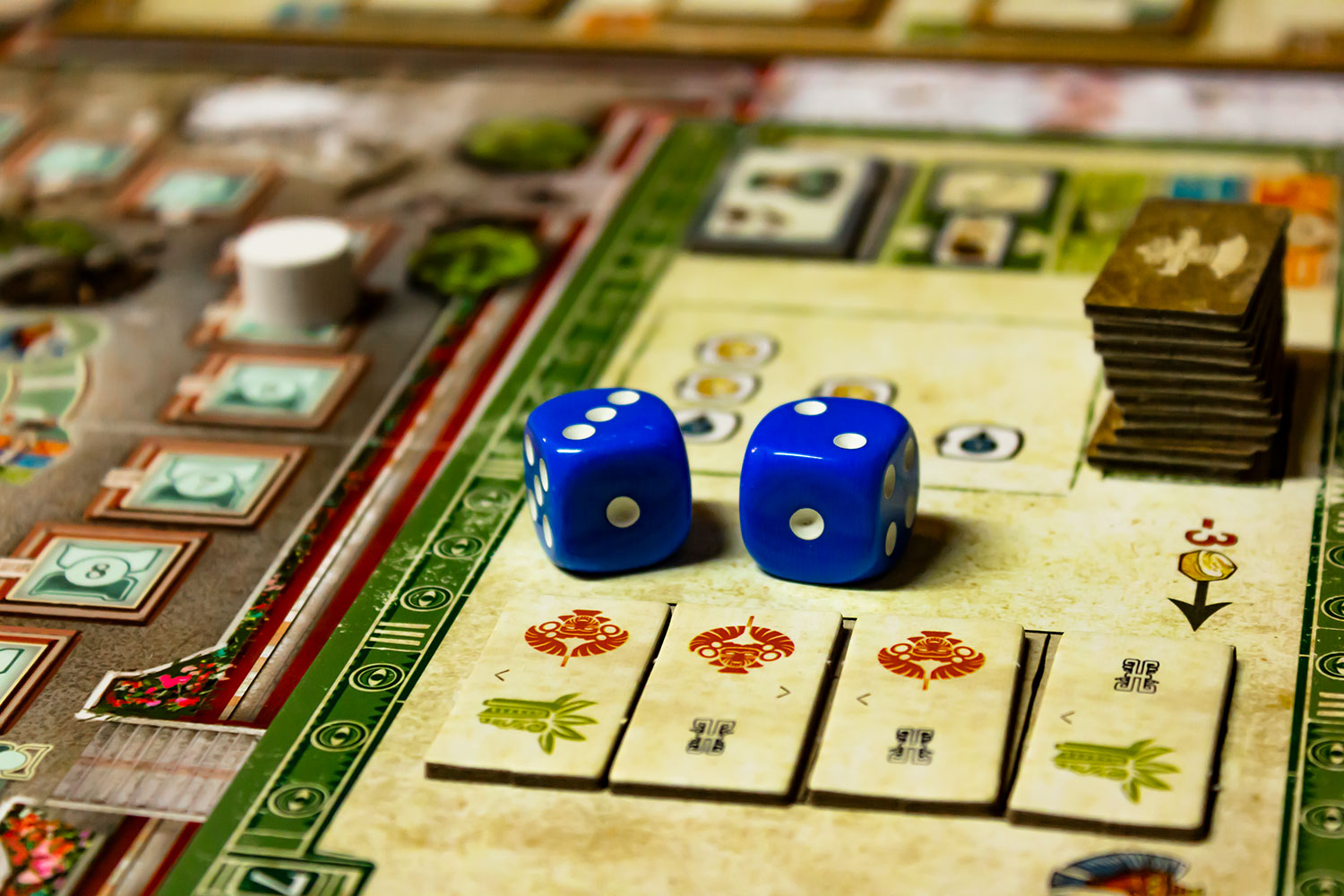 „Teotihuacan“ hat mich wirklich überrascht. Am Anfang ist es erschlagend, wenn die acht Aktionsfelder beschrieben, die Aktionsmöglichkeiten aufgezeigt und die diversen Mechaniken beschrieben werden. Das Beste ist, nicht zu versuchen, alles zu verstehen und nicht schon in der ersten Partie den Anspruch zu hegen alles richtig zu machen. Losspielen und diese Spielwelt erkunden ist vollkommen ausreichend. Tatsächlich kamen alle Spieler verhältnismäßig schnell in der Spielwelt an und ab dann kann taktiert werden. Zum einen sollte ein Plan vorhanden sein, zum anderen ist Timing auch enorm wichtig. Da die Arbeiter immer im Rondel laufen und jede Runde ein Spieler nur einen Würfel bewegen darf (ohne Bonusplättchen) ist es manchmal wichtig mit dem Pulk zu laufen und oft auch wichtigen abseits vom Pulk zu bleiben. Wer Kakao benötigt, der sollte in der Gruppe bleiben. Wer ernsthaft produzieren will, sollte versuchen drei Würfel auf einem Feld zu vereinen. Das bringt sehr viele Rohstoffe oder andere Funktionen wie Produzieren. Doch dafür müssen dann vorab genug Rohstoffe angesammelt worden sein. Das können die Mitspieler dann erahnen und eventuell ein Feld teurer machen, in dem dort ein Würfle liegen bleibt.