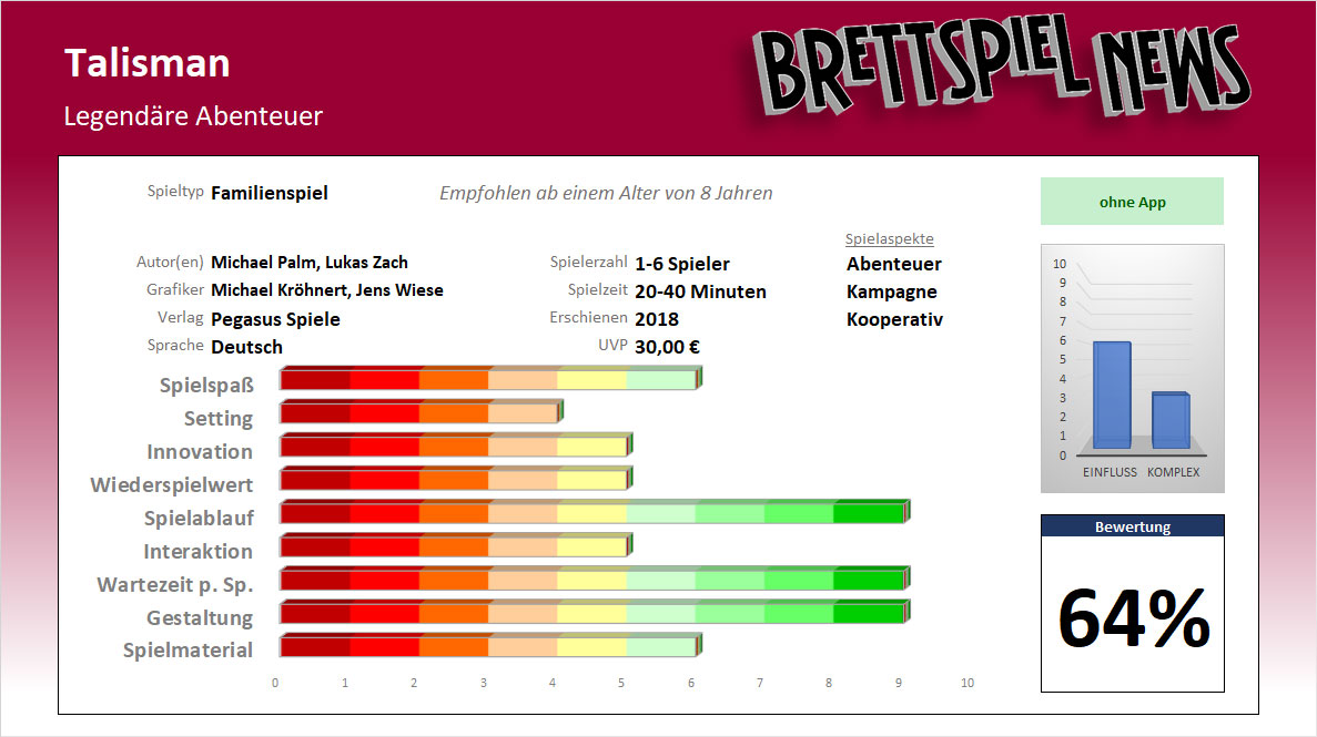Letzten Endes lässt sich die Frage, für wen das Spiel geeignet ist, ganz leicht beantworten: Familien mit Kindern bis zu den frühen Teenagerjahren dürften sehr viel Freude an dem Spiel haben und es öfter auf den Spieltisch holen. Insofern darf der Einstufung von Pegasus in die Kategorie Familienspiel vollauf vertraut werden. Nicht vertrauen sollte man allerdings einem evtl. Bauchgefühl, wenn man sich den Spieltitel „Talisman – Legendäre Abenteuer“ ansieht.