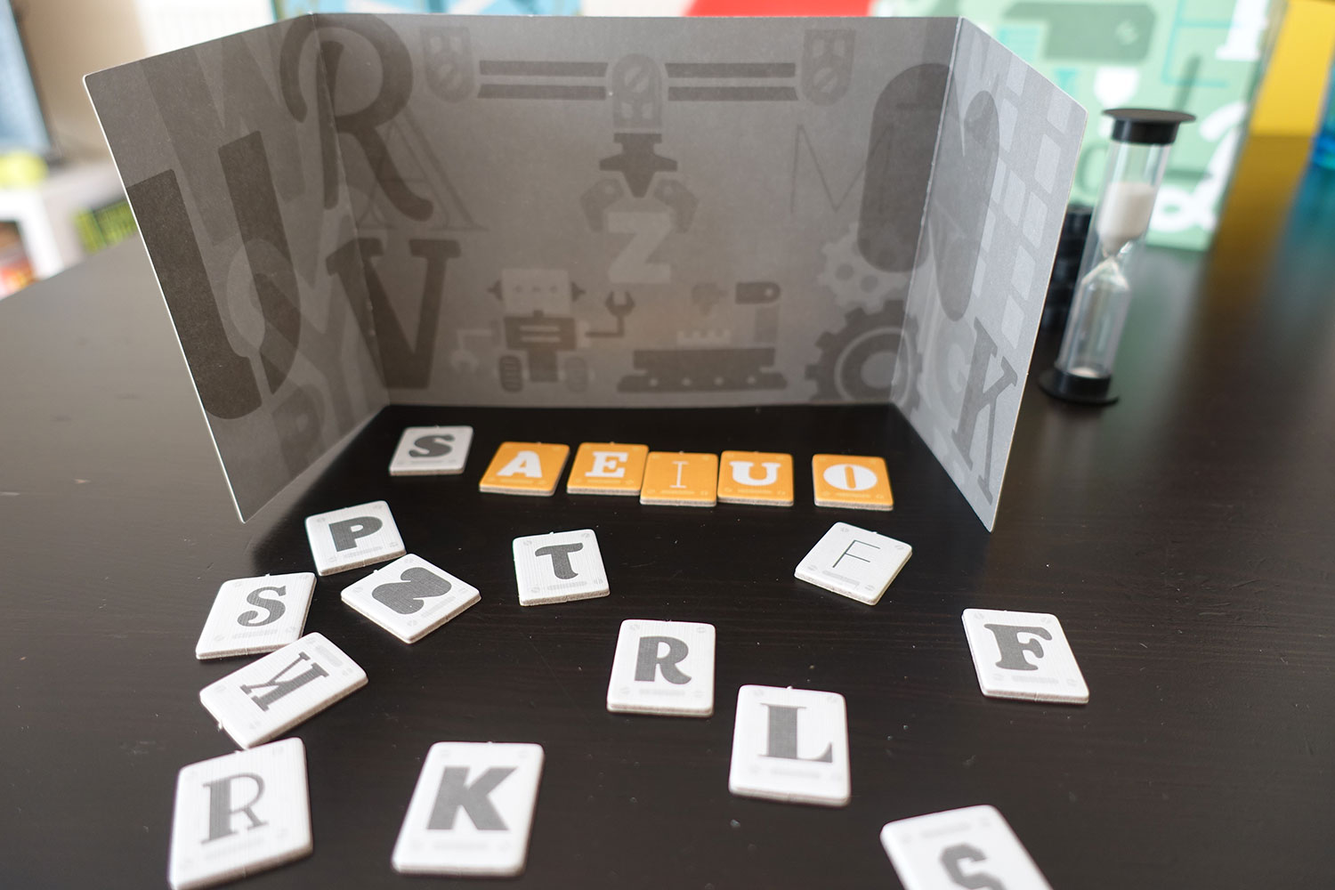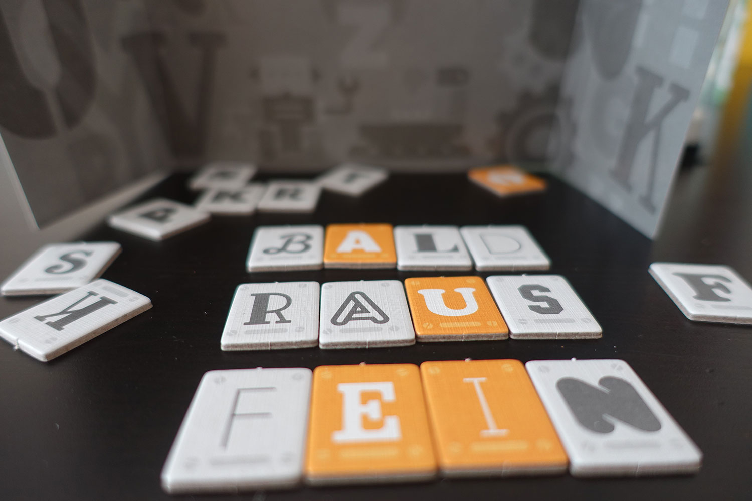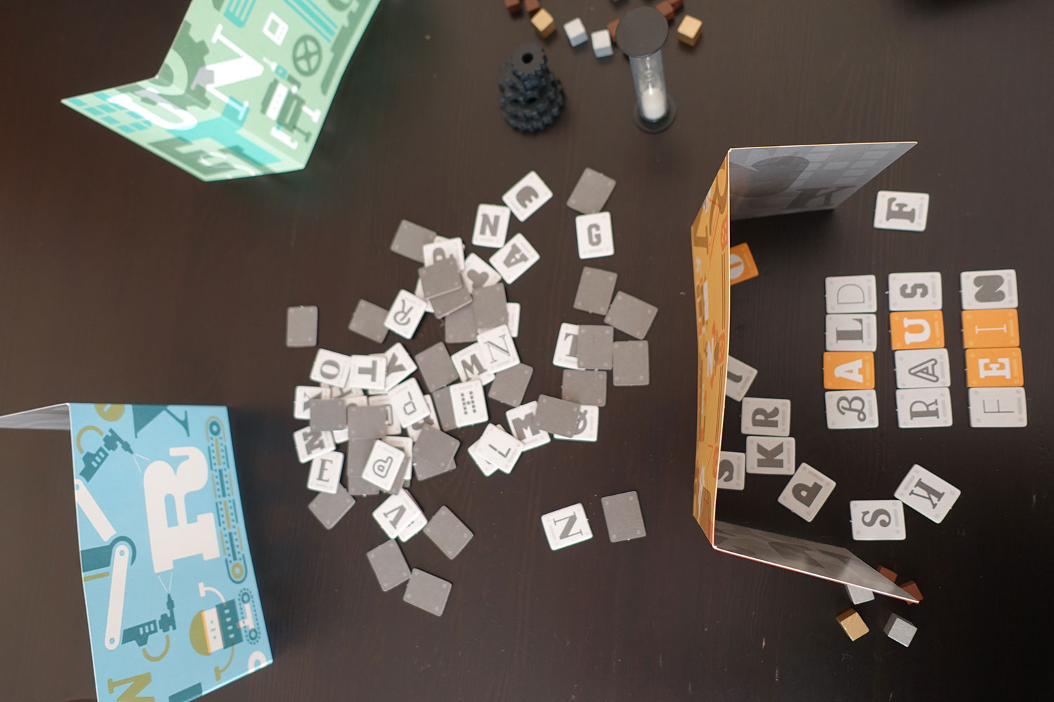 An einer 15-30 minütigen Partie können zwei bis fünf wortgewandte Fabrikleiter aber acht Jahren teilnehmen. Zunächst nimmt sich jeder Spieler 20 Buchstabenplättchen á la Scrabble und bastelt daraus hinter seinem Sichtschutz drei vierbuchstabige Wörter. Während diese (geheim) notiert werden, wandern die übrigen acht Plättchen zurück in die Tischmitte. Hat jeder drei Wörter gefunden, werden die dafür benötigten Plättchen umgedreht, gemischt und zum Tischnachbarn weitergereicht. Mit einem neuen Satz Buchstabenplättchen ausgestattet, liegt es jetzt an den Spielern wieder drei Wörter – am besten die Originale – zusammenzubasteln. Wer schnell ist und dabei auch noch die Originale rekonstruiert, gewinnt. Klingt einfacht? Wir haben uns auch geirrt…