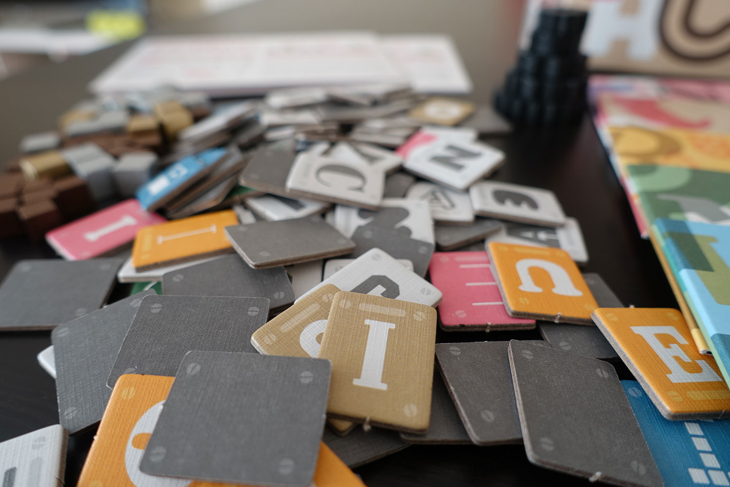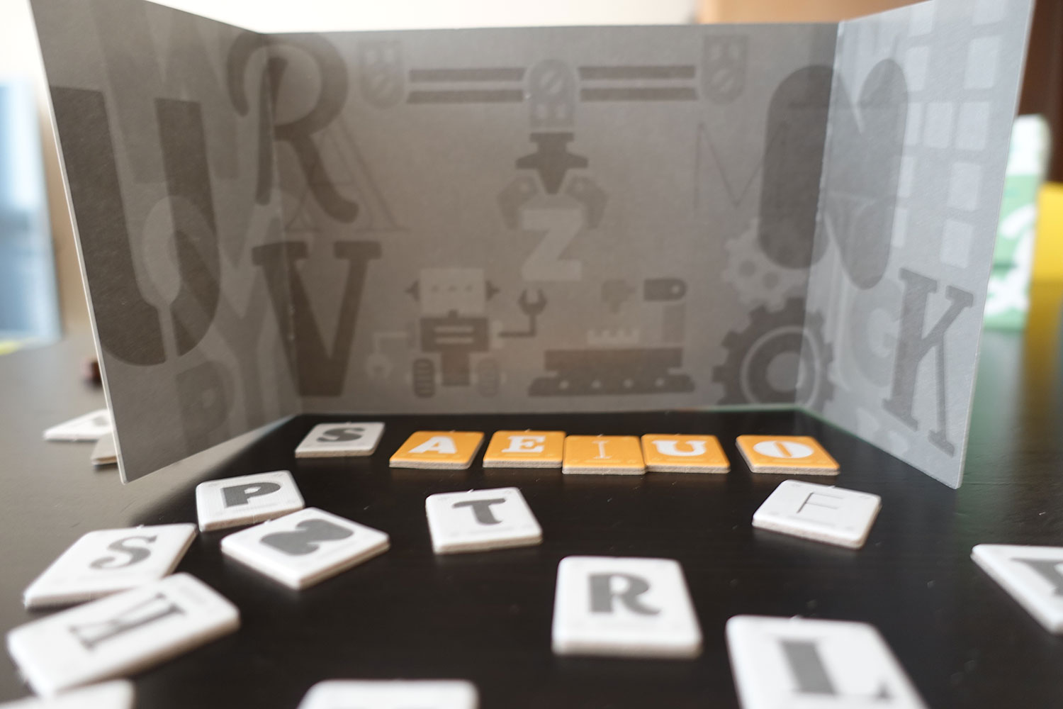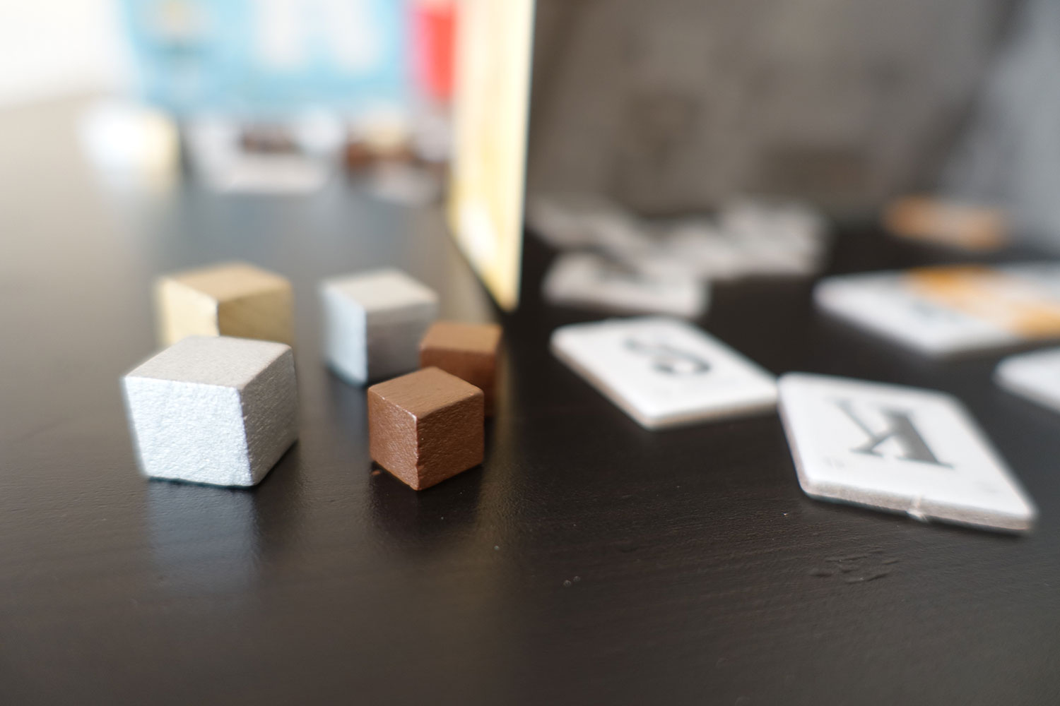 An einer 15-30 minütigen Partie können zwei bis fünf wortgewandte Fabrikleiter aber acht Jahren teilnehmen. Zunächst nimmt sich jeder Spieler 20 Buchstabenplättchen á la Scrabble und bastelt daraus hinter seinem Sichtschutz drei vierbuchstabige Wörter. Während diese (geheim) notiert werden, wandern die übrigen acht Plättchen zurück in die Tischmitte. Hat jeder drei Wörter gefunden, werden die dafür benötigten Plättchen umgedreht, gemischt und zum Tischnachbarn weitergereicht. Mit einem neuen Satz Buchstabenplättchen ausgestattet, liegt es jetzt an den Spielern wieder drei Wörter – am besten die Originale – zusammenzubasteln. Wer schnell ist und dabei auch noch die Originale rekonstruiert, gewinnt. Klingt einfacht? Wir haben uns auch geirrt…