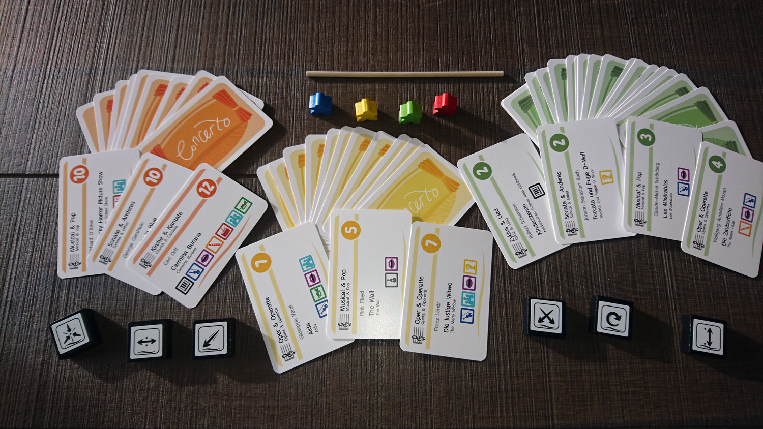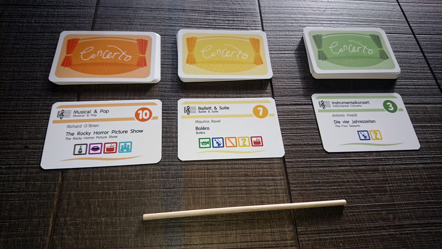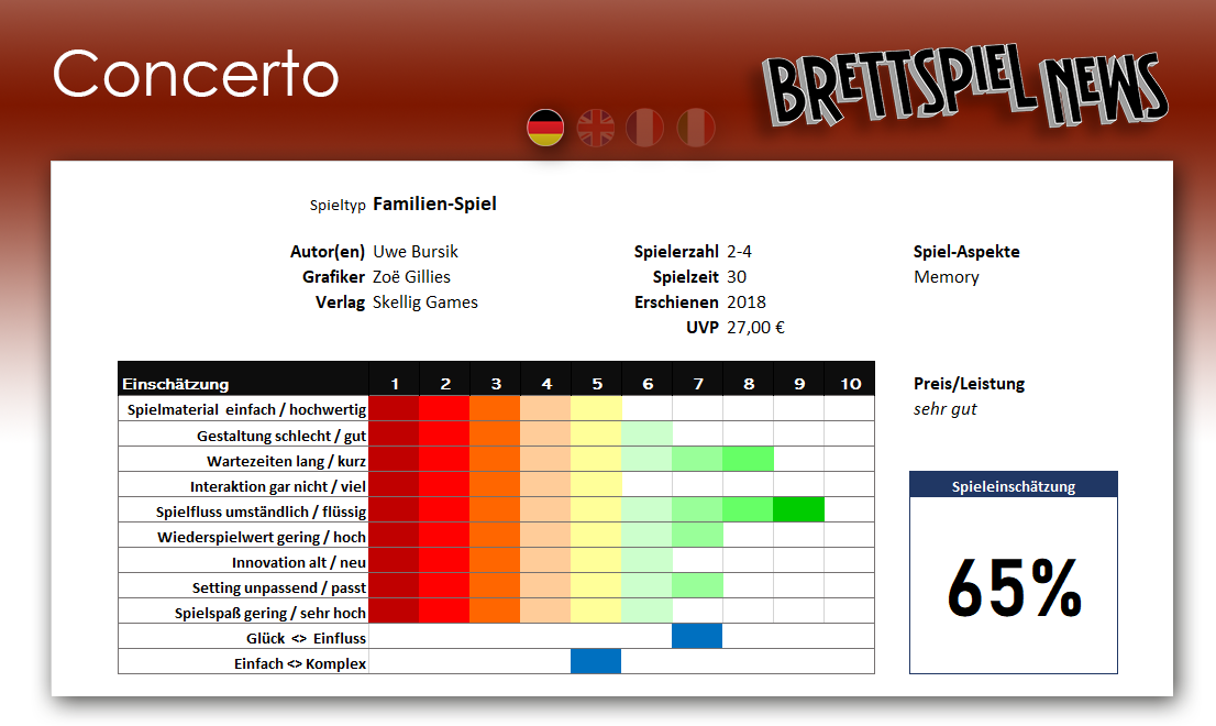 Von der Idee her mit den Buhs und DaCapos hätte „Concerto“ sicherlich das Zeug zum Partyspiel. Dies aber auch nur dann, wenn es nicht ums Gewinnen geht, da in lockerer Runde wahrscheinlich Instrumente schneller entlassen werden, als sich Spielfiguren auf dem Punktezähler in Richtung Ziel bewegen. So erscheint als passendste Runde zum Spielen der ruhige Sonntagnachmittag mit voller Konzentration, z.B. wenn die Verwandtschaft zu Besuch ist und etwas Gehaltvolles auf den Tisch kommen soll. Der Vorteil in diesem Fall sind die nicht allzu komplizierten Regeln und die überschaubaren Handlungsmöglichkeiten, die für einen schnellen Einstieg sorgen. Das Spiel für Zwischendurch ist „Concerto“ aber sicherlich nicht.
