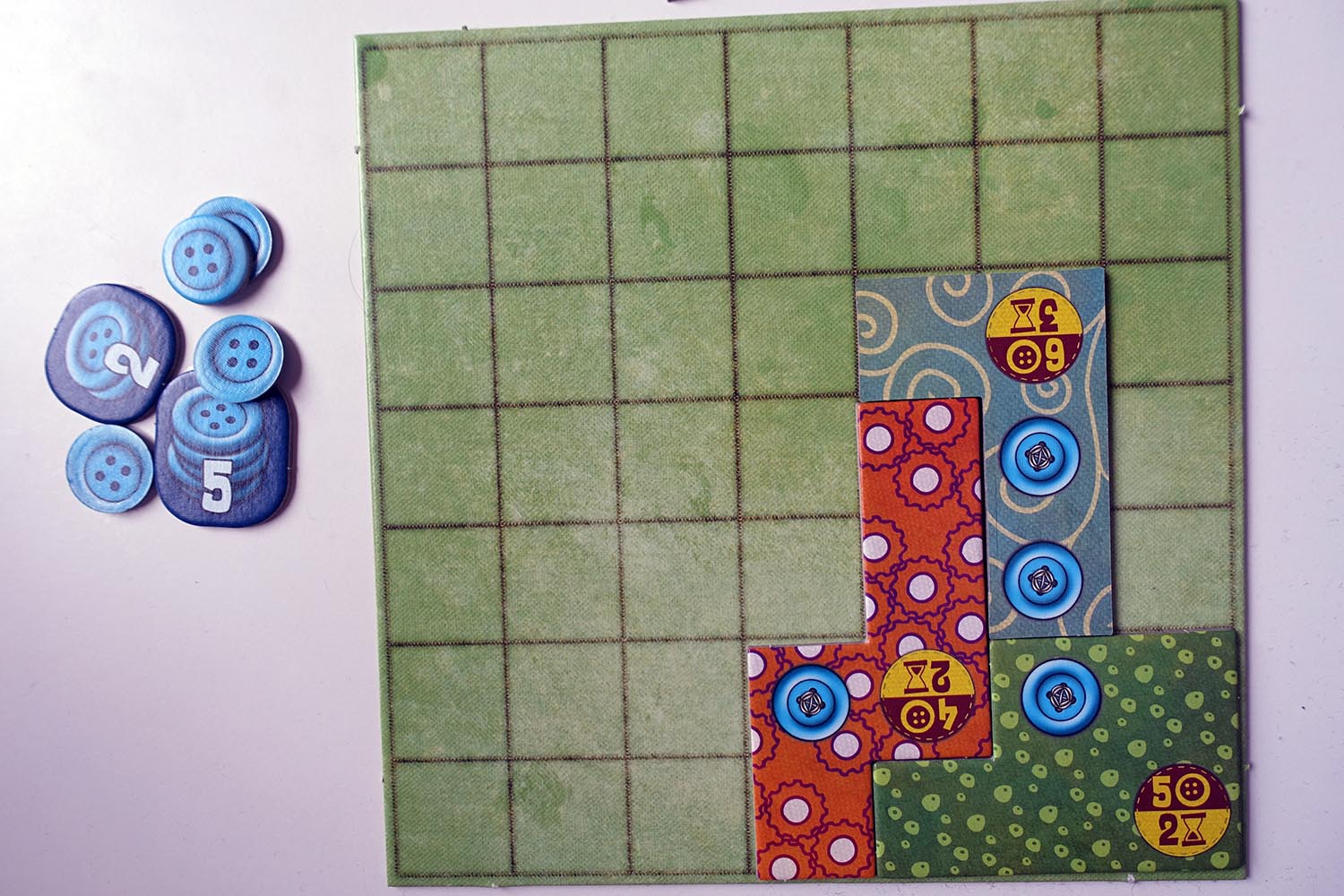 Zu Beginn einer Partie erhält jeder Spieler einen leeren Deckenplan sowie einige Knöpfe die in Patchwork die Währung darstellen. Außerdem werden zahlreiche unförmige Deckenflicken um den in der Tischmitte zu platzierenden Laufplan ausgelegt. Im Verlauf eines Spiels rücken die Spieler jeweils entweder auf dem Plan voran (wodurch sie Knöpfe erhalten und dem Spielende näherkommen) oder kaufen sich einen Flicken ihrer Wahl mit welchem sie ihr Patchworkprojekt fortsetzen können. Es ist dabei stets derjenige Spieler dran, der weiter hinten steht. So kann es also vorkommen, dass ein Spieler gleich mehrere Aktionen in Folge planen und ausführen kann. Erreicht ein Spieler das Zielfeld des Laufplans so ist die Partie beendet und der Gewinner wird ermittelt. Nun gelten alle gesammelten Knöpfe als ein Punkt – doch weist die Decke eines Spielers noch Lücken auf, so werden diesem pro freiem Feld zwei Punkte abgezogen. Geschicktes Sparen aber auch cleveres Flicken zahlen sich also aus!
