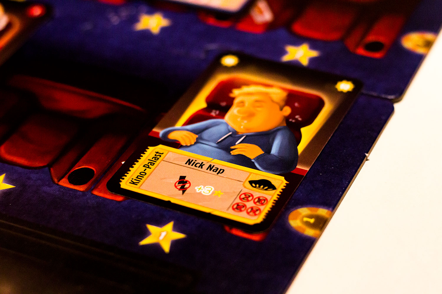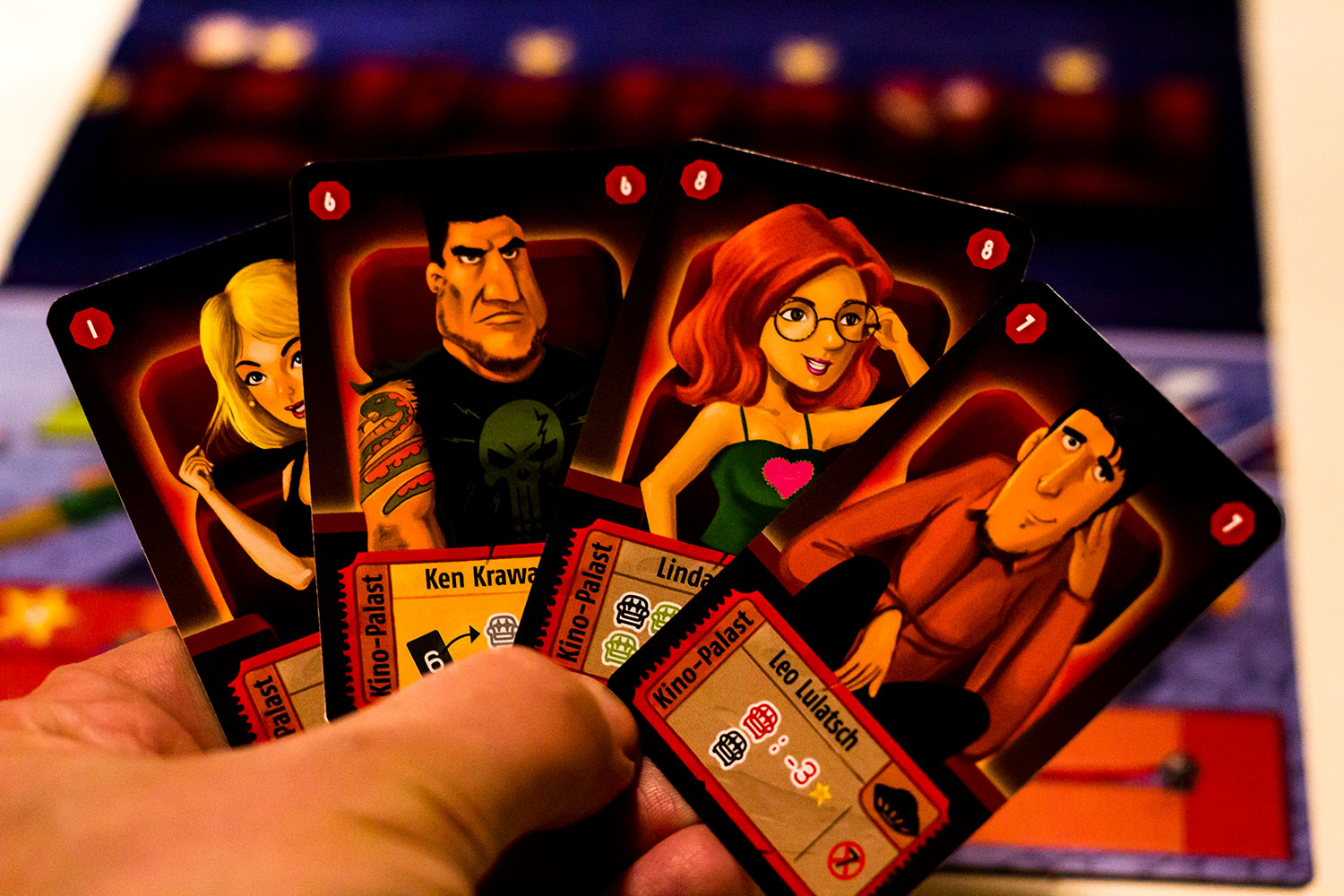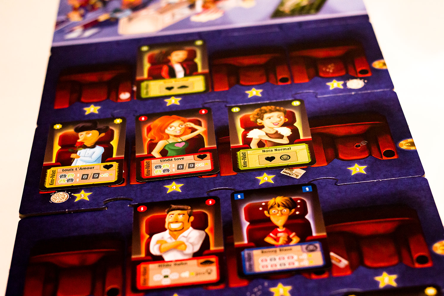 Der Spielablauf ist einfach. Immer wenn ein Spieler an der Reihe ist, darf er eine Karte spielen und zieht anschließend eine nach. Schaut der Charakter gerade sein Lieblings-Genre, erhält der Spieler gleich zwei Punkte. Weitere Punkte gibt es am Ende der Runde, wenn dass Kino voll besetzt ist. So bieten die Plätze in der Mitte mehr Punkte bei der Wertung und auch die Konstellation der Sitznachbarn ist relevant. Ein Männlicher Besucher erhält zum Beispiel vier Sonderpunkte, wenn sich rundherum Frauen befinden, während der nächste fast taub ist und am besten in der ersten Reihe sitzt. Dann gibt es noch Rüpel, die die anderen Sitznachbarn vertreiben oder die Normalos, die einfach nur eines von zwei Genres sehen wollen.