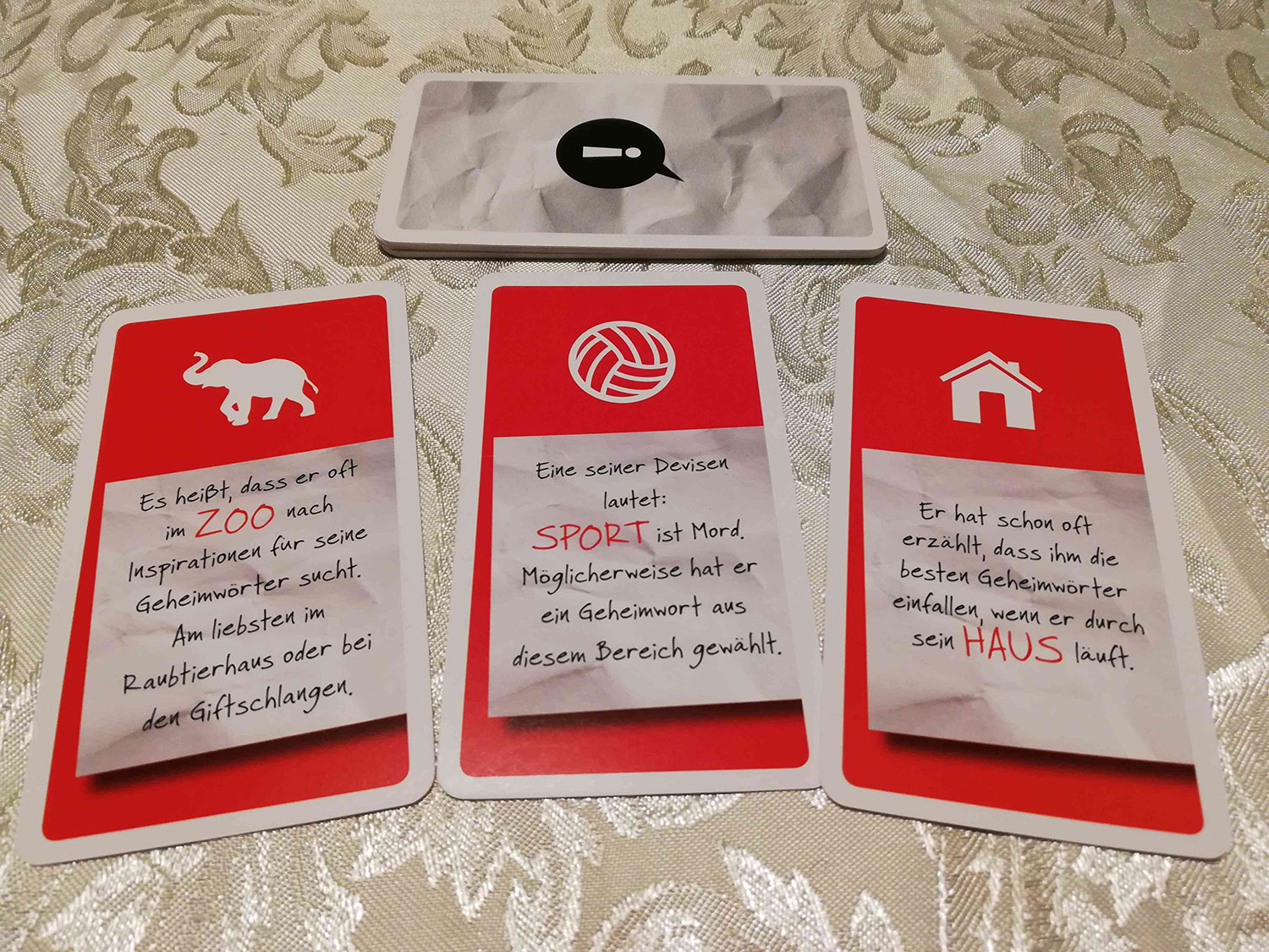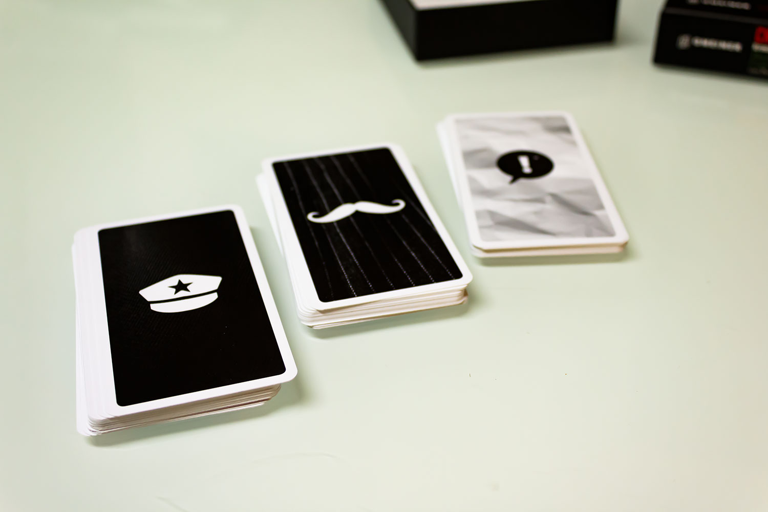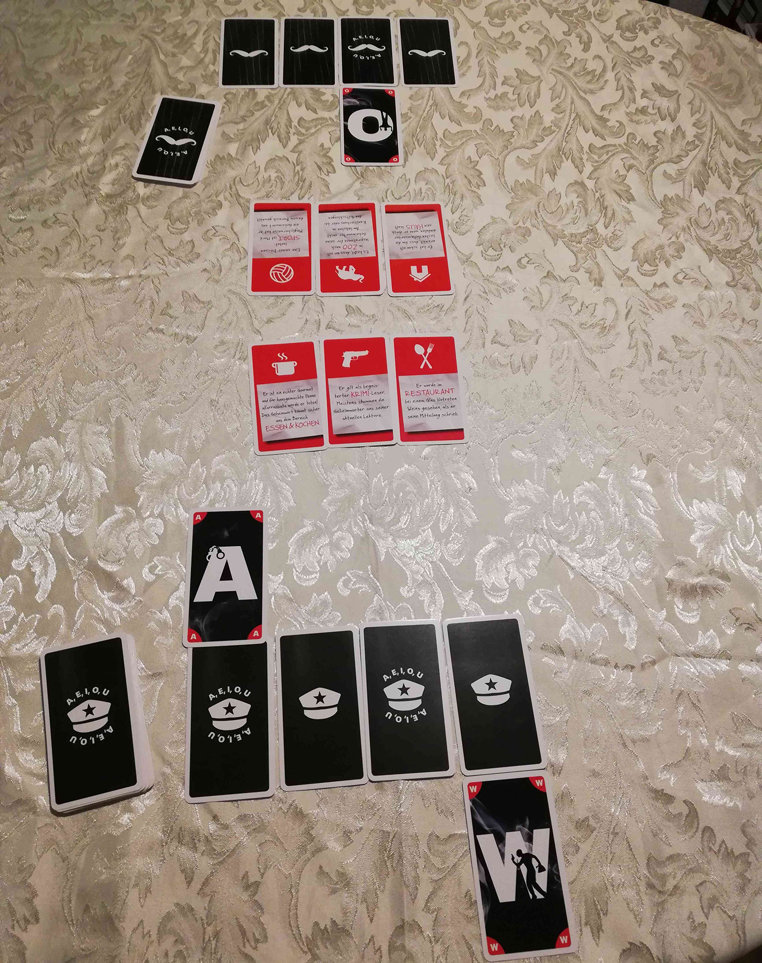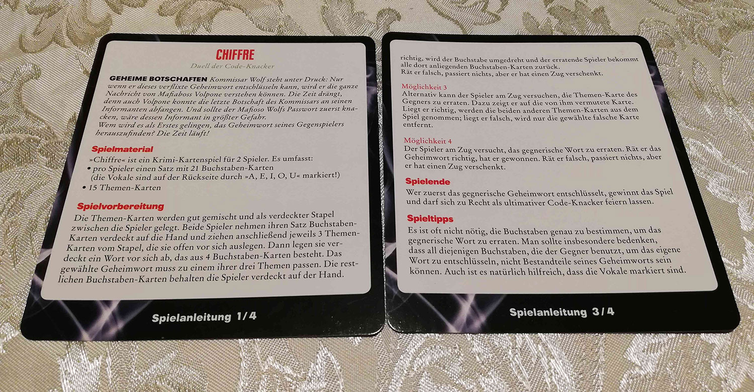 Zu Beginn erhält jeder ein Kartenset aus 21 Buchstaben-Karten. Nicht alle Buchstaben des Alphabets stehen also zur Verfügung. Beispielsweise fehlt das J. Außerdem werden pro Spieler drei Themen-Karten aufgedeckt und eine davon für die Partie ausgewählt (u.a. Küche, Musik und Haus). Aus diesem Themenkreis suchen sich die Kontrahenten dann ein Wort aus, welches aus vier Buchstaben bestehen muss. Die entsprechenden Buchstaben-Karten legt man dann verdeckt vor sich ab und schon beginnt das Code-Knacken. Abwechselnd raten Mafiaboss und Kommissar jetzt entweder einen Buchstaben, das Thema oder das Geheimwort selbst. Alternativ kann man aus der eigenen Hand eine Buchstaben-Karte auf einen gegnerischen Buchstaben legen. Liegt man richtig, muss der andere aufdecken und man erhält seine Karte zurück. Ansonsten wird die eigene Karte oberhalb des Buchstabens platziert, wenn der Teil des Codes im Alphabet danach kommt. Der Mafiaboss könnte zum Beispiel ein A auf das verdeckte O legen, weswegen der Kommissar das A oberhalb des O platzieren muss. Das Auslegen von Vokalen ist natürlich heikel, da der Andere hierdurch bereits einiges ausschließen kann. Analog geht man vor, wenn der Buchstabe des Gegenspielers im Alphabet nach der eigenen Buchstaben-Karte kommt. Kann ein Spieler das Geheimwort richtig erraten, gewinnt er sofort und eine neue Runde beginnt.
