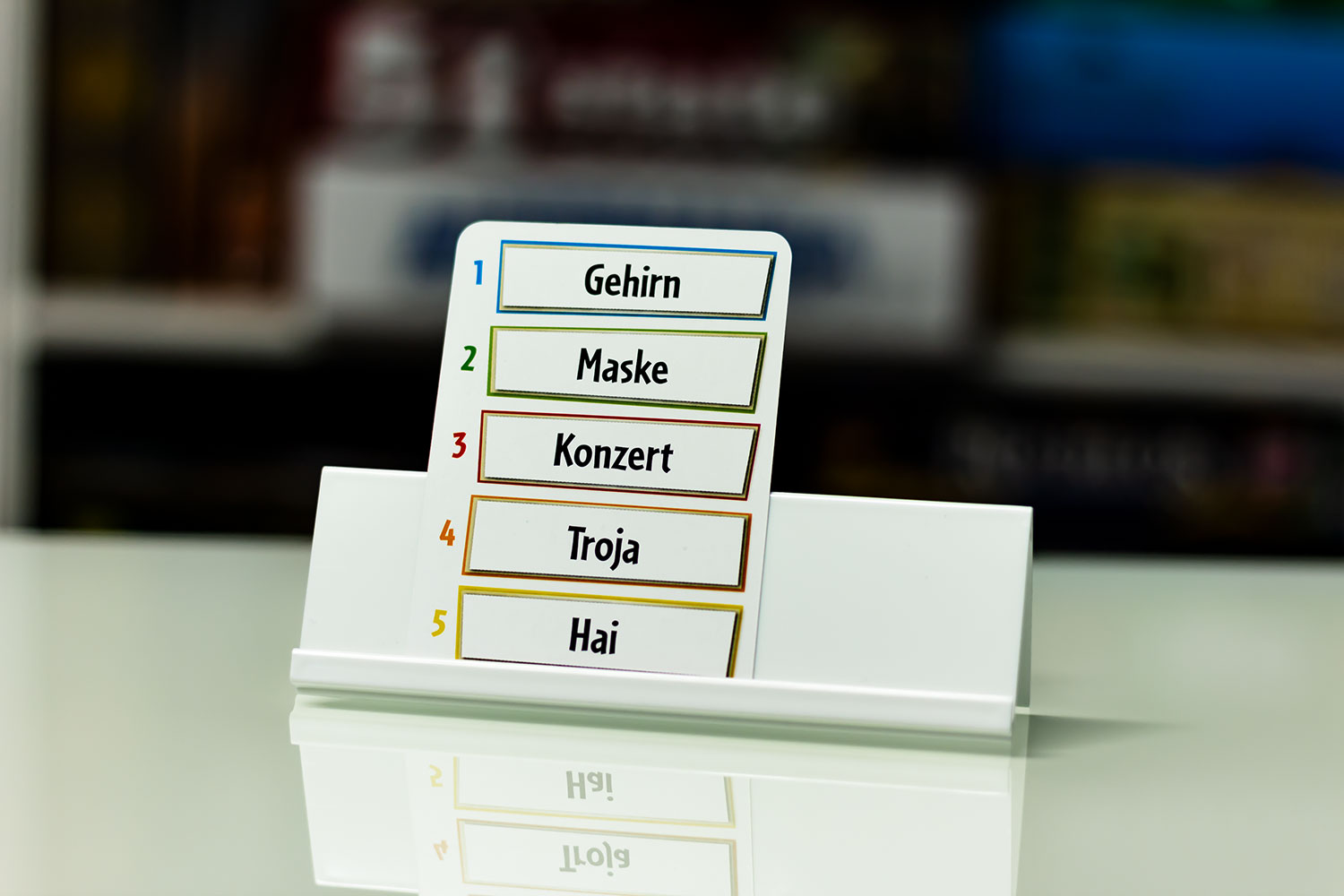 Der Startspieler zieht eine Karte und legt sie so auf seinen Kunststoffaufsteller, dass er sie nicht sehen kann. Er sagt eine zufällige Zahl zwischen 1 und 5. Die genannte Zahl gibt ein Wort auf der Karte an. Nun müssen die Mitspieler sich jeweils ein Wort ausdenken, das helfen könnte den Begriff zu erraten.