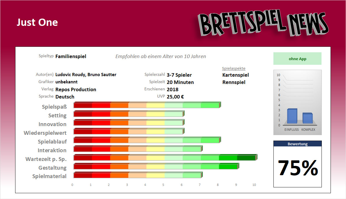 „Just One“ macht vieles richtig. Es ist genau das, was man erwarten darf: ein kreatives, lustiges schnelles Spiel für Gruppen. Meistens bleibt es nicht bei einer Partie, wenn man die geeignete Gruppe gefunden hat. Es ist auch perfekt für Familien und kann auch schon mit Kindern, die schreiben können gespielt werden. Für sie ist es dann gleich noch ein Training mit Wörtern zu arbeiten.