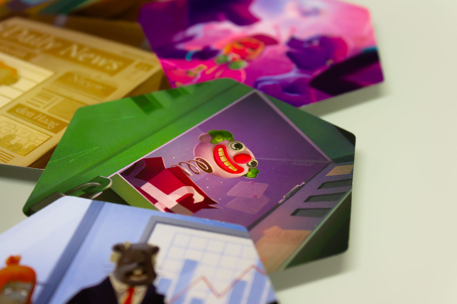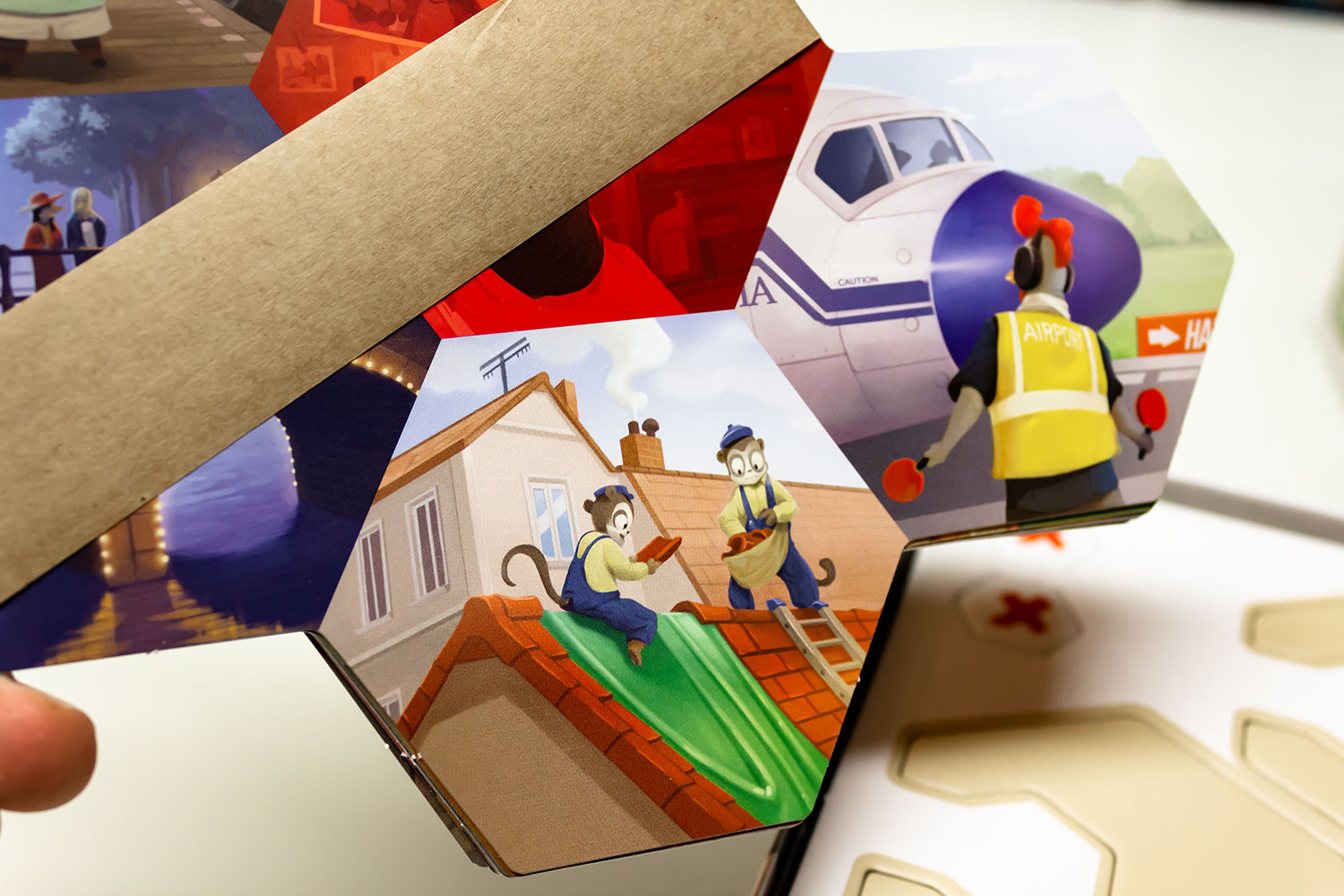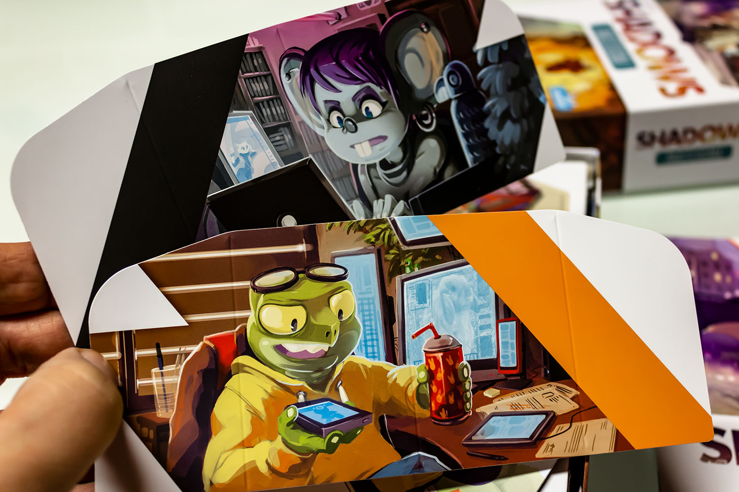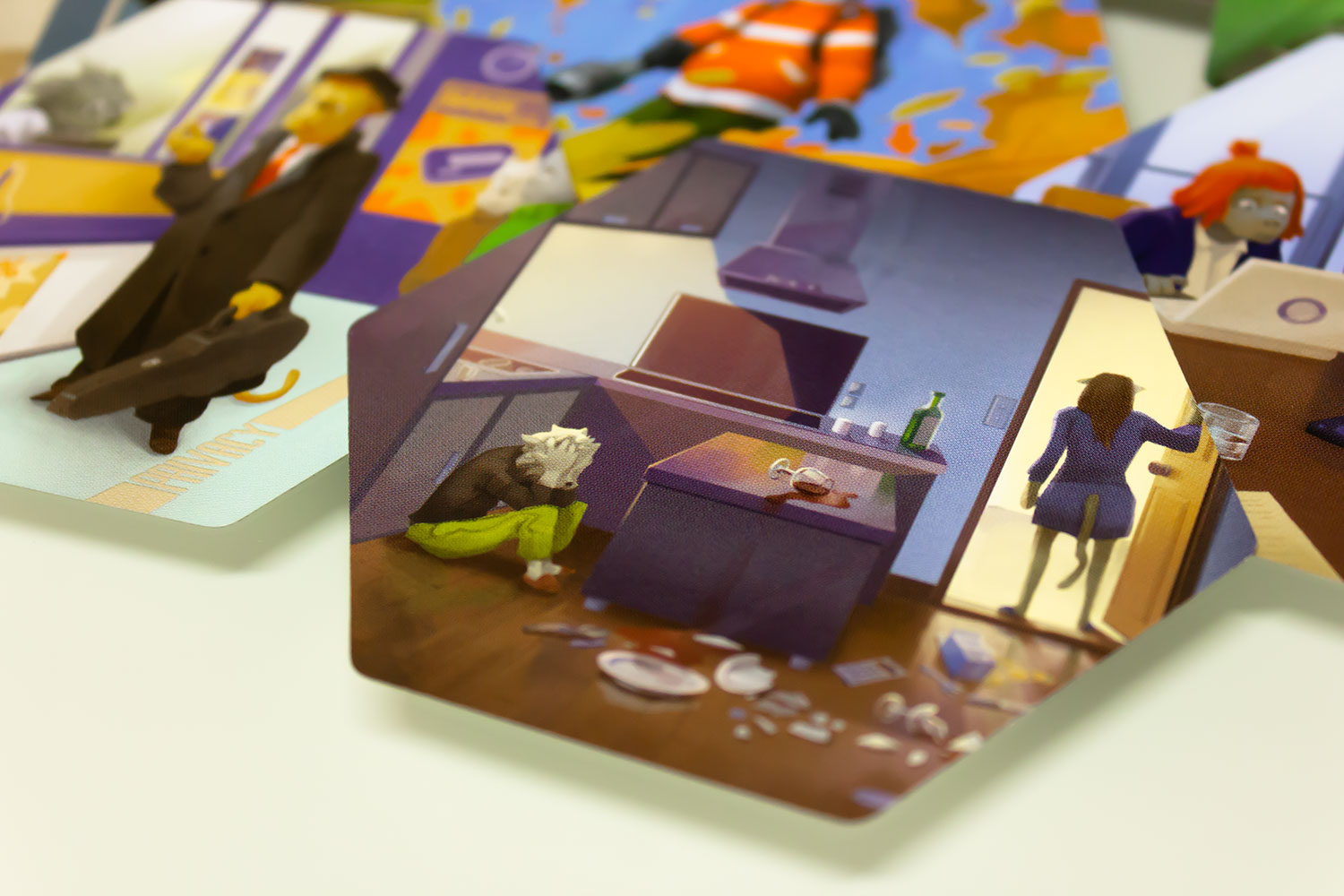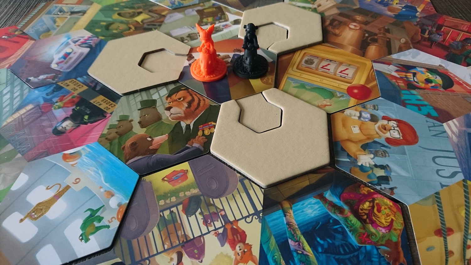 Optisch hat mich „Shadows Amsterdam“ direkt angesprochen. Der Grafikstil, bei dem ich sofort an „Zoomania“ denken musste, machte mich neugierig, was durch die interessant und rasant wirkende Spielmechanik noch weiter befeuert wurde. Die Anleitung war schnell verinnerlicht und das Spiel ebenso aufgebaut. Es konnte also los gehen mit den Nachwuchsdetektiven auf der Jagd nach Beweisen. Der Informant übergab die erste Karte und schon war klar…das hatte ich mir etwas anders vorgestellt. Der Umstand, dass es genau eine Karte als Hinweis geben darf und ansonsten keinerlei weiteren Schubs in die richtige Richtung, macht das Suchen nach dem richtigen Feld zu einem Lotteriespiel. Ist es die Farbe, die uns zu diesem Feld leiten soll? Oder kann es sein, dass es zwei Personen in einem Konflikt sind, auf die angespielt wurde? Aber auf dem Bild ist doch ein Vertrag zu sehen und auf dem anderen wird gerade vielleicht etwas unterschrieben? Oder kann es sein, dass die Gemälde im Hintergrund der Hinweis sind? Ja, genau! Alles könnte richtig sein, aber natürlich ist nur eines der gedachte Weg, um die Detektive durch die Stadt zu lotsen.