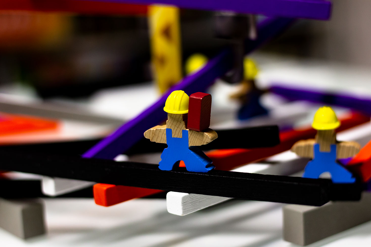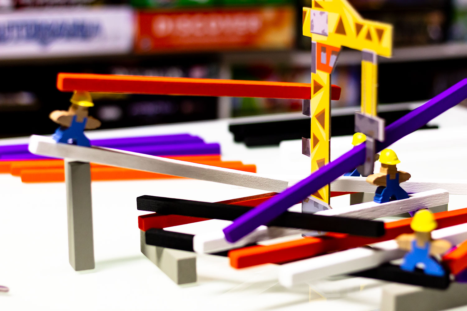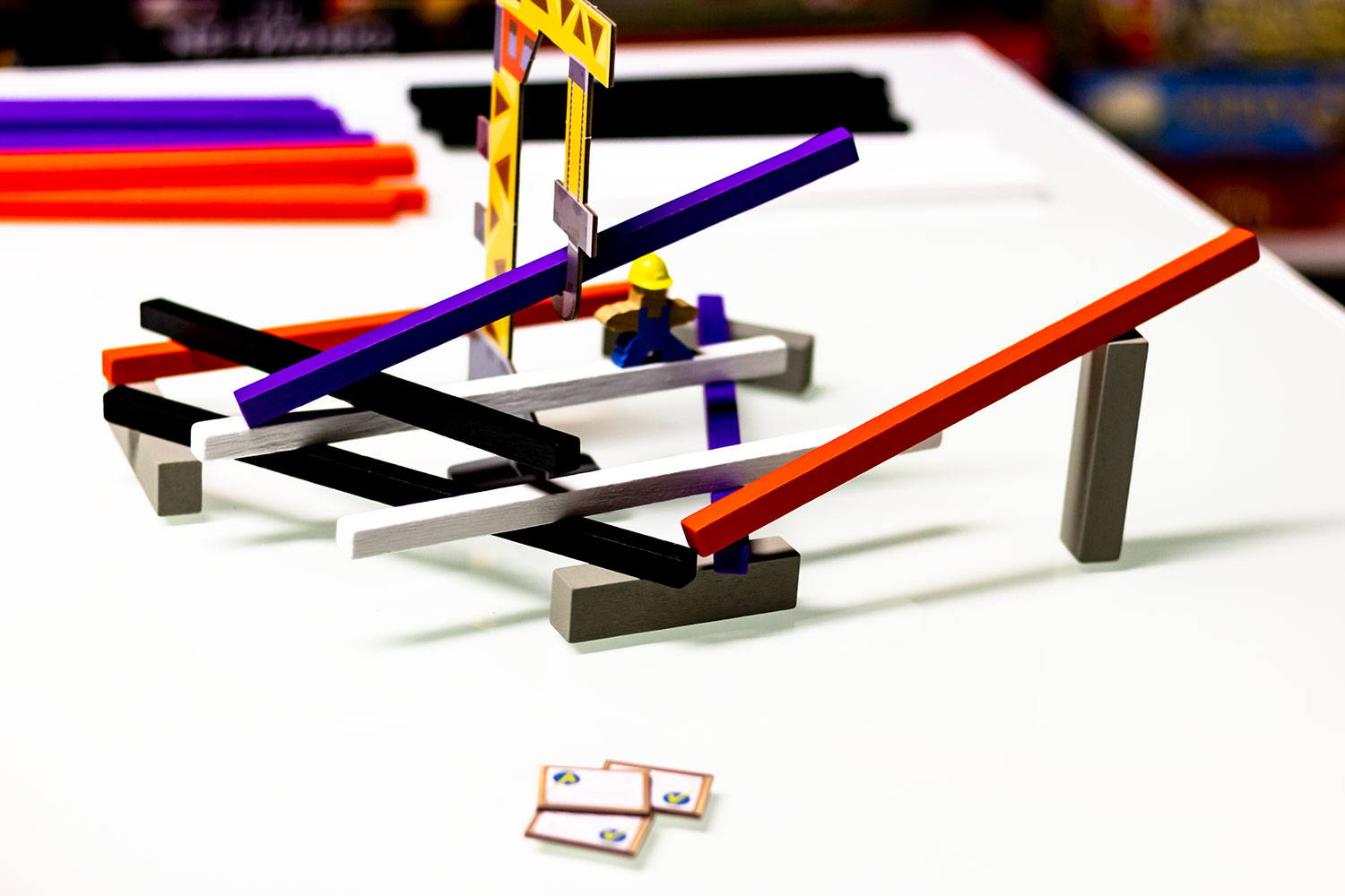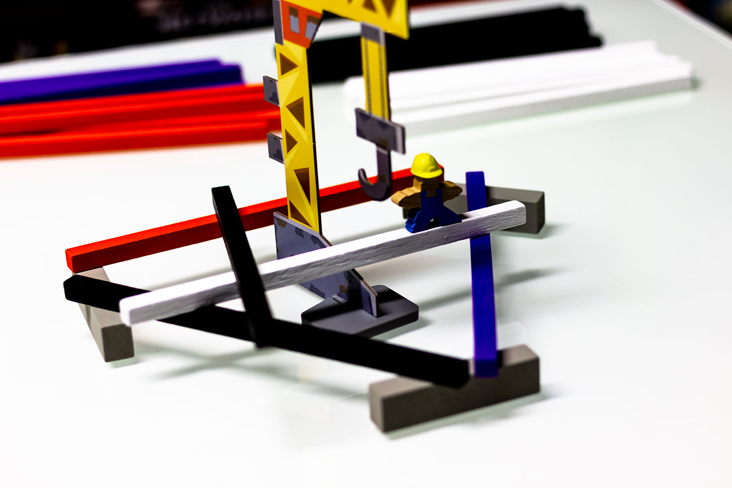 Doch mit dieser Annahme irrt man sich. Durch die Baupläne und die diversen Materialien ergibt sich doch eine komplexere Aufgabe – spätestens, wenn man zum in die Höhe bauen gezwungen ist. Neben einer ruhigen Hand wird hier vor allem räumliches Denkvermögen und Logik gefordert, um das 3D Rätsel zu lösen. Manche zum Start unlösbar erscheinende Aufgabe kann unter umständen recht leicht erfüllt werden. Schwer ist es vor allem für die, die in der Zugreihenfolge weiter hinten stehen. Sind sie an der Reihe, sind die einfachen Lösungen meist schon vergeben. Das Risiko zu scheitern wächst!.