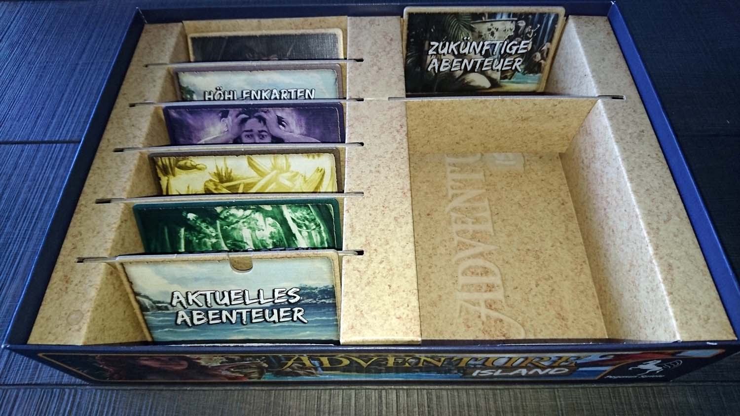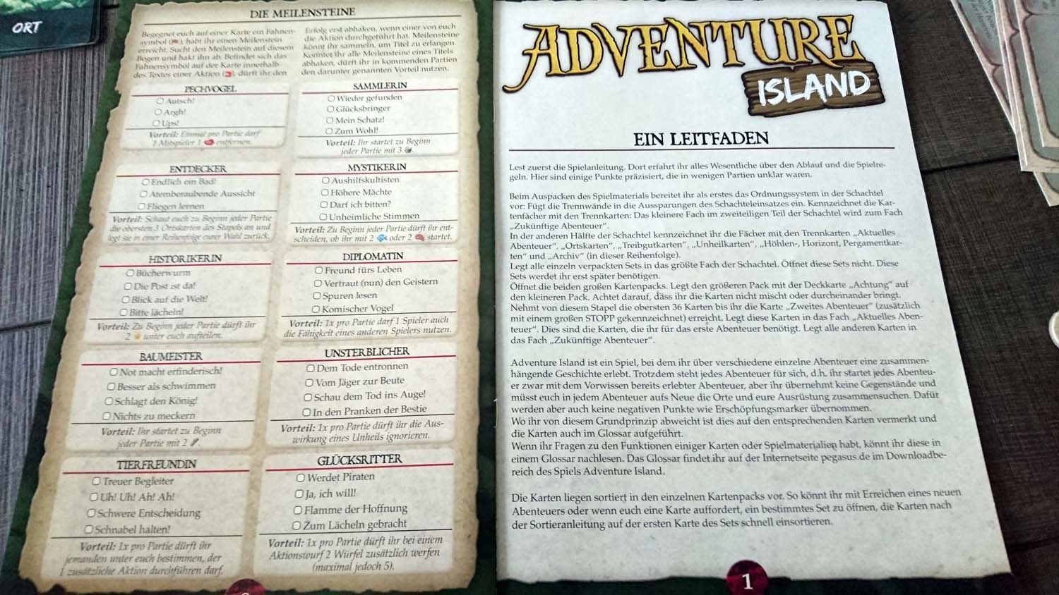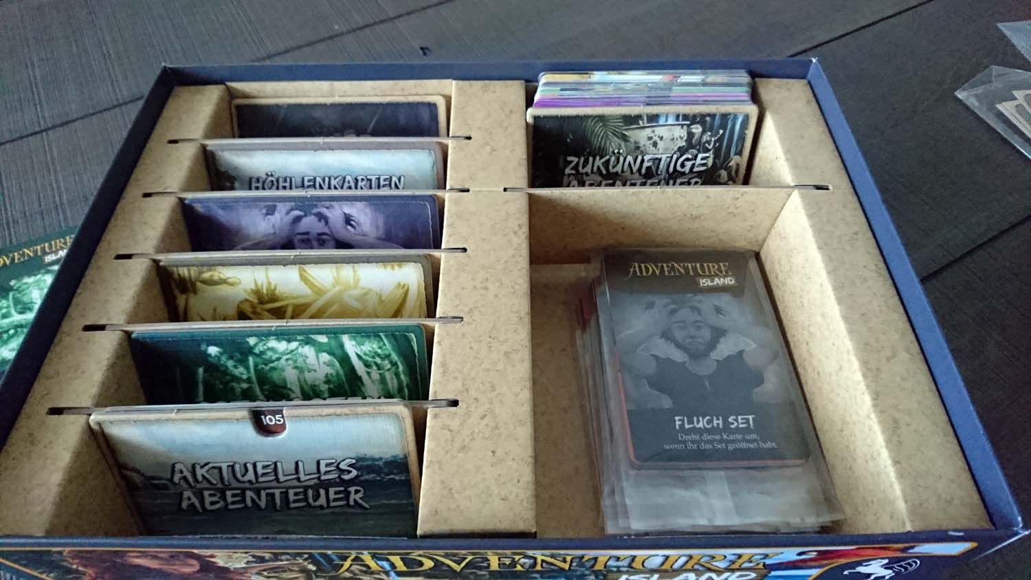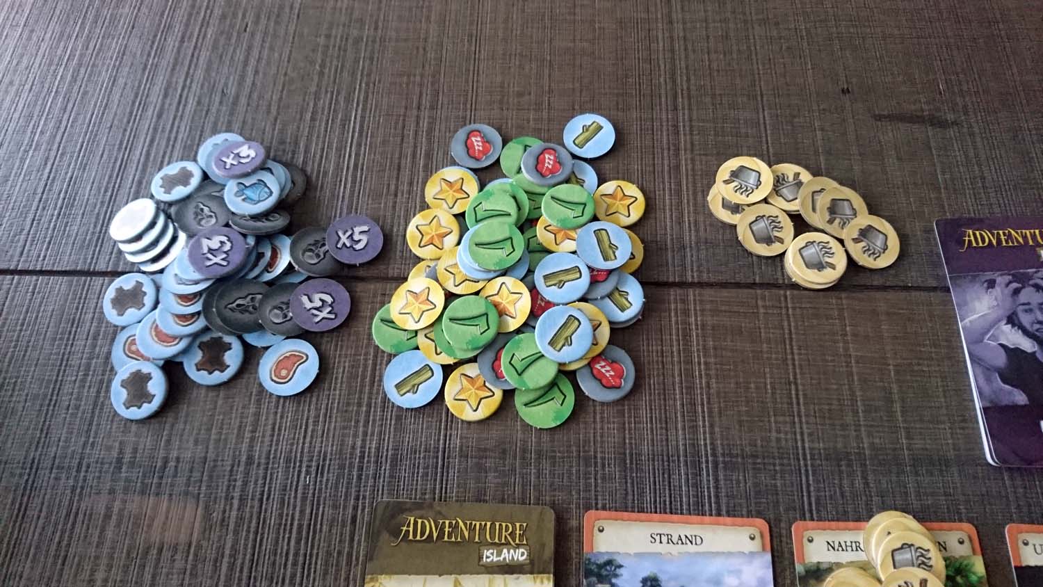 Doch wer bereits nach dem dritten Abenteuer der Meinung ist, dass der Glücksfaktor relativ hoch ist, sollte besser gar nicht erst mit den letzten beiden Partien starten, da die Reihenfolge der Karten in den Nachziehstapeln in diesen noch mehr über Sieg oder Niederlage entscheidet. Pegasus Spiele schreibt im Leitfaden „Im Spiel gibt es keine Situation, die es unmöglich macht, ein Abenteuerziel zu erreichen, auch wenn eine Karte ganz unten im Stapel liegt.“ Dies ist soweit korrekt, allerdings wird in der Regel mehr als eine bestimmte Karte benötigt, um ein Abenteuer zu schaffen, und so reicht es vollkommen aus, wenn 2 von 3 benötigte Karten im unteren Drittel ihres Stapels liegen, um einen Sieg so gut wie unmöglich zu machen. Im letzten Abenteuer ist dies besonders drastisch und die Mechanik wirft den Spielern Aufgabe um Aufgabe vor die Füße. Wurde voller Stolz eine Aufgabe geschafft, wird der nächste Batzen hingeknallt. Das ist weder kreativ noch herausfordernd. Für uns war im Finale irgendwann der Punkt erreicht, an dem wir das Spiel genervt und gefrustet abgebrochen haben. Ich habe wirklich nichts gegen fordernde Spiele und habe sowohl bei „7th Continent“, „The Last Expedition“ als auch bei „Kingdom: Death Monster“ kein Problem damit, Niederlagen einzustecken. Doch bei „Adventure Island“ geht spätestens mit dem dritten Abenteuer das Balancing komplett über Bord und aus Spielspaß wird Kartenziehfrust.