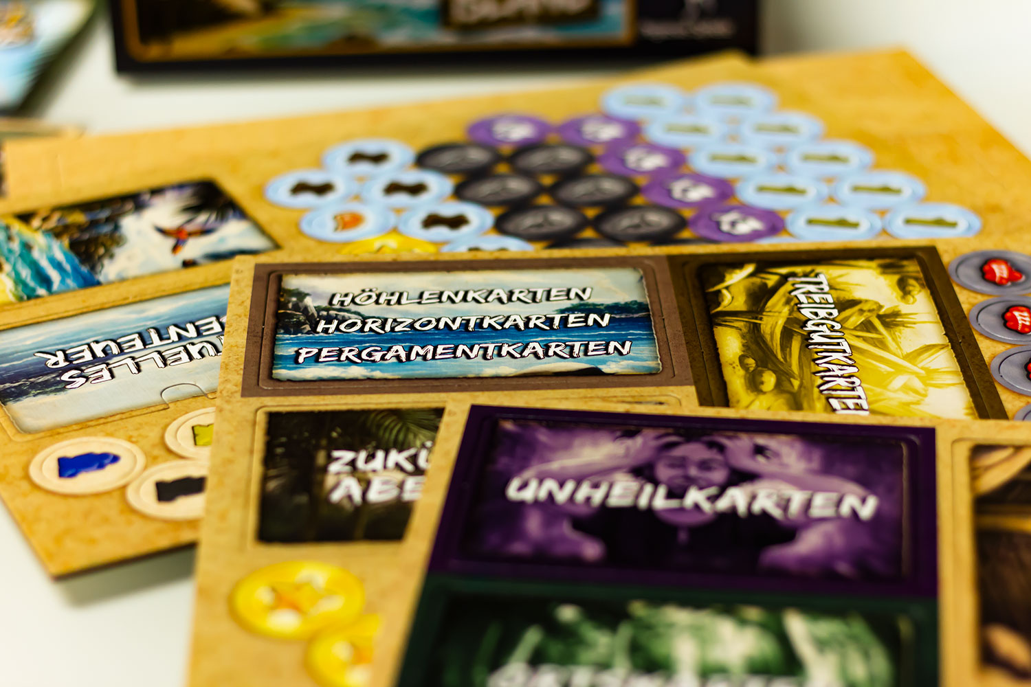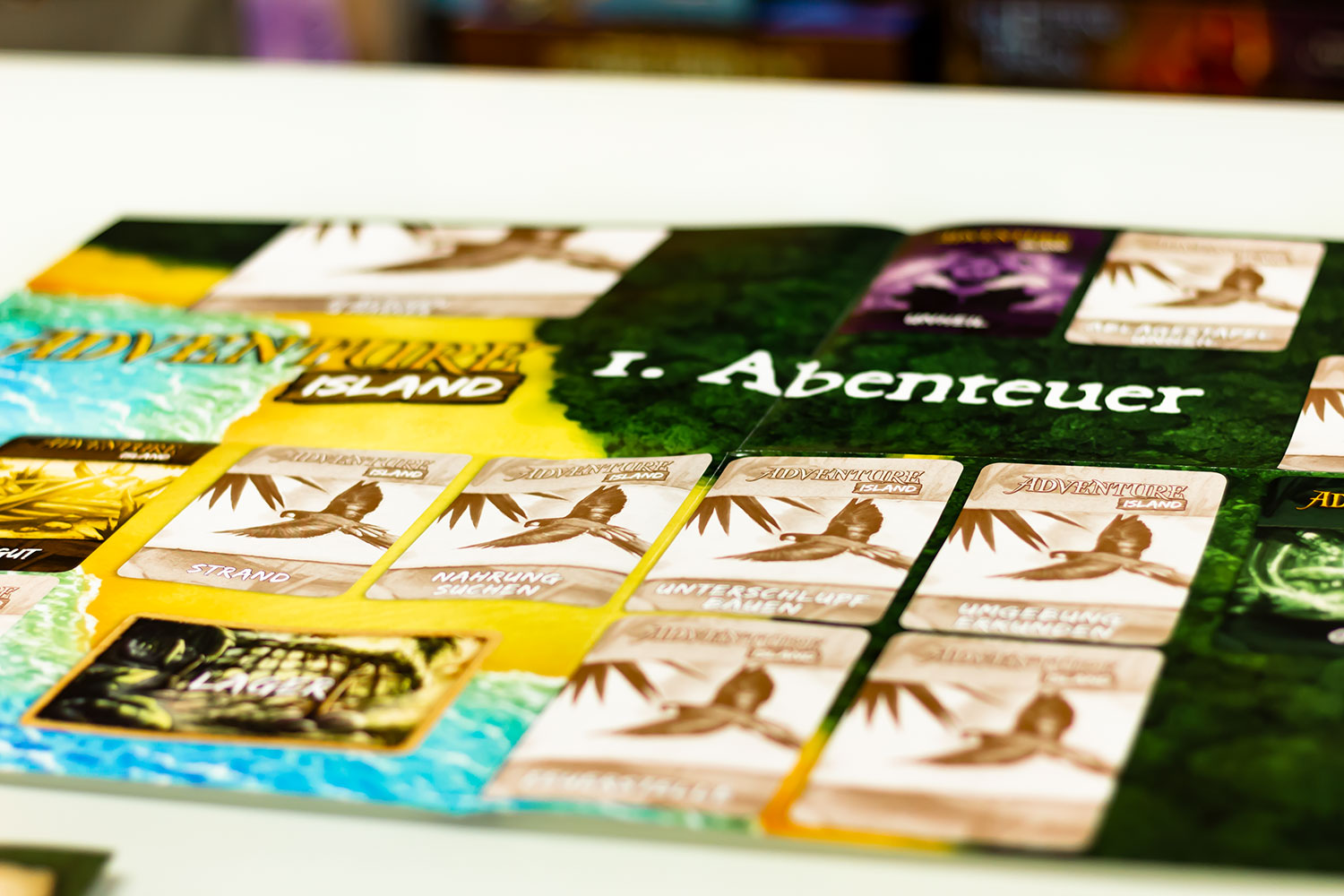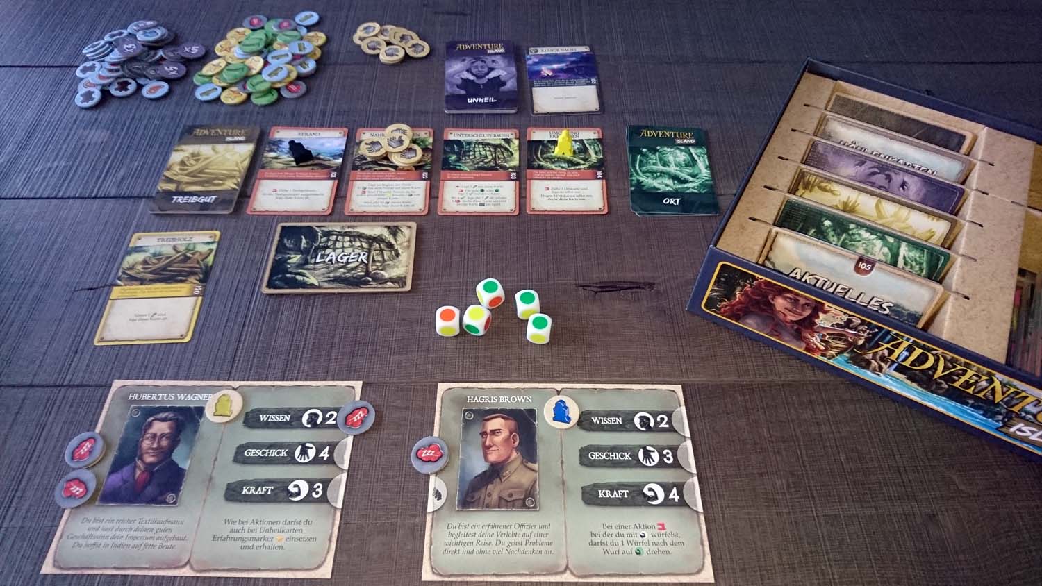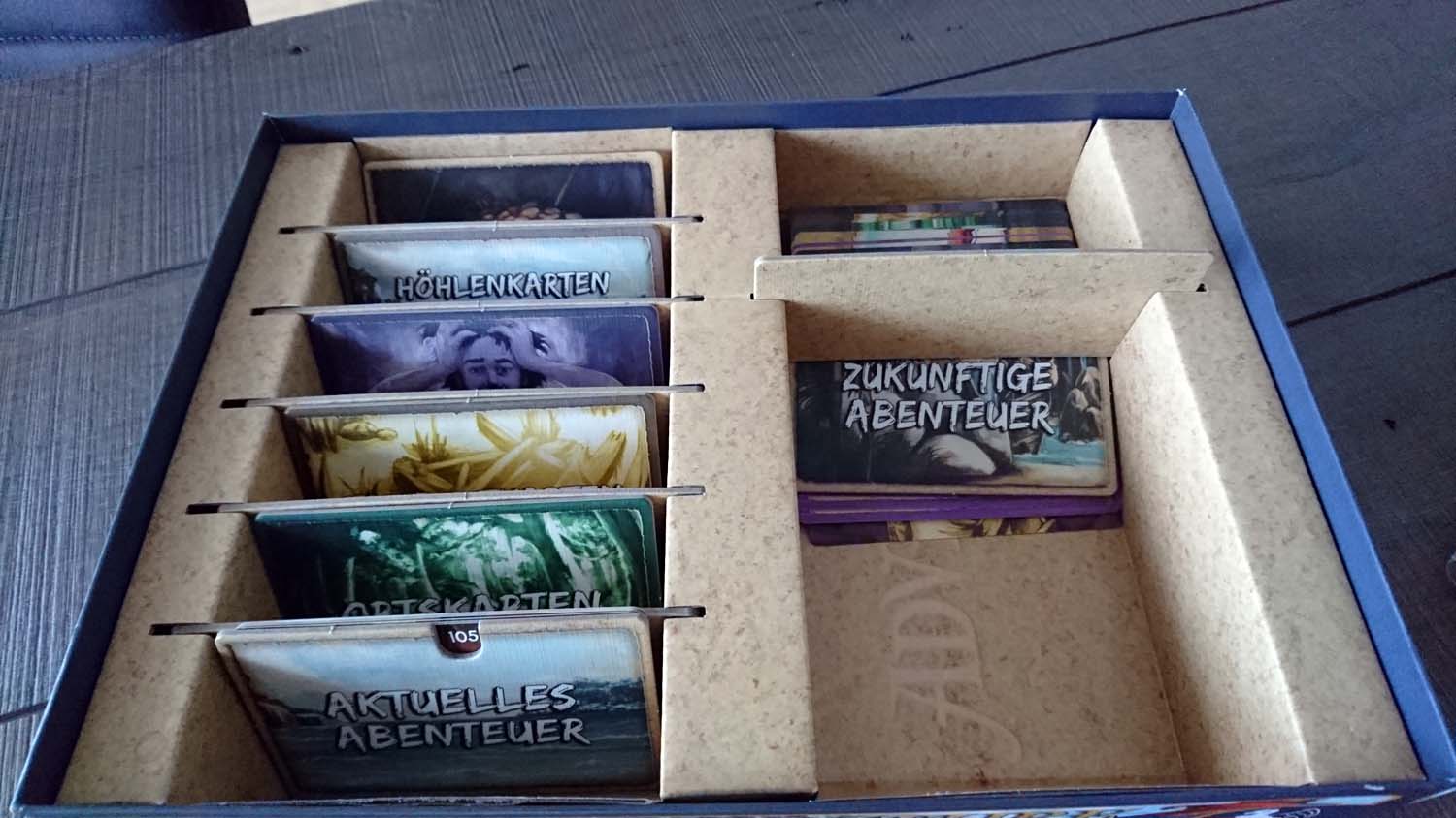 Doch wer bereits nach dem dritten Abenteuer der Meinung ist, dass der Glücksfaktor relativ hoch ist, sollte besser gar nicht erst mit den letzten beiden Partien starten, da die Reihenfolge der Karten in den Nachziehstapeln in diesen noch mehr über Sieg oder Niederlage entscheidet. Pegasus Spiele schreibt im Leitfaden „Im Spiel gibt es keine Situation, die es unmöglich macht, ein Abenteuerziel zu erreichen, auch wenn eine Karte ganz unten im Stapel liegt.“ Dies ist soweit korrekt, allerdings wird in der Regel mehr als eine bestimmte Karte benötigt, um ein Abenteuer zu schaffen, und so reicht es vollkommen aus, wenn 2 von 3 benötigte Karten im unteren Drittel ihres Stapels liegen, um einen Sieg so gut wie unmöglich zu machen. Im letzten Abenteuer ist dies besonders drastisch und die Mechanik wirft den Spielern Aufgabe um Aufgabe vor die Füße. Wurde voller Stolz eine Aufgabe geschafft, wird der nächste Batzen hingeknallt. Das ist weder kreativ noch herausfordernd. Für uns war im Finale irgendwann der Punkt erreicht, an dem wir das Spiel genervt und gefrustet abgebrochen haben. Ich habe wirklich nichts gegen fordernde Spiele und habe sowohl bei „7th Continent“, „The Last Expedition“ als auch bei „Kingdom: Death Monster“ kein Problem damit, Niederlagen einzustecken. Doch bei „Adventure Island“ geht spätestens mit dem dritten Abenteuer das Balancing komplett über Bord und aus Spielspaß wird Kartenziehfrust.