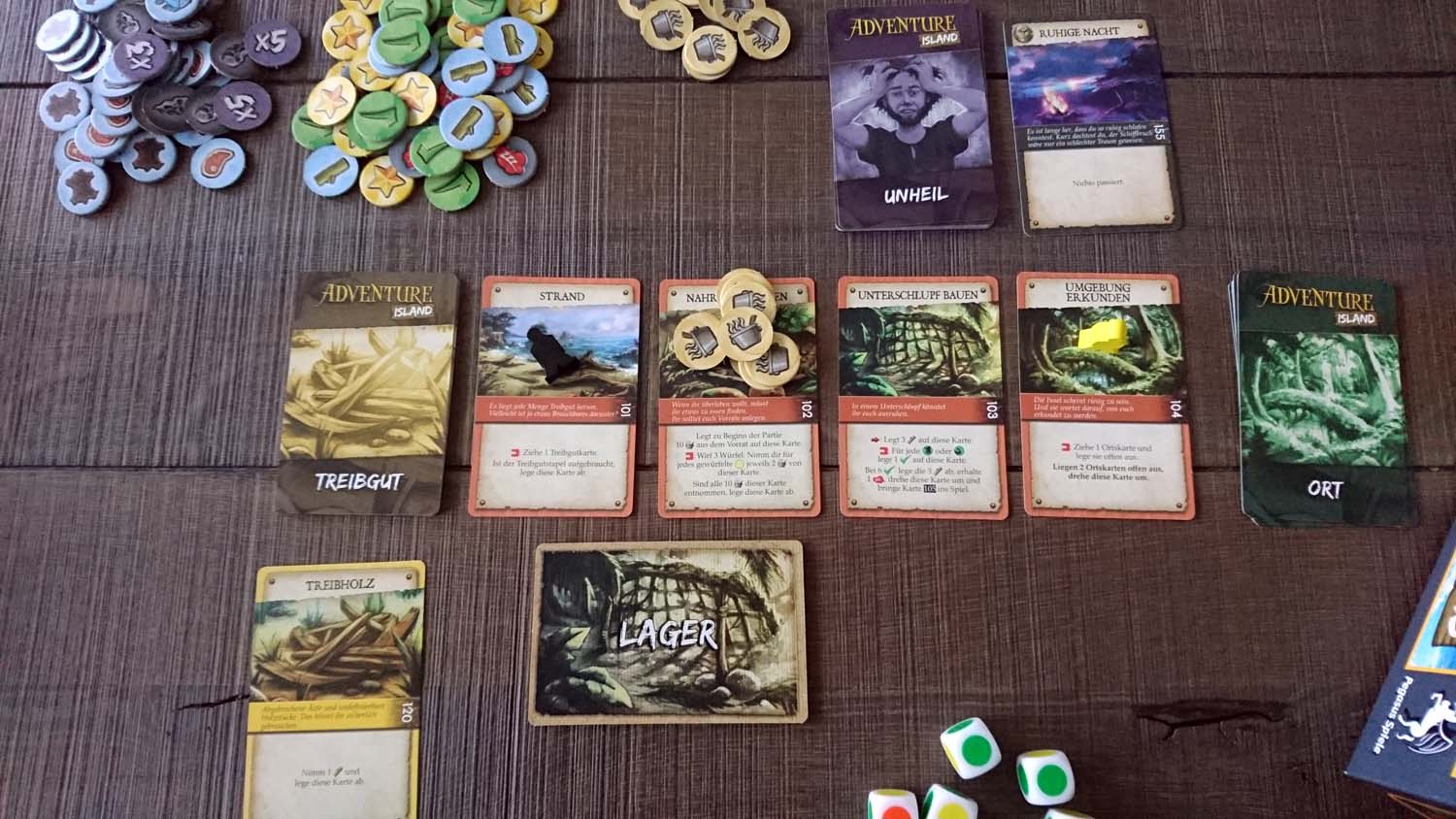 Beim Wechsel vom zweiten zum dritten Abenteuer gibt es dann allerdings Änderungen, die das Schiff kräftig vom Kurs abbringen und es mitten in einen Orkan steuern. Es stellte sich bei mir und meinen Mitspielern das Gefühl ein, dass bei dem Spiel so einiges in die falsche Richtung läuft. Dass man als Schiffbrüchiger auf einer einsamen Insel erst einmal seine Umgebung erkunden muss und sich Handwerkszeug beschafft, ist ohne Frage selbstverständlich. Warum ich dann allerdings bei jedem einzelnen Abenteuer so gut wie keinen Ort mehr kenne außerhalb des eigenen Lagers und warum ich zu blöd bin, das wenige bisschen, dass ich an Ausrüstung habe zusammenzuhalten, ist mir nicht nur ein Rätsel, sondern zudem auch ein massiver Verlust bei der Atmosphäre des Spiels. Dass ich immer wieder Fernrohr, Axt und was ich sonst noch mühevoll gefunden hatte, neu suchen muss, will mir einfach nicht einleuchten. Da kann Pegasus Spiele noch so beschwichtigend im Leitfaden schreiben, dass jedes Abenteuer nun mal ohne Ausrüstung anfängt und man sich im Dschungel nicht so gut zurechtfindet, wie in seinem Wohnviertel, überzeugt hat mich das kein bisschen. Entweder erzählt man eine durchgängige Geschichte oder man lässt es sein. Notfalls muss am Ende eines Abenteuers eben erzählerisch ein Grund gefunden werden, warum alles wieder auf Null steht, aber zu sagen, dass es so ist, nehmt es hin, fördert nicht gerade den Spaß beim Spiel. Hinzu kommt, dass das Spiel ab dem dritten Abenteuer so drastisch vom Glücksfaktor hinsichtlich der Lage einzelner Karten in den Decks abhängt, dass eine einzige Karte den Unterschied zwischen Sieg und Niederlage ausmachen kann. In zwei aufeinanderfolgenden Spielen hatten wir das Pech, dass der Orts- und der Treibgutstapel so ungünstig gemischt waren, dass wir kaum eine Chance hatten, das Szenario zu schaffen. Beim dritten Anlauf hatten wir dann per Hausregel eine Mischregel für den Ortsstapel festgelegt und tatsächlich hat eine einzige Karte dann den Unterschied ausgemacht. Wo wir zuvor immer wieder erfolglos hauptsächlich auf der Suche nach einer bestimmten Karte waren, konnten wir uns nun wichtigen Dingen widmen und das Abenteuer fühlte sich wieder fair und machbar an. Das hat mit ausgewogenem Balancing dann allerdings nicht mehr viel zu tun.