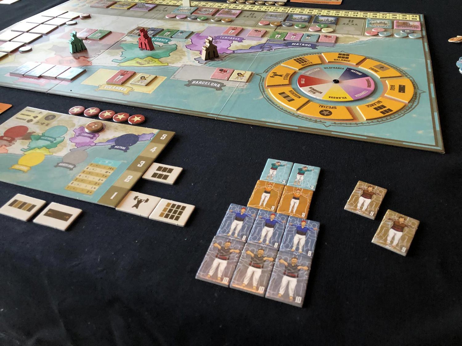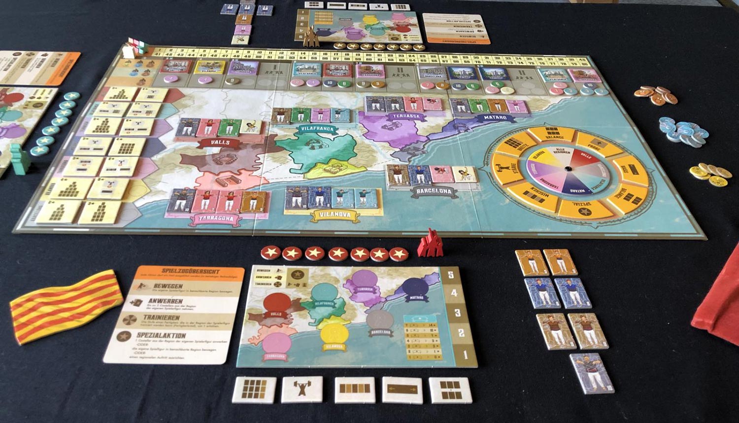 Der Spielplan zeigt sieben Regionen Kataloniens. In diese Regionen werden jeweils „spieleranzahlabhängig“ Castellers-Plättchen verteilt. Diese Plättchen zeigen jeweils eine Person und eine Zahl zwischen eins und zehn. Auf dem Spielplan ist zudem ein Fertigkeitsrad zu sehen. Über dem Fertigkeitsrad werden die acht Fertigkeiten zufällig verteilt und der Festivalkalender wird erstellt. Der Festivalkalender bestimmt in welcher Spielrunde an welchem Ort ein Festival stattfindet und welche Castellers daran beteiligt sein müssen. Zudem bekommt jede Region noch zwei einzigartige Auftragsplättchen zugwiesen.