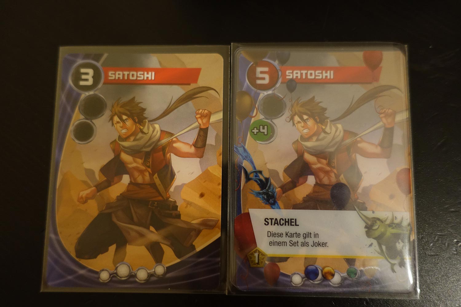 Nun aber zu der wirklich wichtigen Frage: Wie funktioniert das Karten-Crafting-Spiel überhaupt? Zunächst machte Custom Heroes einen komplexen Eindruck auf mich, doch je weiter ich im Regelwerk las desto mehr fühlte ich mich an ein Stichspiel erinnert, welches in meiner Region Deutschlands als A****loch bekannt ist. Die Spieler werfen dabei der Reihe nach Skatkarten von der Hand und versuchen die vorhergelegten zu übertrumpfen, um letztlich den Stich zu gewinnen und neu anspielen zu dürfen. Wer als letztes seine Karten loswird, ist das A****loch und muss neu austeilen. Ähnlich funktioniert Custom Heroes auch. Nach jeder Runde werden jedoch Siegpunkte, Powermarker und Craftingkarten verteilt, die sich auf den Verlauf einer Partie auswirken. Hat man beispielsweise eine 3 und 7 auf der Hand, kann man durch einen Kniff die 3 um vier Punkte aufwerten und so zwei Siebenen spielen. Andere Modifikationen erlauben es, eine Karte zu verdoppeln, eine Karte als Joker zu spielen oder Wertungsreihenfolge umzudrehen, sodass nun niedrigere Karten höhere trumpfen. Um eine Karte aufzuwerten, wird die Modifikation lediglich in die Hülle geschoben und schon führt Satoshi ein Schwert. Seht selbst: