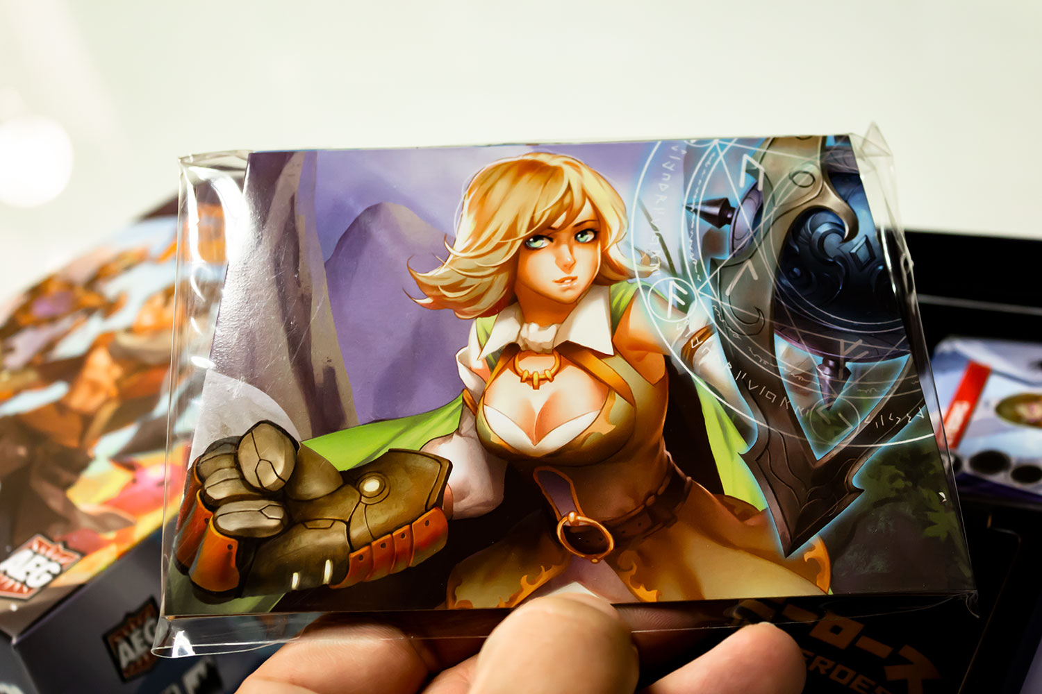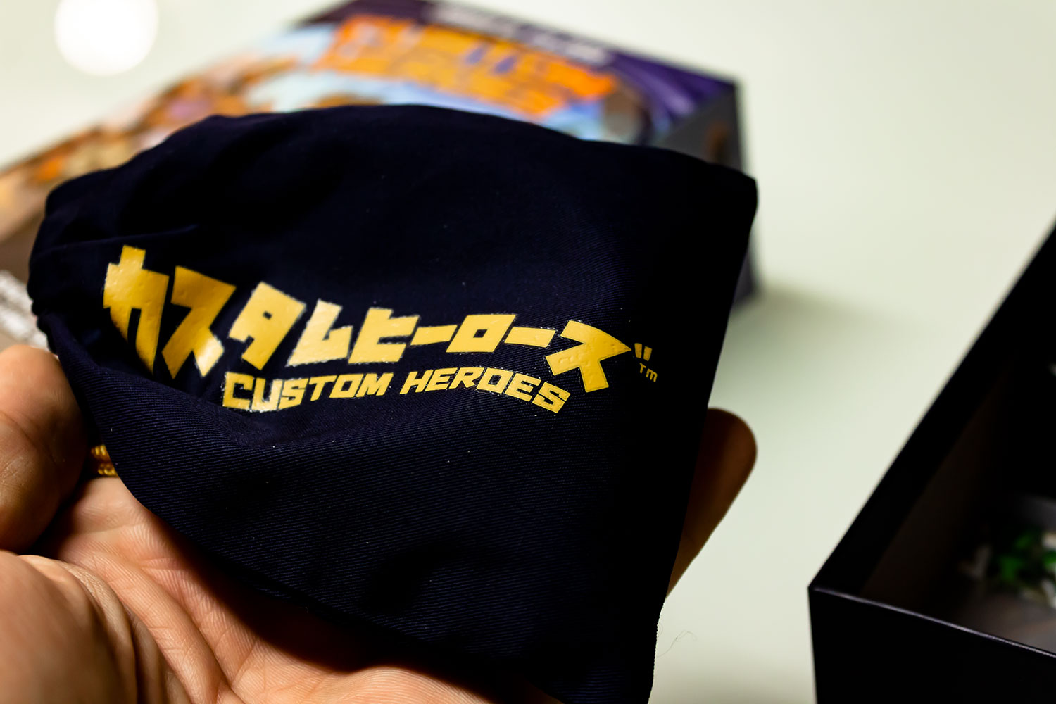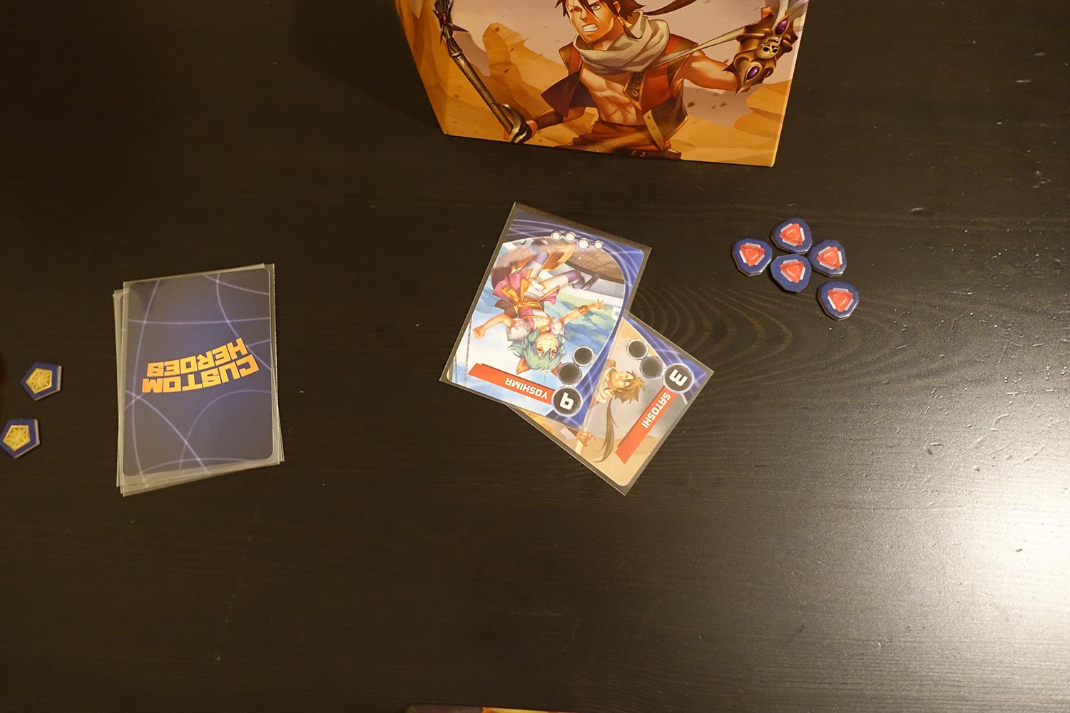 Custom Heroes kommt in einer kleinen aber hochwertig gestalteten Schachtel. Die Materialien wirken sauber verarbeitet, insbesondere die 60 Charakterkarten in durchsichtigen Hüllen sowie 84 Craftingkarten wirken robust. Zusätzlich enthält die Box einen Stoffbeutel für Marker/Karten, Sichtschutze sowie einige Reservehüllen. Insgesamt wirkt das Material klar und übersichtlich und ist von Grafiker Matt Paquette detailreich gestaltet. Ob der Zeichenstil aber den Geschmack trifft liegt bekanntlich im Auge des Betrachters… Mir persönlich betont der japanisch angehauchte Stil zu sehr die weibliche Oberweite. Außerdem wäre ein zweiter Beutel wäre schön gewesen, da sich so Chips und Karten abwechselnd einen teilen müssen.