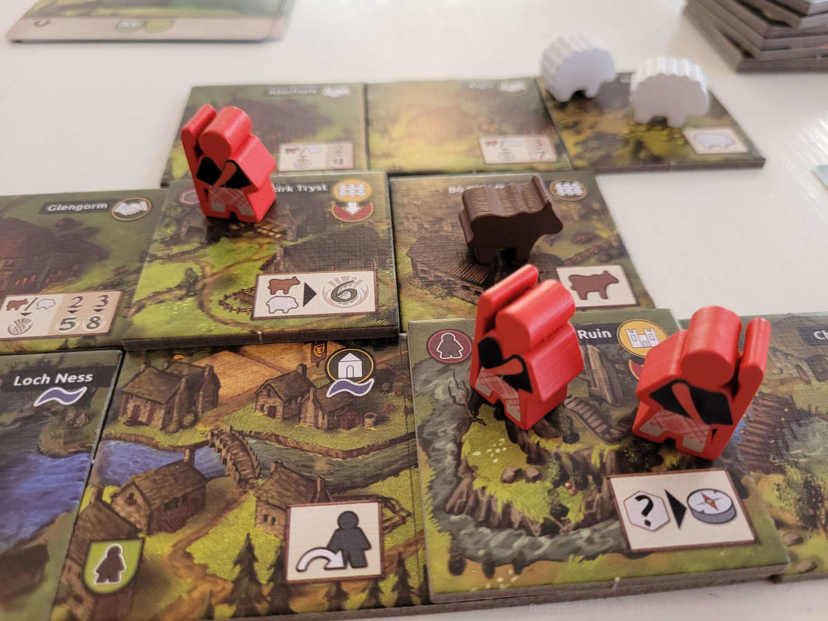 Auf Grund der Lage der Plättchen und der vermuteten Strategien meiner Mitspieler verlegte ich mich auf die Whiskey-Produktion. Getrunken wird immer, ein Getreidefeld hatte ich in meiner Anfangsphase ohne Plan bereits geholt und eine Destillerie lag in Schrittweite aus. Als zweites Standbein wählte ich später noch die Schlachterei, da ich – wie Andreas von Funtails sie liebevoll nannte – einige McMuhs und McMähs angesammelt hatte und diese gerne in Siegpunkte umwandeln wollte. Das hört sich zunächst zwar nicht sonderlich tierlieb an, aber da es sich bei dem Schlachtgut um Holzmeeples handelte, war zum Glück genügend Distanz zur Realität gegeben. Ein wenig Energie setzte ich dann noch auf das Bootsrennen, das während des Spiels als Chronik startete und einmal quer über alle schottischen Reiche führte. Nach rund 2 Stunden Spielzeit, die wie im Flug vergingen, war ich zufrieden mit meiner Leistung im schottischen Hochland.