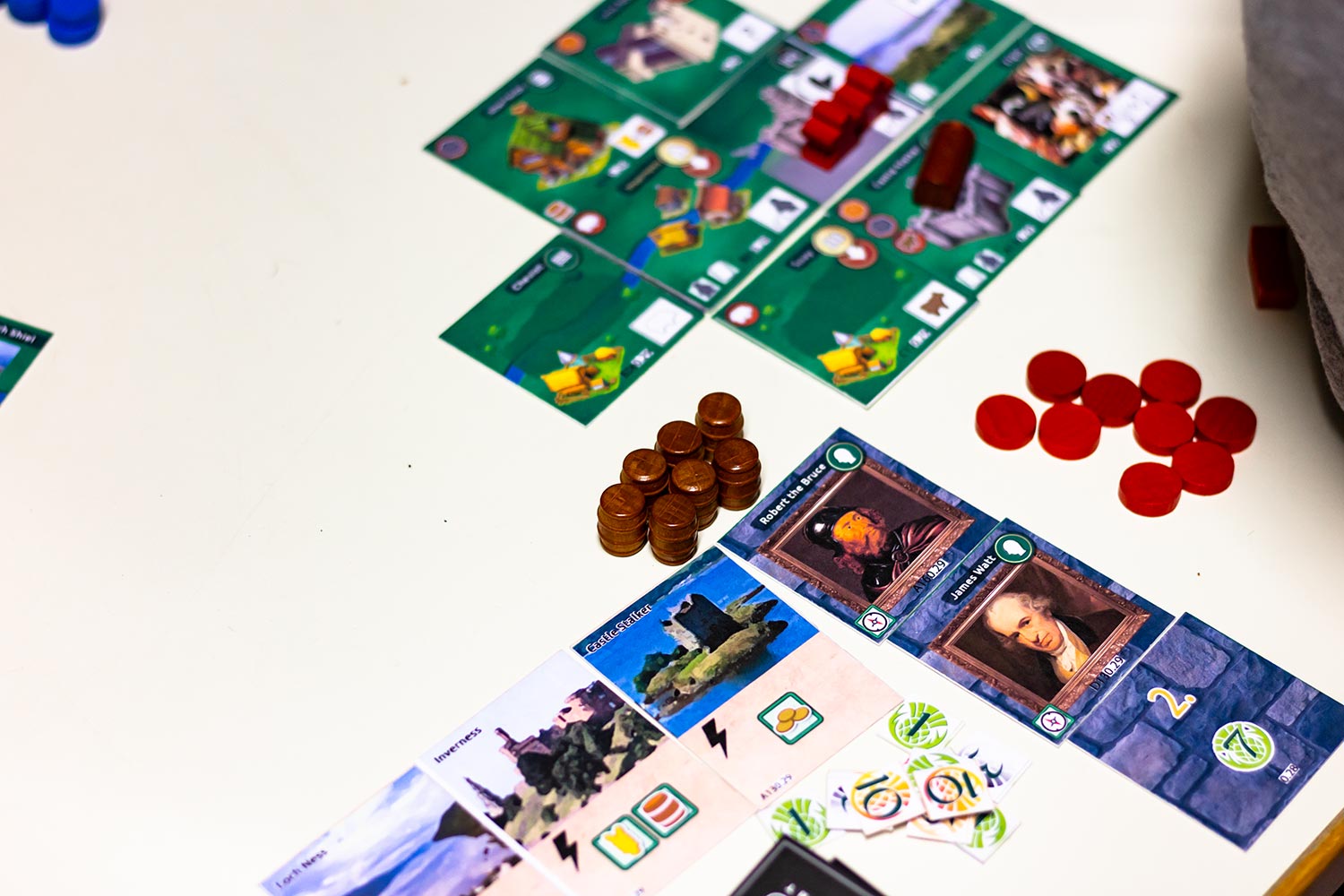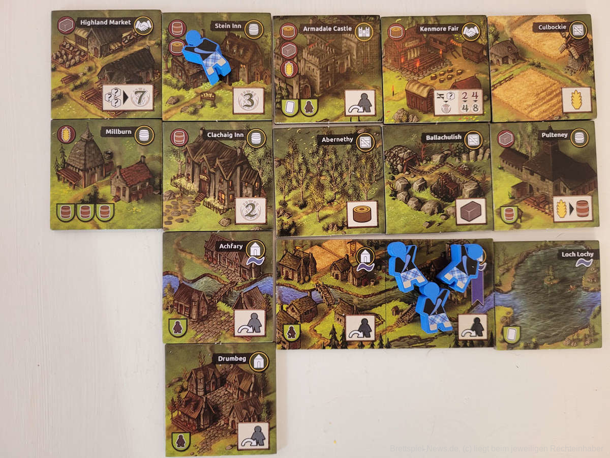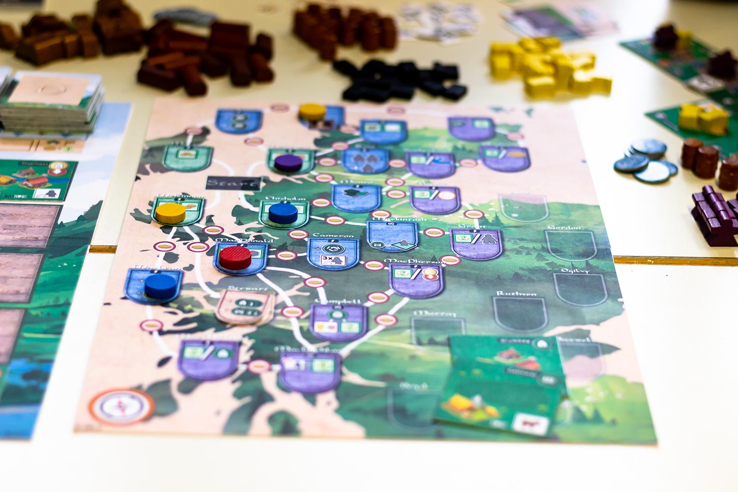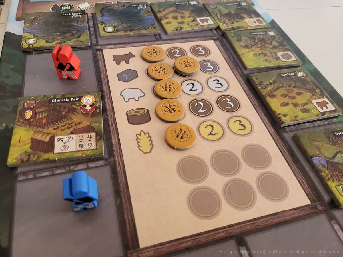 Da ich bislang von „Glen More“ zwar gehört, es selbst aber noch nicht gespielt hatte, ging ich recht unbelastet an das Spiel des Prototypens heran. In den ersten 1-2 Runden musste ich mich zwar erst mal ein wenig in die Mechanik einfinden. Wie etwa was wann aktiviert wird, worauf zu achten ist beim Anlegen der Plättchen oder auf welche Fähigkeiten, welchen schottischen Edelmannes ich meine Marker setzen sollte, auf der Tafel mit den Belohnungen. Danach war ich schnell im Spiel und konnte mich zeitnah mit möglichen Strategien vertraut machen, die mir hoffentlich ganz viele Siegpunkte bringen würden.