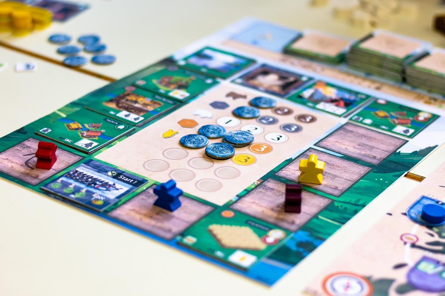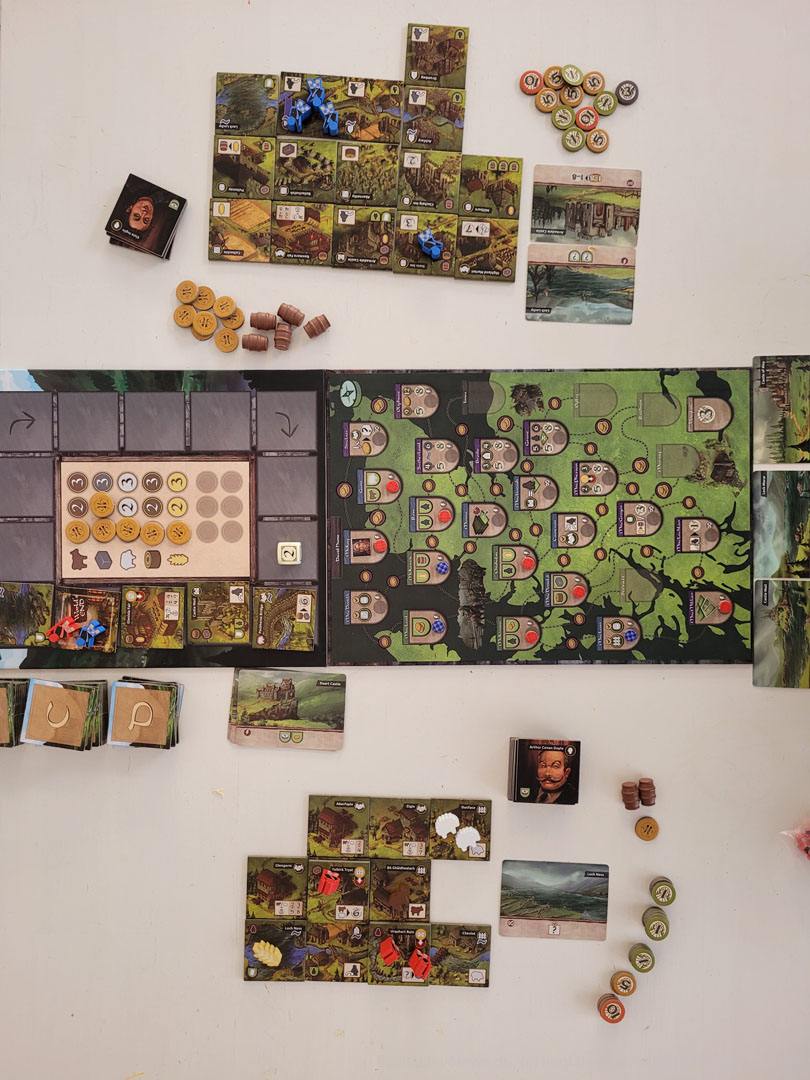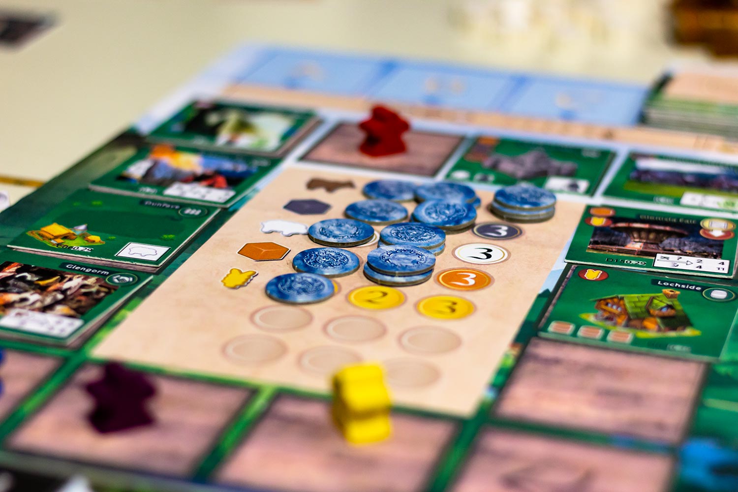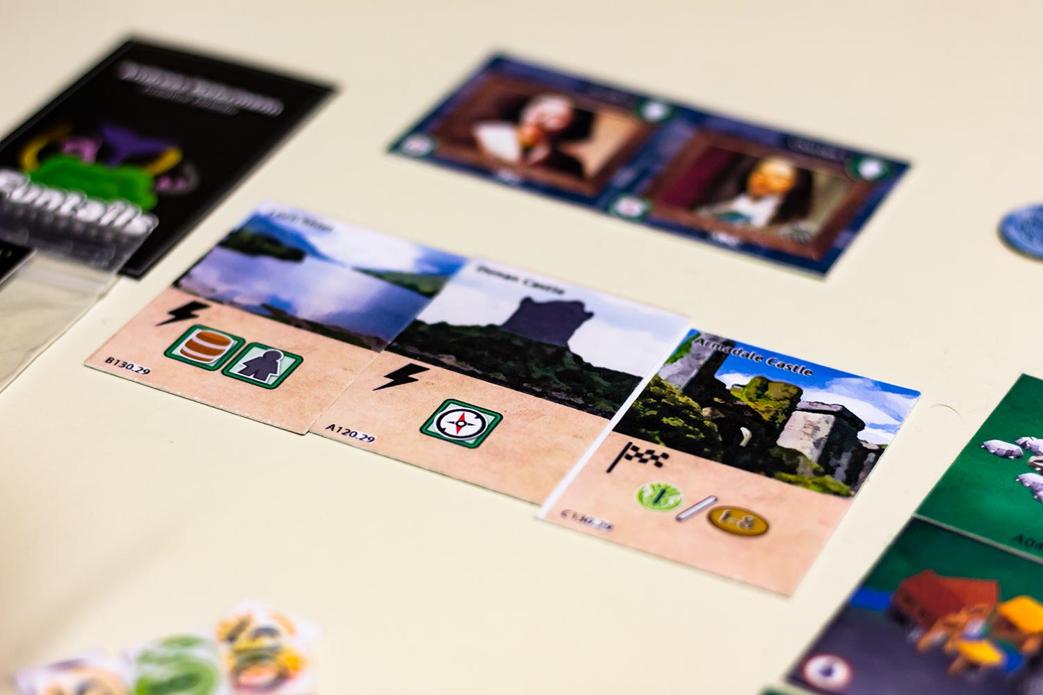 Da ich bislang von „Glen More“ zwar gehört, es selbst aber noch nicht gespielt hatte, ging ich recht unbelastet an das Spiel des Prototypens heran. In den ersten 1-2 Runden musste ich mich zwar erst mal ein wenig in die Mechanik einfinden. Wie etwa was wann aktiviert wird, worauf zu achten ist beim Anlegen der Plättchen oder auf welche Fähigkeiten, welchen schottischen Edelmannes ich meine Marker setzen sollte, auf der Tafel mit den Belohnungen. Danach war ich schnell im Spiel und konnte mich zeitnah mit möglichen Strategien vertraut machen, die mir hoffentlich ganz viele Siegpunkte bringen würden.