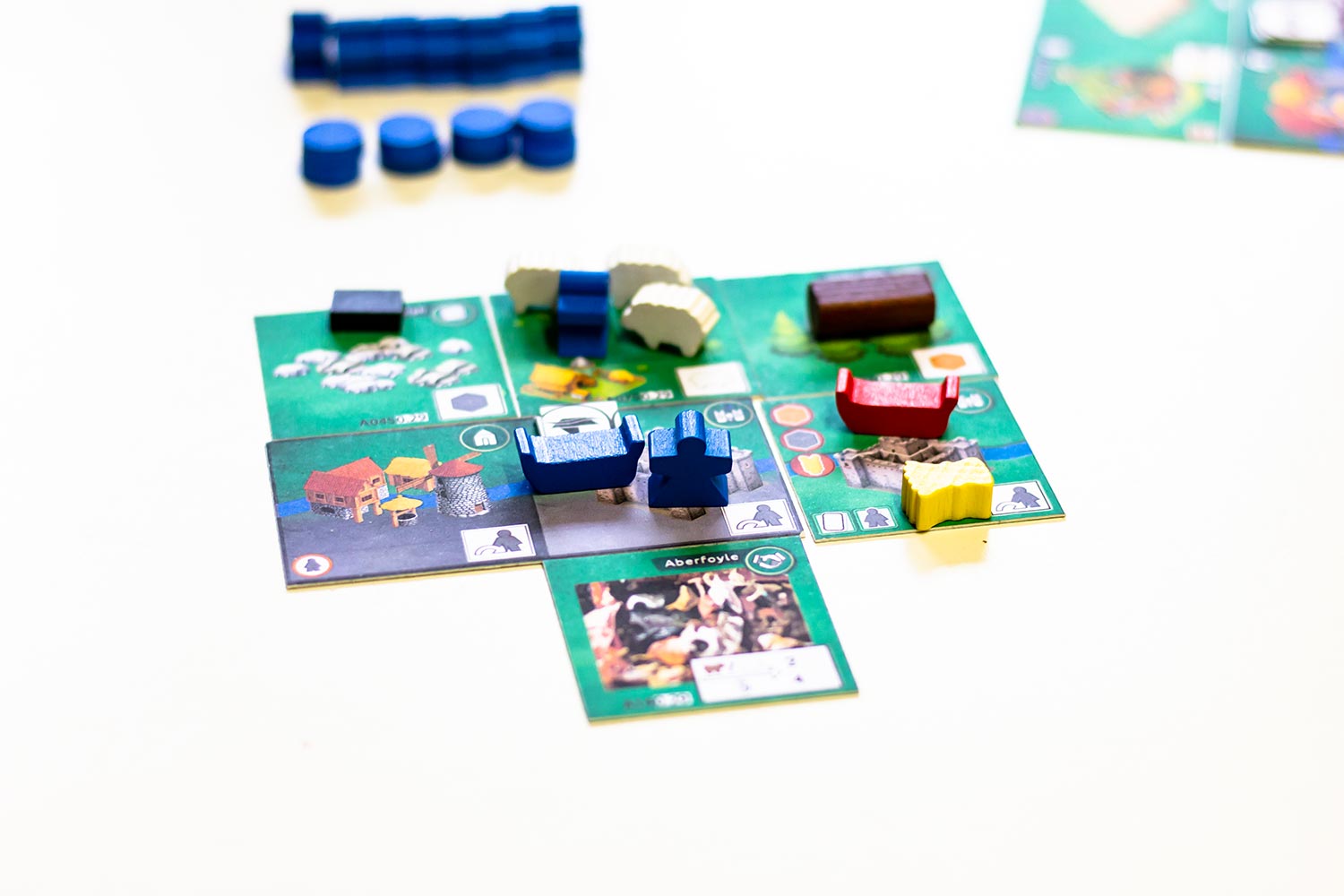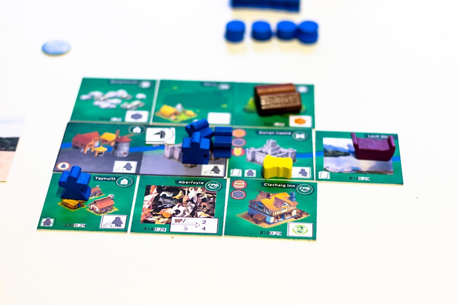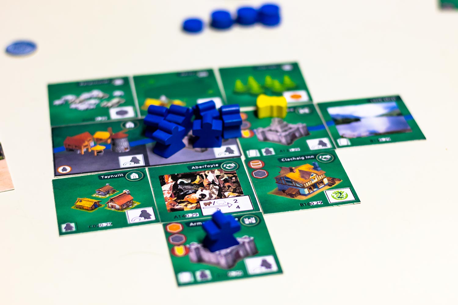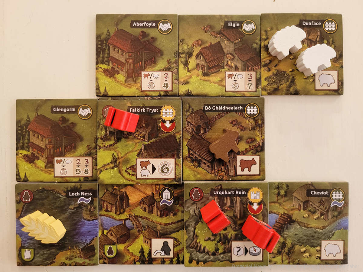Wer sich auf ein Plättchen setzt, muss dieses bezahlen können. Das Plättchen wird in das eigene Reich eingebaut und alle angrenzenden Plättchen werden einmal aktiviert. Dabei gibt es Gebäude, die Rohstoffe (Korn, Holz, Kühe, Schafe und Stein) erzeugen. Es gibt weiterverarbeitende Gebäude, wie Schlachthöfe (generieren Siegpunkte) oder Brennereien, die schottischen Whisky produzieren und viele mehr.
