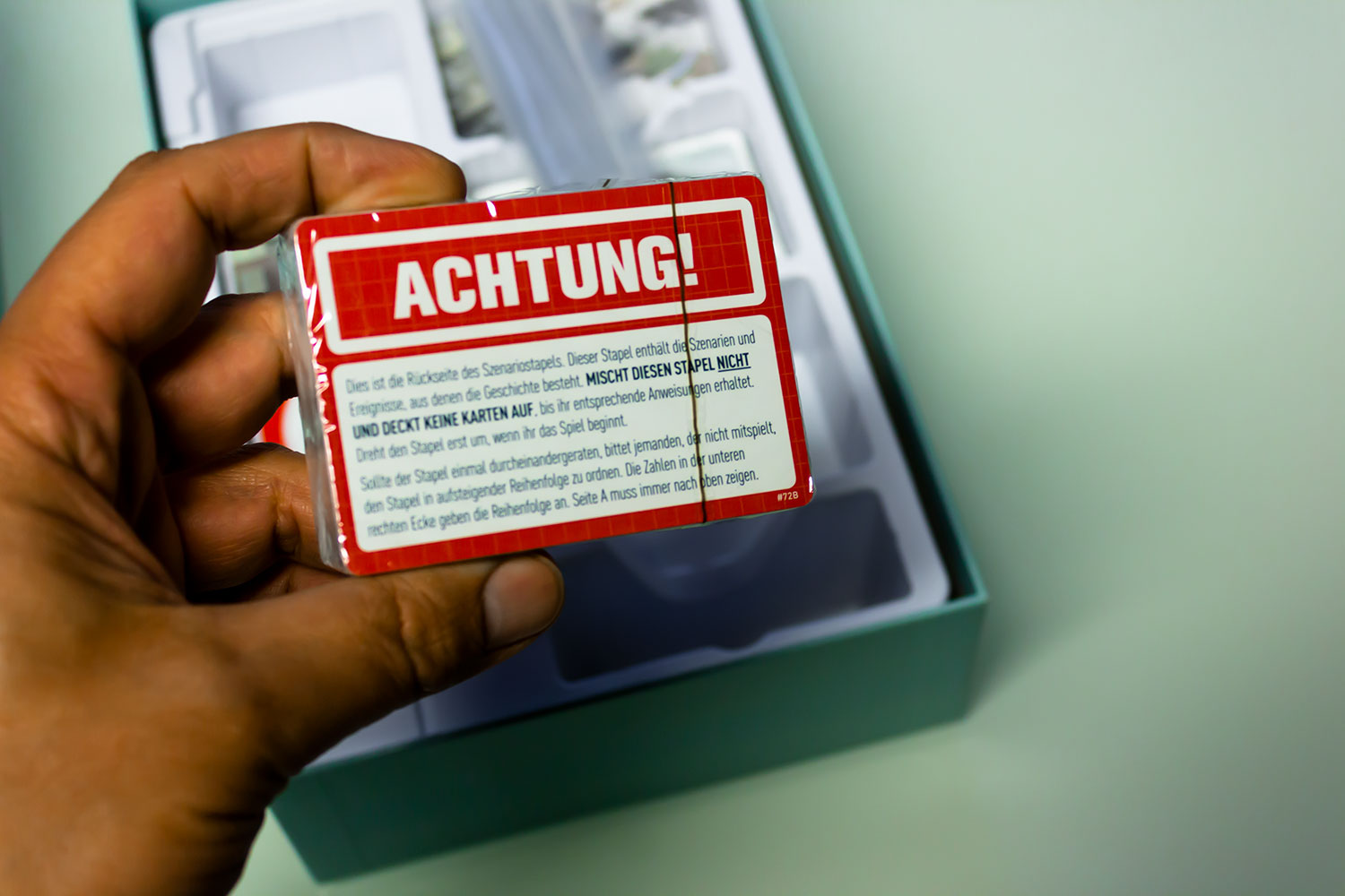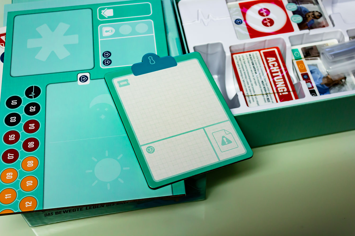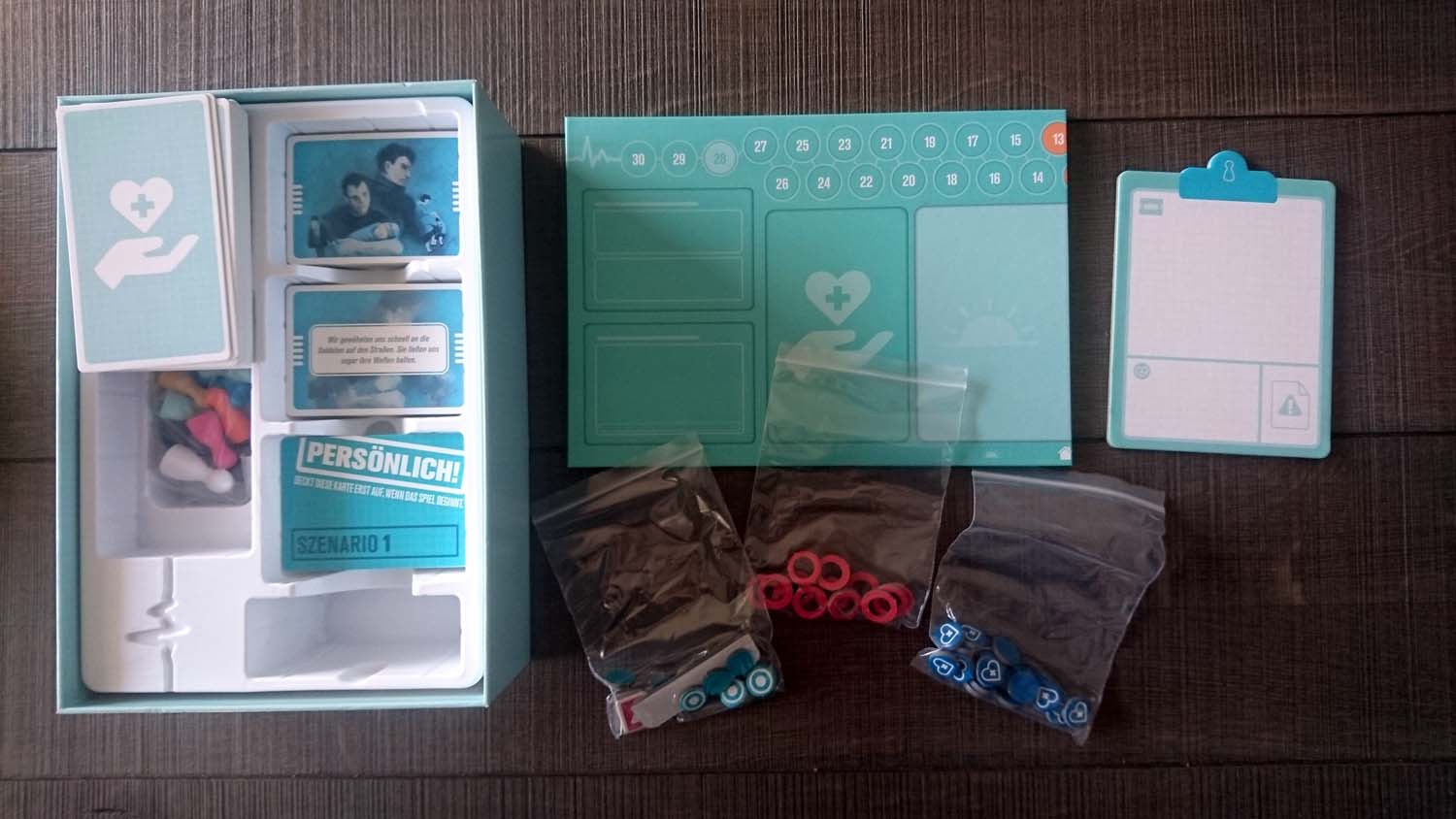 Das Material macht einen überwiegend guten Eindruck. Im Karton ist ein Plastiksortiersystem, in dem das gesamte Spielmaterial problemlos verstaut werden kann. Das Spielbrett und das Brett für den Schichtleiter sind aus festem Karton gefertigt. Die einzelnen Marker sind zwar ebenfalls relativ stabil, allerdings hat sich bei mir beim Auspöppeln teilweise die Druckschicht vom Karton gelöst, weswegen ich diese wieder aufkleben musste. Die Figuren für das Pflegeteam sind aus Holz gefertigt. Die einzelnen Karten sind stabil und widerstandsfähig.