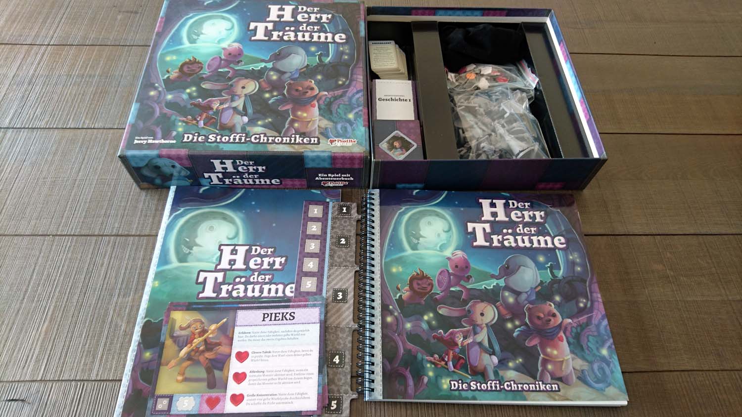 “Der Herr der Träume“ ist ein kooperatives Spiel, in dem bis zu 4 Spieler in die Rolle von Stofftieren schlüpfen, die in der Geschichte liebevoll Stoffis genannt werden und den Schlaf eines kleinen Mädchens beschützen. Gespielt werden 7 Geschichten, die jeweils in einzelne Kapitel unterteilt sind. Der Clou beim Spielen der einzelnen Kapitel ist, dass der Spielplan auf der linken Seite des dicken Geschichtenbuchs abgebildet ist und auf der rechten Seite die Informationen und Ereignisse stehen. Sobald ein Ziel erreicht wurde und es zum nächsten Kapitel weiter geht, werden die Spielfiguren von der Seite genommen und es wird zur angegebenen Seite umgeblättert und dort weitergespielt.
