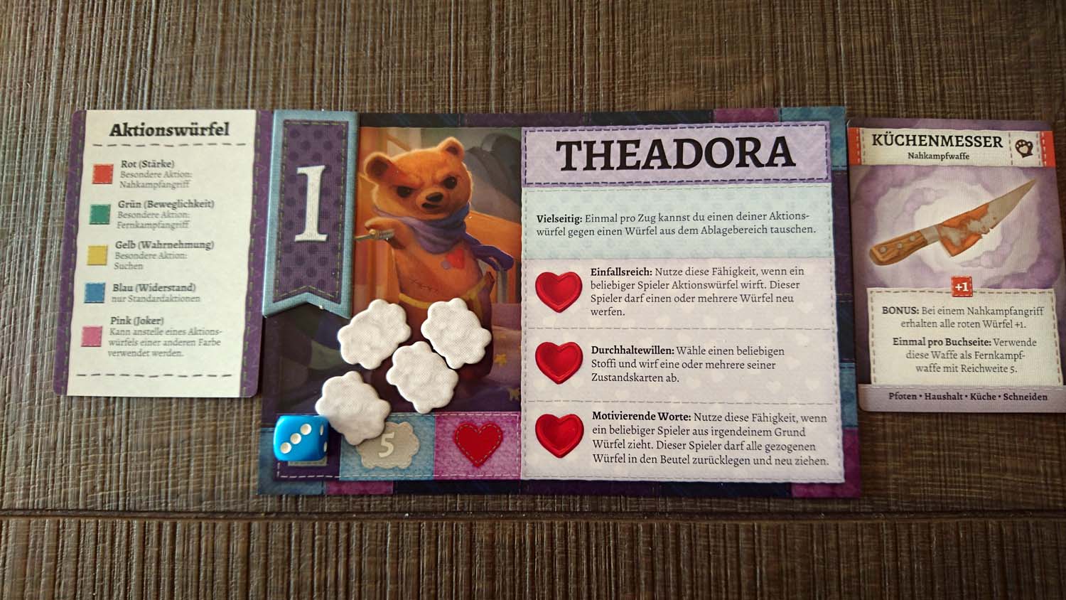 Würfel bekommen die Stoffis jeweils zu Beginn ihres Zuges. Ganze 5 an der Zahl werden aus dem Würfelbeutel gezogen. Je nach Farbe können diese unterschiedlich eingesetzt werden. Weiße Würfel können genutzt werden, um vor den Aktionen frische Watte zu erhalten, was den Lebenspunkten der Helden entspricht. Rote Würfel können für Nahkampfangriffe genutzt werden, grüne Würfel für Fernkampf. Vorausgesetzt, der Stoffi ist mit der entsprechenden Waffe ausgerüstet. Pinke Würfel dienen als Joker und können für jede Aktion genutzt werden. Blaue Würfel dienen in der Regel nur zum Bewegen, wozu alle anderen Farben außer Schwarz ebenfalls genutzt werden können. Die schwarzen Würfel gehören den Gegnern und müssen direkt zur Seite gelegt werden, wenn sie ein Spieler aus dem Beutel zieht. Sobald auf diesem Weg mindestens so viele Würfel aufgedeckt wurden, wie Stoffis im Spiel sind, wird ein Bedrohungseffekt abgehandelt. Sollten bereits Gegner im Spiel sein, greifen diese an, wenn die Anzahl der Würfel mindestens der Anzahl der Gegner entspricht. Solange weniger schwarze Würfel als Gegner ausliegen, bleiben Gegner auf dem Spielfeld zunächst inaktiv.