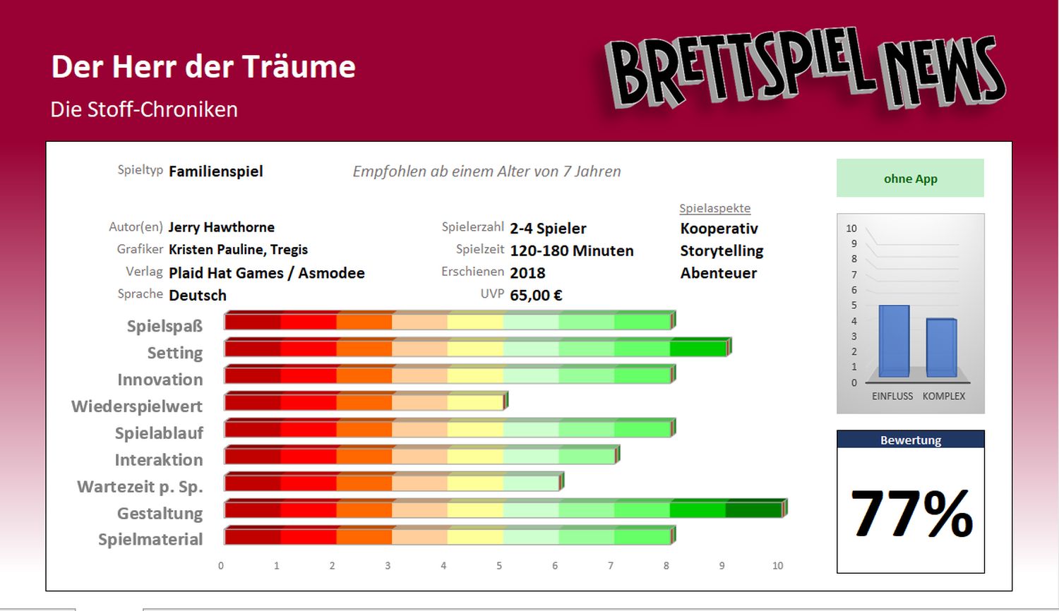 Es ist auch nicht unbedingt eine gute Idee, wie in den Regeln vorgegeben, dass jeder der Reihe nach vorliest, da besonders bei noch ungeübten Lesern die Geschichte dadurch deutlich an Reiz verliert. Ich kann von daher nur empfehlen, dass der beste Leser, der die unterschiedlichen Charaktere am ehesten mit Leben füllen kann, diese Rolle beibehält. Spieltechnisch macht dies kaum einen Unterschied, der Stimmung der Geschichte bringt es dafür große Vorteile. Und letzten Endes ist „Der Herr der Träume“ vor allem eine große, fantasievoll erzählte Geschichte, die junge Familienmitglieder komplett faszinieren dürfte, aber auch so manchen Erwachsenen zumindest kurzweilige unterhält, nicht zu Letzt auf Grund der liebenswerten Charaktere und der fantasievollen Geschichten.