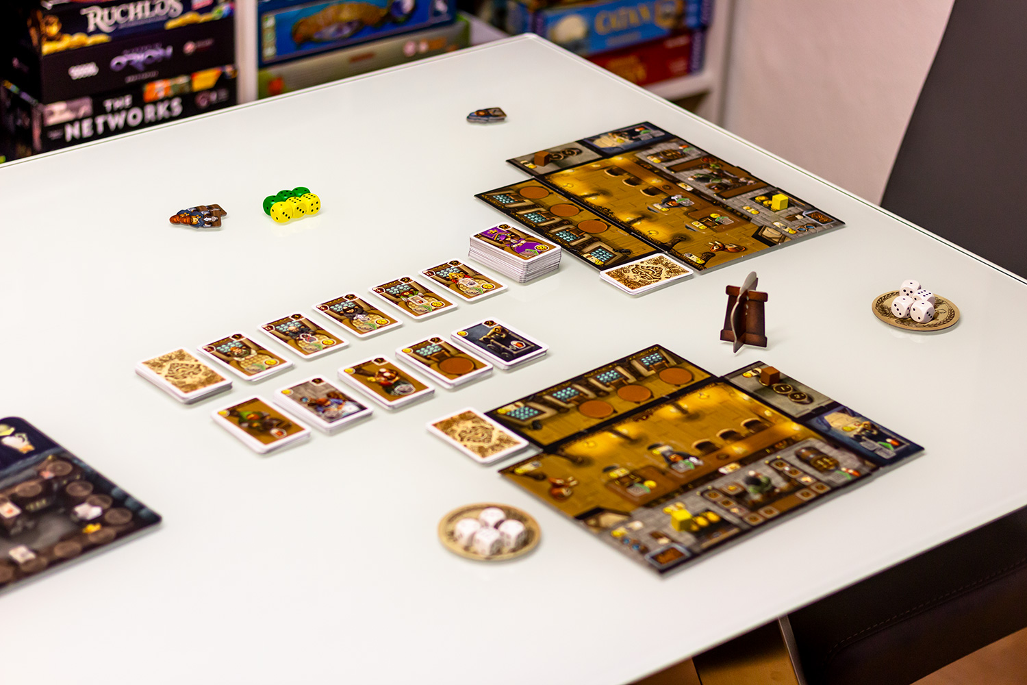 Ist dieses abgeschlossen legen die SpielerInnen gleichzeitig die Würfel auf ihr Tableau. Danach beginnt der Startspieler seine Aktionen zu nutze. Mögliche Aktionen sind zum Beispiel, die Taverne mittels Geld oder Abgabe passender Karten auszubauen, Neues Personal auf das eigene Deck bringen oder neue Gäste anlocken, die ebenfalls oben auf dem verdeckten Deck landen.