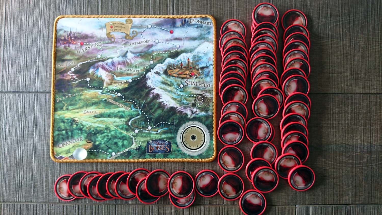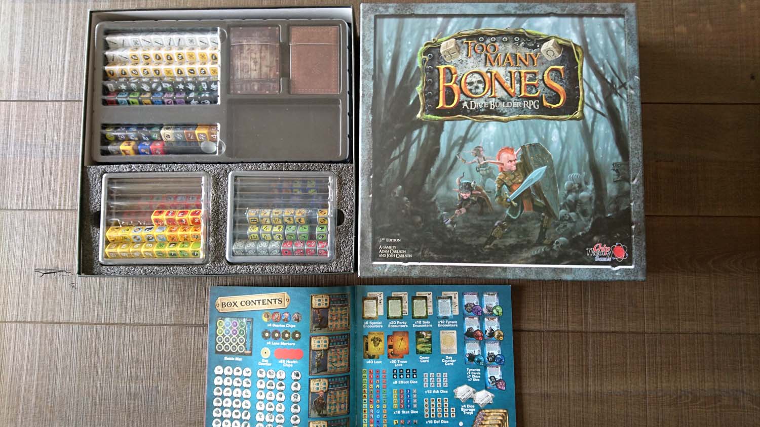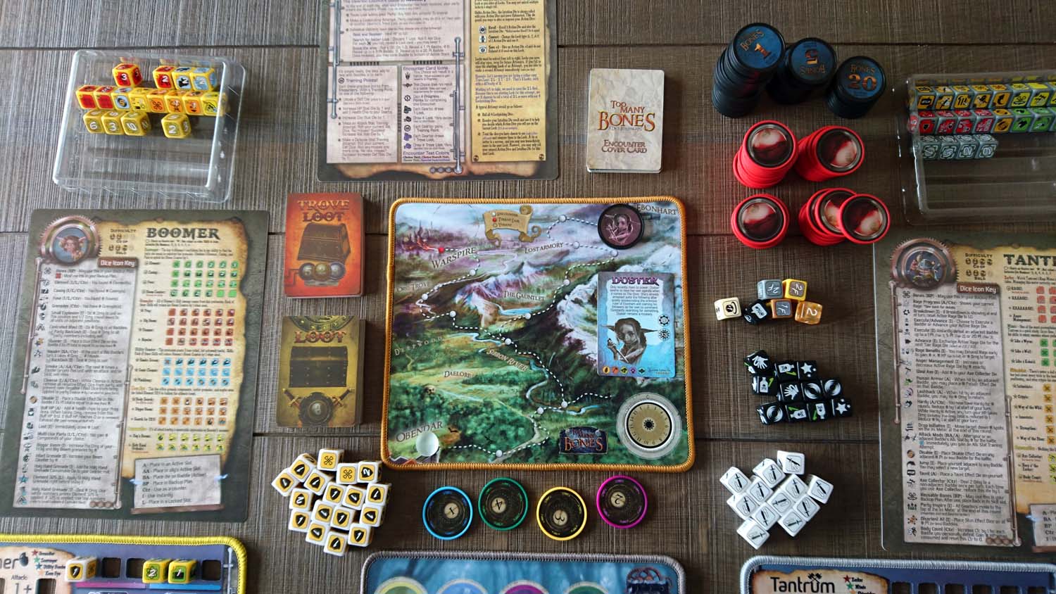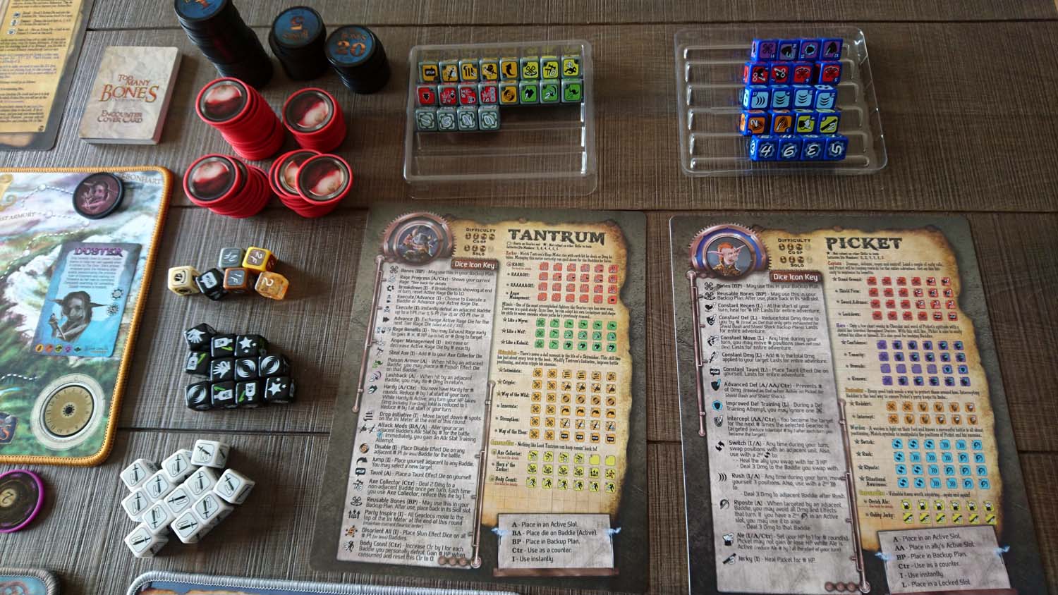 Das Spielmaterial von „Too Many Bones“ ist in vielerlei Hinsicht einzigartig. Die Gearlocks, Baddies und Tryannen kommen mit stabilen Pokerchips daher, unter denen in der Standardausführung leichtere Chips für die Lebenspunkte gestapelt werden. Die Spielmatte und die Matten für die Charaktere sind aus festem Neopren, das seit der 2. Auflage durch einen Abschluss vor dem Ausfransen geschützt ist. Zu jedem Gearlock gehört ein separater Satz aus 20 Würfeln mit eigenem Design, die für die Fähigkeiten stehen. Es liegen noch zahlreiche weitere Würfel für Angriff, Verteidigung, Effekte, Initiative, Sonderfähigkeiten, Schlösser öffnen sowie ein W6 in der Box. Zu jedem Gearlock gibt es eine beidseitig bedruckte, aus stabilem PVC gefertigte Charakterkarte, die ausführlich die einzelnen Fähigkeiten beschreibt. Zudem gibt es noch einen Referenzbogen in gleicher Ausführung. Schließlich liegen zwei Sätze Karten aus PVC mit Loot/Trove Loot in einer PVC-Box sowie Ereignis-/Boss-Karten ebenfalls aus PVC in einer zweiten Box dem Spiel bei.