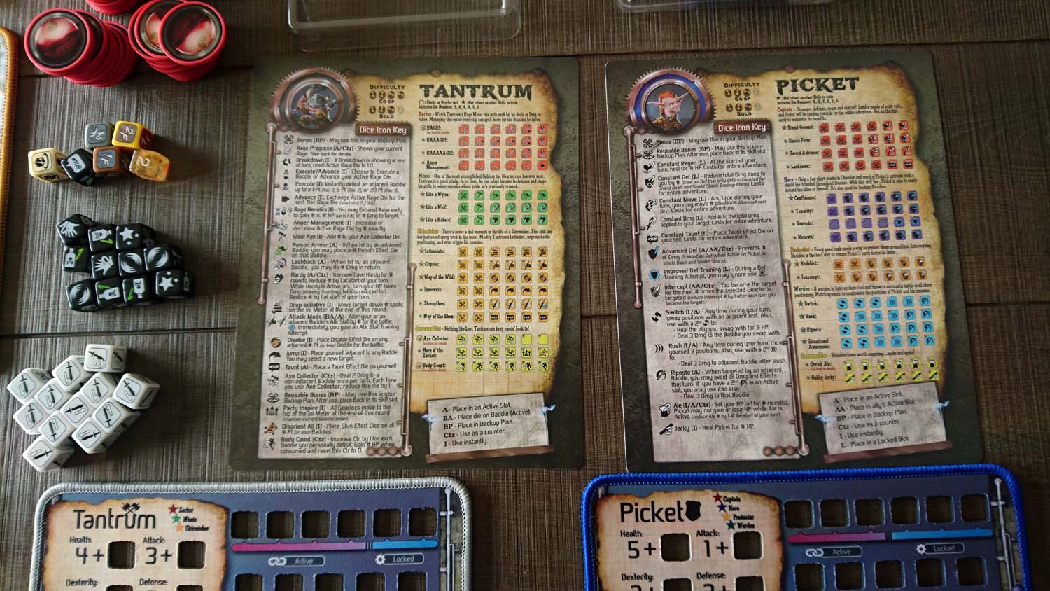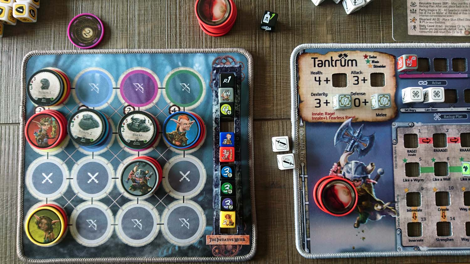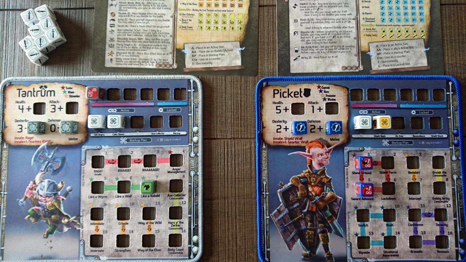 Jeder Gearlock kommt mit einem ganz eigenen Satz Würfel, mit ganz eigenen Fähigkeiten daher. Zunächst gibt es eine generelle Einteilung in Nahkämpfer und Fernkämpfer. Während Nahkämpfer nur Gegner angreifen können, die Waagerecht oder Senkrecht von ihnen stehen, können Fernkämpfer jedes beliebige Feld auf der Spielmatte erreichen. Doch auch innerhalb der beiden Gruppen gibt es große Unterschiede, wie sie im Einzelnen gespielt werden. So ist Patches ein Nahkämpfer, der sich neben dem Austeilen von Schaden vor allem mit Heilung und Giften auskennt, während Tantrum seine Wut aus Angriff und Verteidigung nutzt, um seinen Gegnern besonderen Schaden auszuteilen. Picket als letzter Nahkämpfer in der Basisbox ist geübt mit dem Schild und kann diesen nicht nur zur Verteidigung nutzen, sondern obendrein auch noch viel Schaden damit austeilen. Als Fernkämpferin steht mit Boomer eine Spezialistin für Bomben zur Verfügung, die nach dem Einsammeln der passenden Materialien u.a. für weitreichenden Flächenschaden sorgen kann.