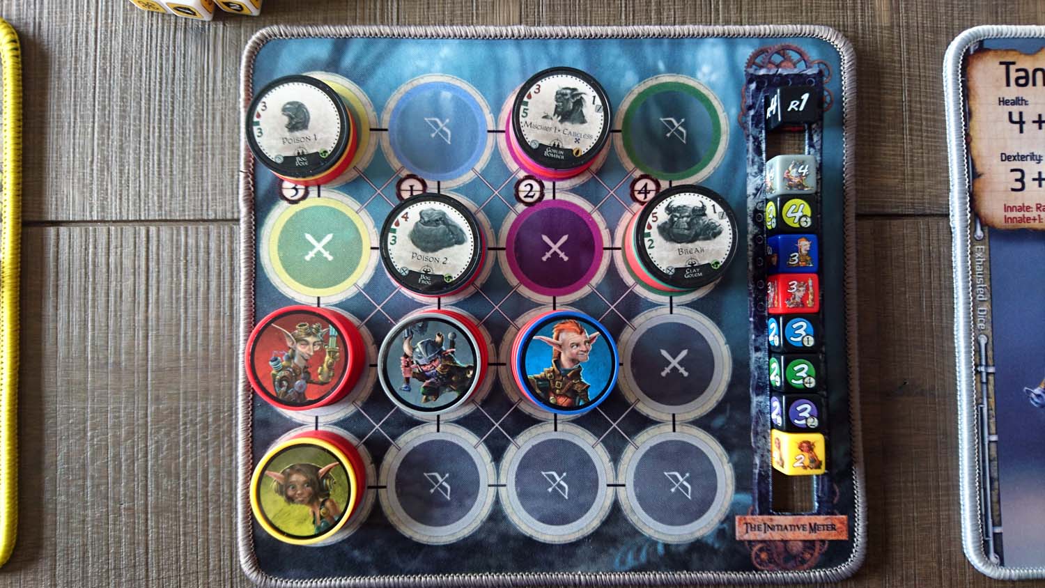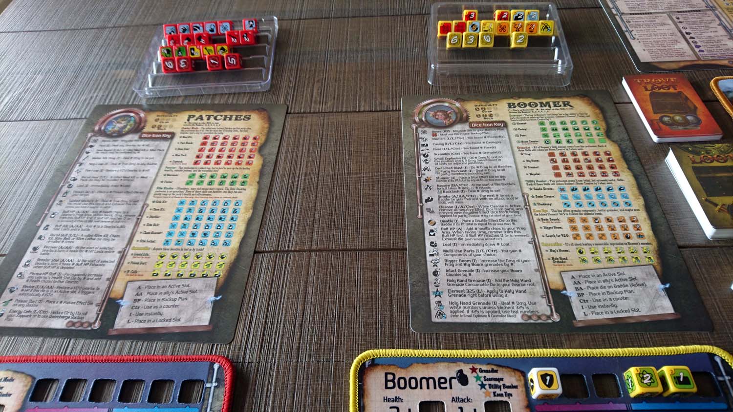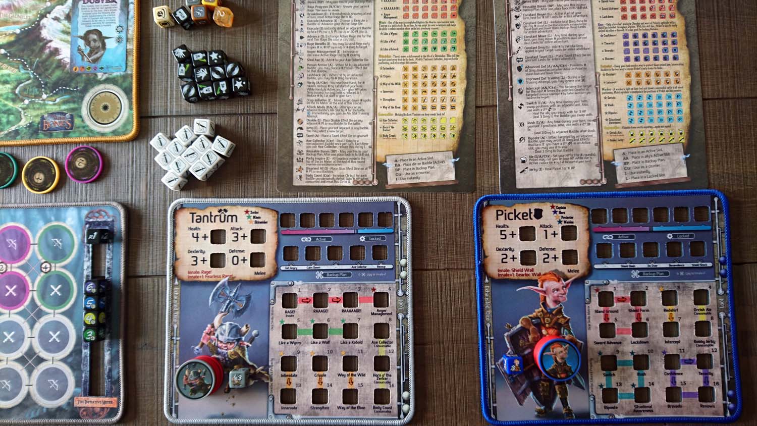 Jeder Gearlock kommt mit einem ganz eigenen Satz Würfel, mit ganz eigenen Fähigkeiten daher. Zunächst gibt es eine generelle Einteilung in Nahkämpfer und Fernkämpfer. Während Nahkämpfer nur Gegner angreifen können, die Waagerecht oder Senkrecht von ihnen stehen, können Fernkämpfer jedes beliebige Feld auf der Spielmatte erreichen. Doch auch innerhalb der beiden Gruppen gibt es große Unterschiede, wie sie im Einzelnen gespielt werden. So ist Patches ein Nahkämpfer, der sich neben dem Austeilen von Schaden vor allem mit Heilung und Giften auskennt, während Tantrum seine Wut aus Angriff und Verteidigung nutzt, um seinen Gegnern besonderen Schaden auszuteilen. Picket als letzter Nahkämpfer in der Basisbox ist geübt mit dem Schild und kann diesen nicht nur zur Verteidigung nutzen, sondern obendrein auch noch viel Schaden damit austeilen. Als Fernkämpferin steht mit Boomer eine Spezialistin für Bomben zur Verfügung, die nach dem Einsammeln der passenden Materialien u.a. für weitreichenden Flächenschaden sorgen kann.