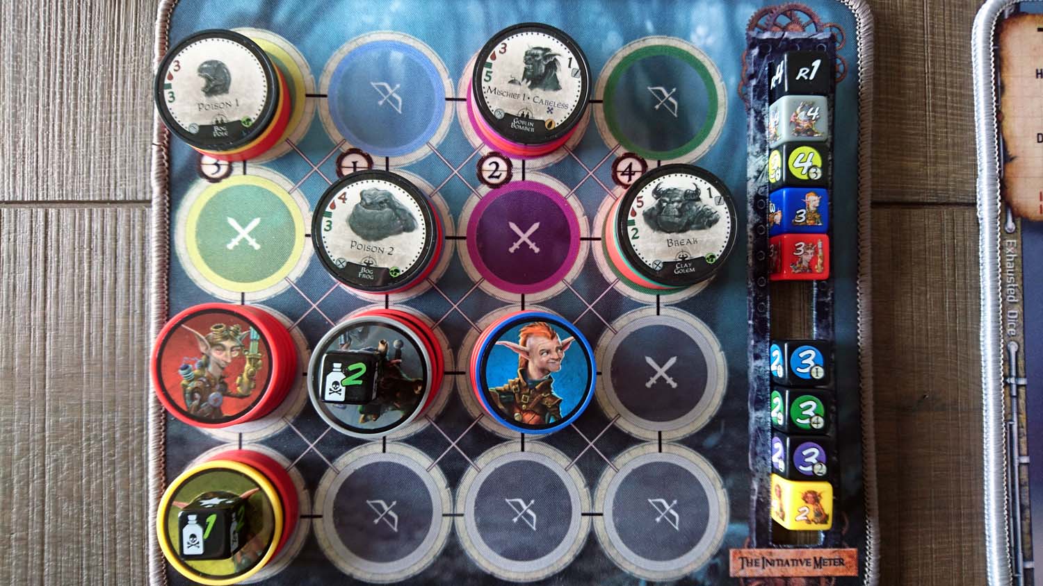 In den meisten Fällen geht es über die Aktionen der Tageskarten direkt zu einem Kampf. Dafür wird zunächst eine Baddie Queue (BQ) zusammengestellt. Der erste Schritt dafür ist den Tag mit der Anzahl der Spieler zu multiplizieren und anschließend Gegnerchips aus 20er, 5er und 1er Sammlungen zu stapeln. Von diesem Stapel werden die obersten 4 Chips der Reihe nach auf die Spielmatte gesetzt und ihre Initiativewürfel in die Initiativeleiste gelegt. Anschließend legen die SpielerInnen ihre gewürfelten Initiativewürfel ebenfalls in die Initiativeleiste und die Gearlock-Chips zusammen mit den Lebenschips auf die Spielmatte. Dann geht es der Initiativeleiste von oben nach unten in den Kampf. Baddies können sich generell 2 Felder bewegen und nutzen die aufgedruckte Anzahl der Angriffswürfel für ihre Attacke. Zusätzlich haben sie teils noch Gemeinheiten parat, die von Vergiften über Schwächen bis hin zum Hochfliegen einiges bereithalten. Ein Hindernis im Kampf sind auch die passiven Fähigkeiten der Baddies, weswegen ihnen pro Angriff teils nur 1 Schadenspunkt zugefügt werden kann, sie Angriffswürfel für den Rest des Spiels sperren oder gesicherte Würfel der Gearlocks von der Leiste genommen werden müssen.