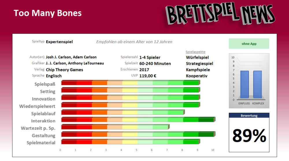 Für mich stellt „Too Many Bones“ zweifelsohne eine der fesselndsten Spielerfahrungen dar. Das Puzzeln nach neuen Synergien bei den Fähigkeiten, das Spielen mit den einzelnen Talenten und das Ausklügeln von Teamstrategien auf engstem Terrain packt mich immer wieder aufs Neue. Auch wenn die Anschaffung an sich relativ kostspielig ist, habe ich es bislang keine Sekunde bereut, darin investiert zu haben. Es ist ein Spiel, das garantiert regelmäßig auf den Tisch kommen wird und bei dem ich auch mit den bereits bereitliegenden Erweiterungen noch ganz viel Spaß haben werde.