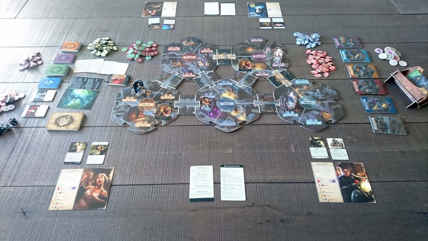Wer bereits mit den Mechaniken von „Eldrich Horror“ und „Arkham Horror – Das Kartenspiel“ vertraut ist, wird sich recht schnell in der 3. Edition von „Arkham Horror“ zurechtfinden. Bereits beim Aufbau lässt sich der erweiterte Mix aus beiden Welten erkennen. Das Spielbrett besteht aus Modulteilen, die je nach Abenteuer miteinander verbunden werden. Der Aufbau ergibt sich aus einer der 4 Szenarienkarten, die dem Spiel beiliegen. Ausgelegt werden jeweils Stadtviertel, zu denen die passenden Begegnungs- und Ereigniskarten herausgesucht werden. Aus den Ereigniskarten wird der Ereignisstapel gemischt. Von dem Stapel werden die obersten 3 Karten genommen und jeweils unter die ersten 3 Karten des jeweiligen Begegnungsstapels gemischt sowie ein Hinweismarker in die Mitte des entsprechenden Stadtviertels ausgelegt. Nur über die im Begegnungsdeck eingemischten Karten aus dem Ereignisdeck ist es später möglich, Hinweise zu ermitteln. Die Begegnungskarten führen zu Standardereignissen.