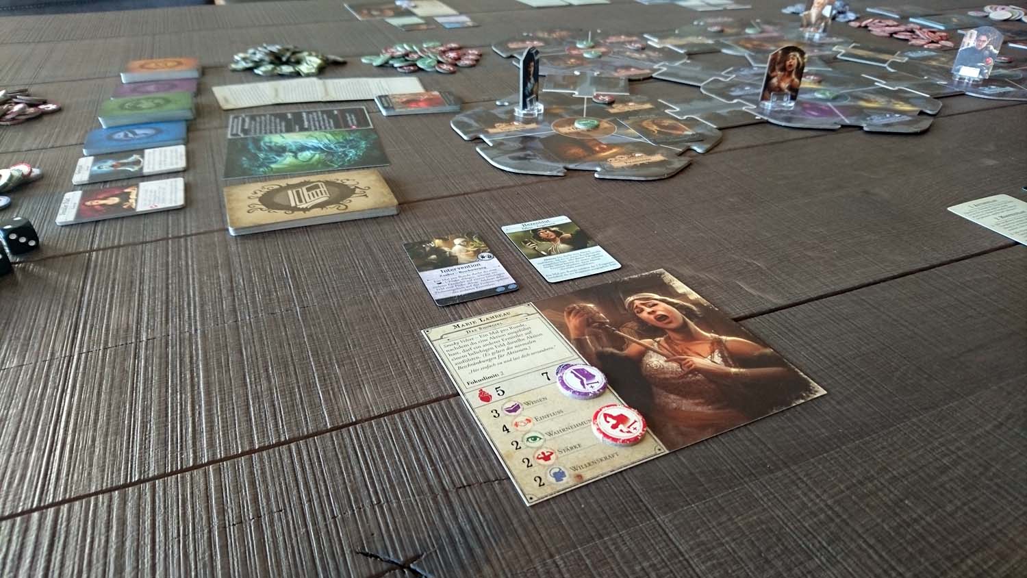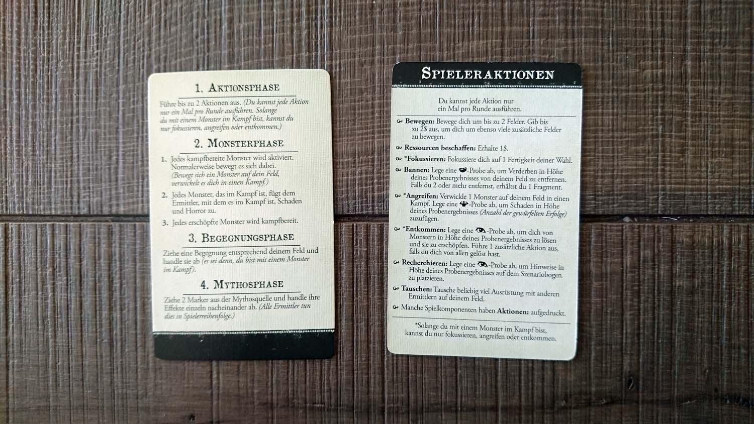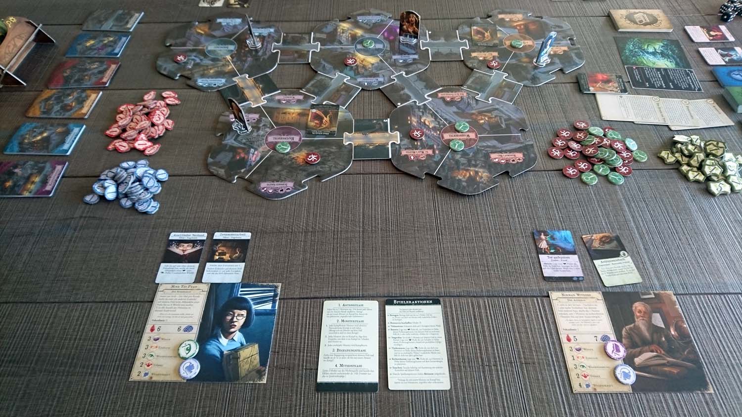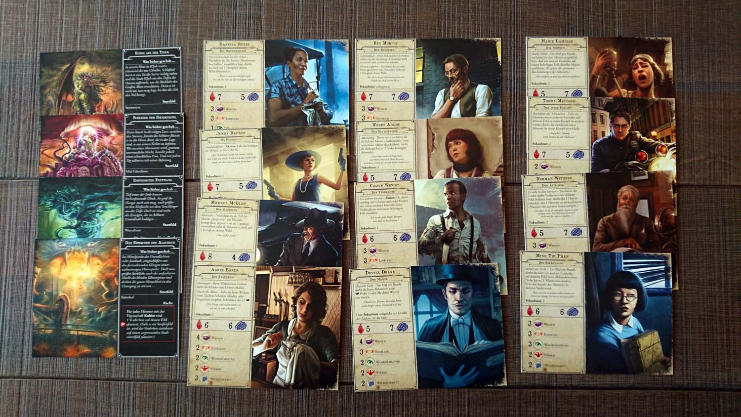 Das Monsterdeck wird ebenfalls so zusammengestellt, wie es auf der Szenariokarte beschrieben ist. Gleiches gilt für die Mythosmarker, für die ein eigenes Gefäß, wie z.B. ein Beutel, bereitgestellt werden muss. Die SpielerInnen wählen einen oder mehrere Ermittler aus, versorgen diese mit ihrer Grundausrüstung, die sich aus der Rückseite der jeweiligen Ermittlerkarte ergibt, erstellen ein Schlagzeilendeck und legen die Karten für die Verbündeten, Zauber, Gegenstände sowie die Spezialkarten bereit. Falls es das Szenario erfordert, wird zusätzlich noch ein Stapel mit Anomalienkarten bereitgelegt. Weiter geht es mit dem Auslegen der Verderbensmarker und dem Platzieren der ersten Monster. Die hinterste Karte des Ereignisdecks wird anschließend gezogen, um das instabile Feld festzulegen. Dieses ist das Ziel vieler Monster bei ihrer Bewegung und ändert während des Spiels öfters seine Lage. Was noch fehlt, ist das Zusammenstellen des aktuellen Kodex über die Archivkarten, erneut gemäß der Szenariokarte. Anschließend werden die Texte der Archivkarten vorgelesen und abgehandelt. Und los geht es mit dem Spiel.