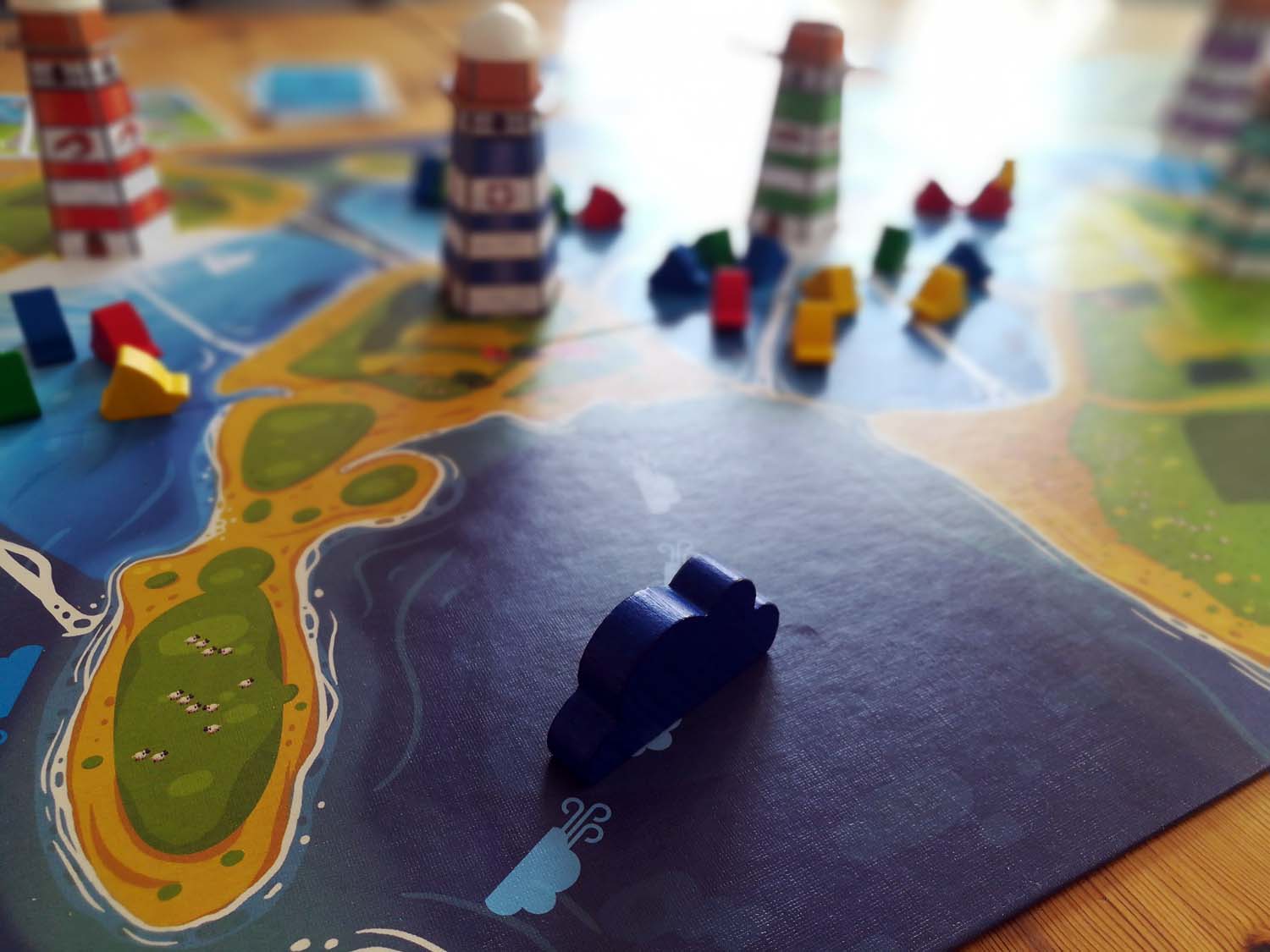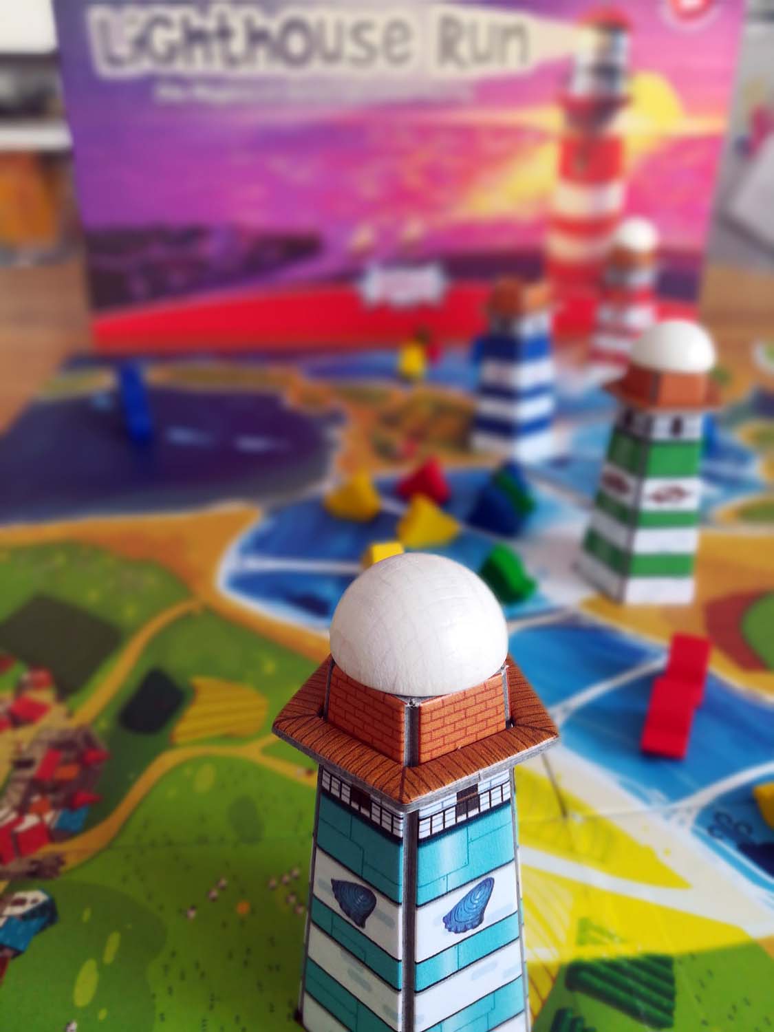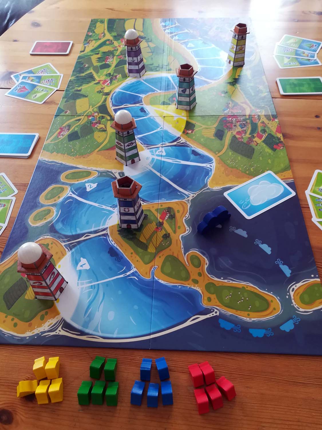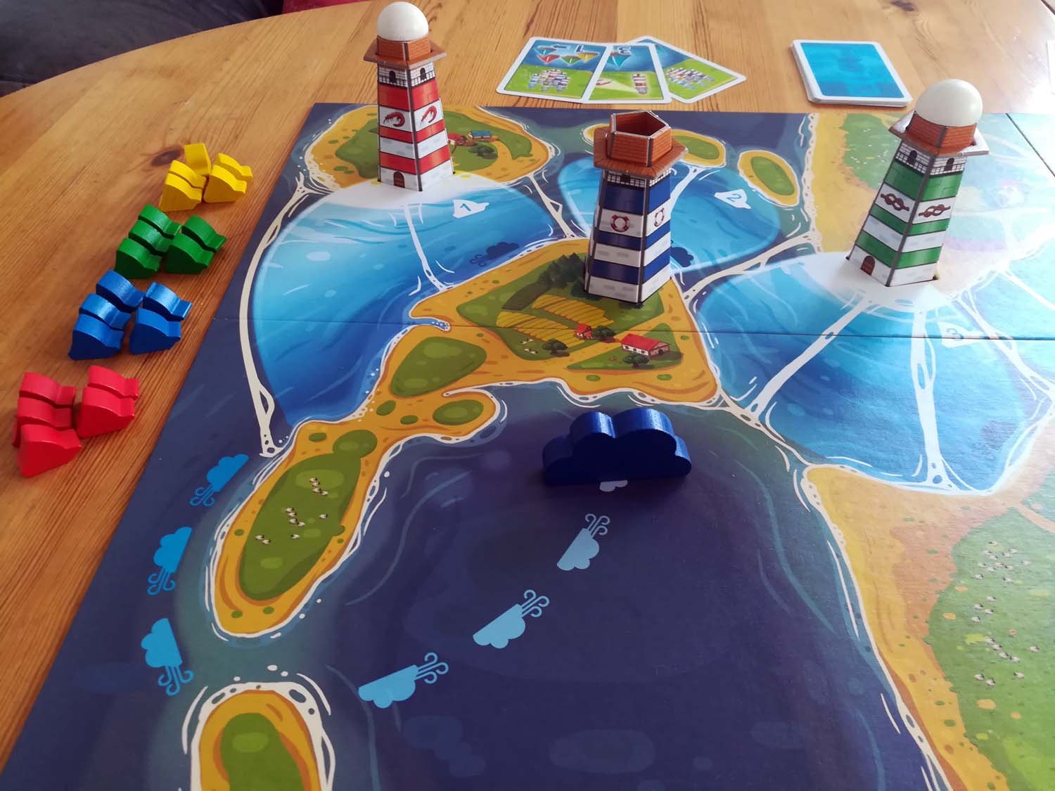 Der Aufbau des Spiels ist relativ simpel. Das Brett wird ausgebreitet, die Leuchttürme nach beliebiger Farbe in den vorgesehenen Stellen auf dem Spielplan platziert und der erste, dritte und fünfte Turm werden beleuchtet. Danach positioniert man die Wolke (aka „das Gewitter“) auf ihrem ersten Feld und die Schiffe werden an der Flussmündung bereitgestellt. Damit ist der Aufbau schon beendet und das Rennen kann beginnen.