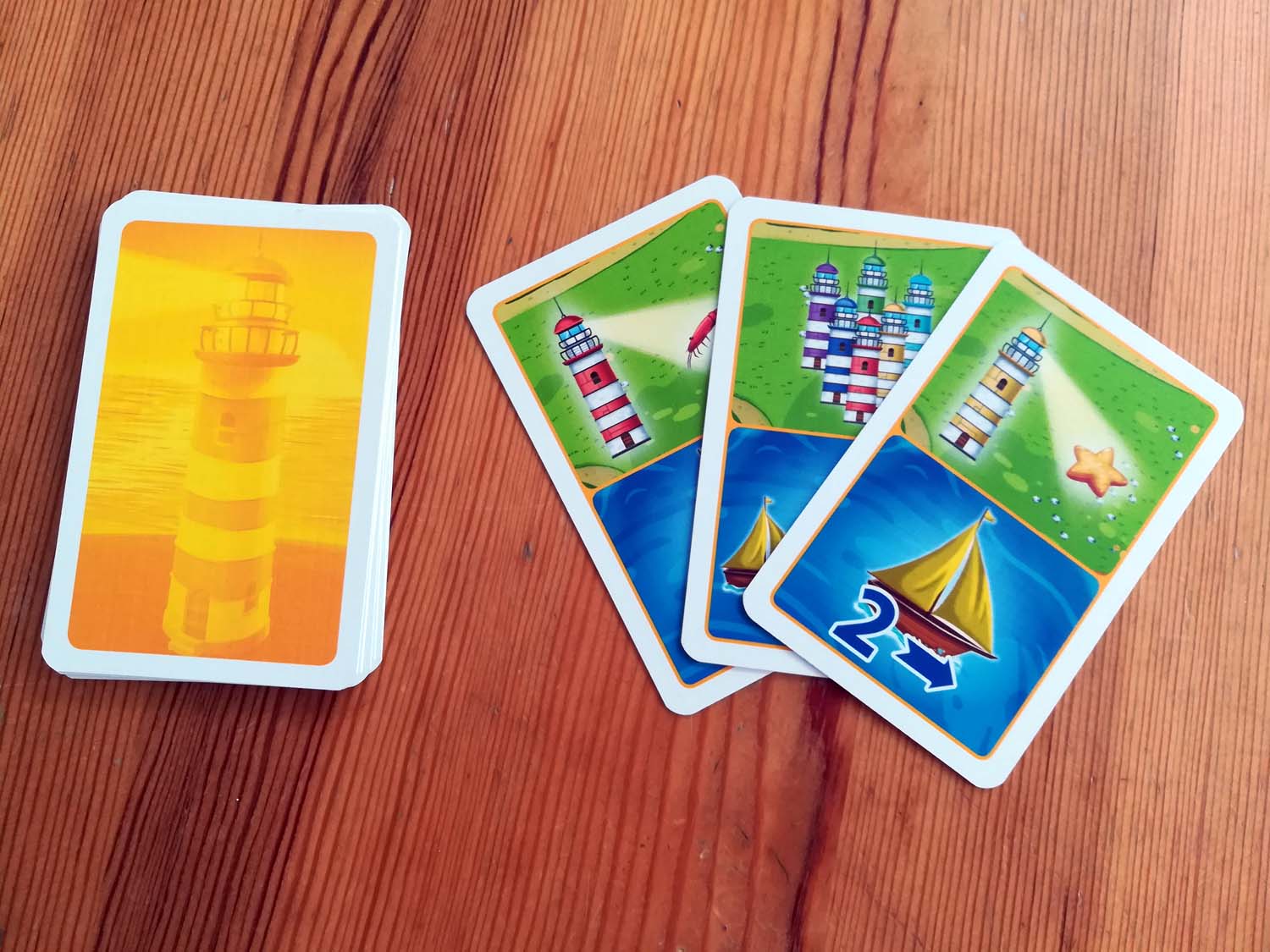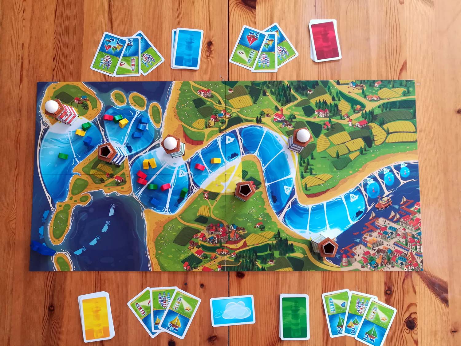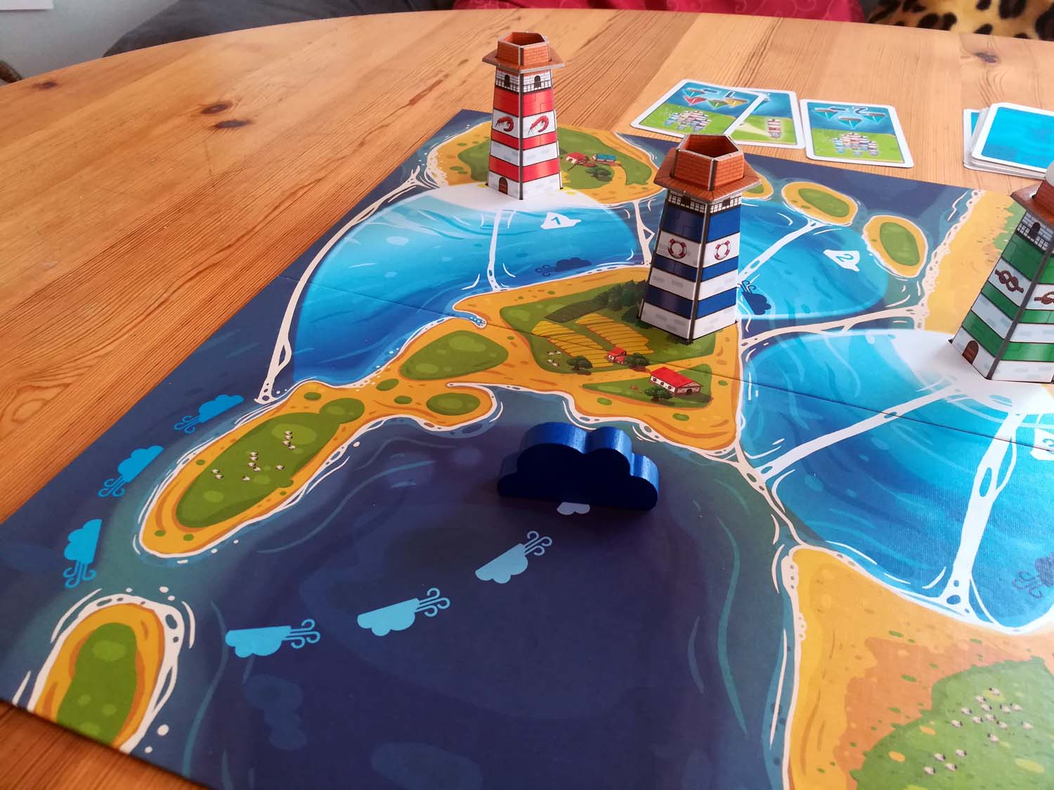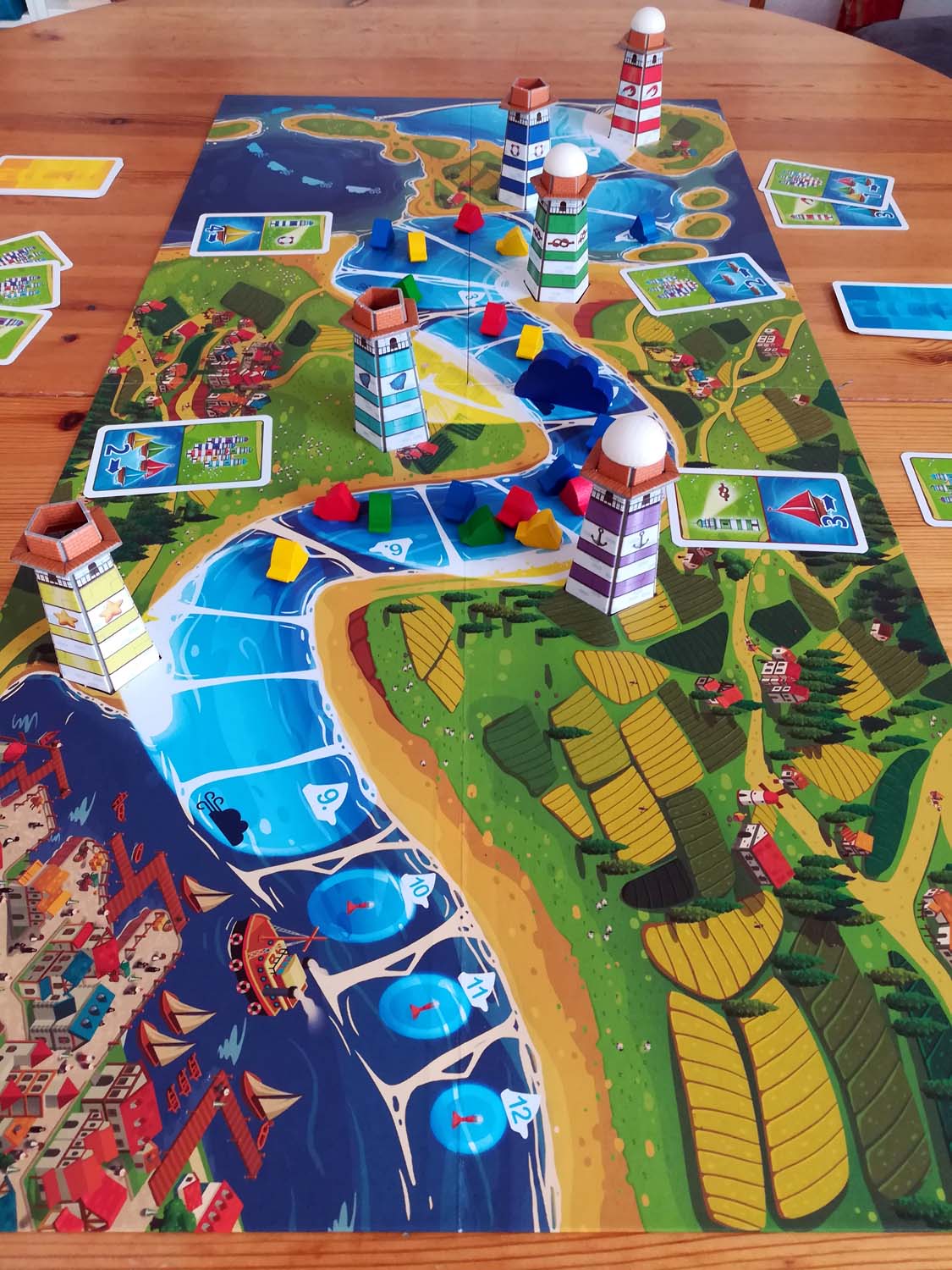 Der Aufbau des Spiels ist relativ simpel. Das Brett wird ausgebreitet, die Leuchttürme nach beliebiger Farbe in den vorgesehenen Stellen auf dem Spielplan platziert und der erste, dritte und fünfte Turm werden beleuchtet. Danach positioniert man die Wolke (aka „das Gewitter“) auf ihrem ersten Feld und die Schiffe werden an der Flussmündung bereitgestellt. Damit ist der Aufbau schon beendet und das Rennen kann beginnen.