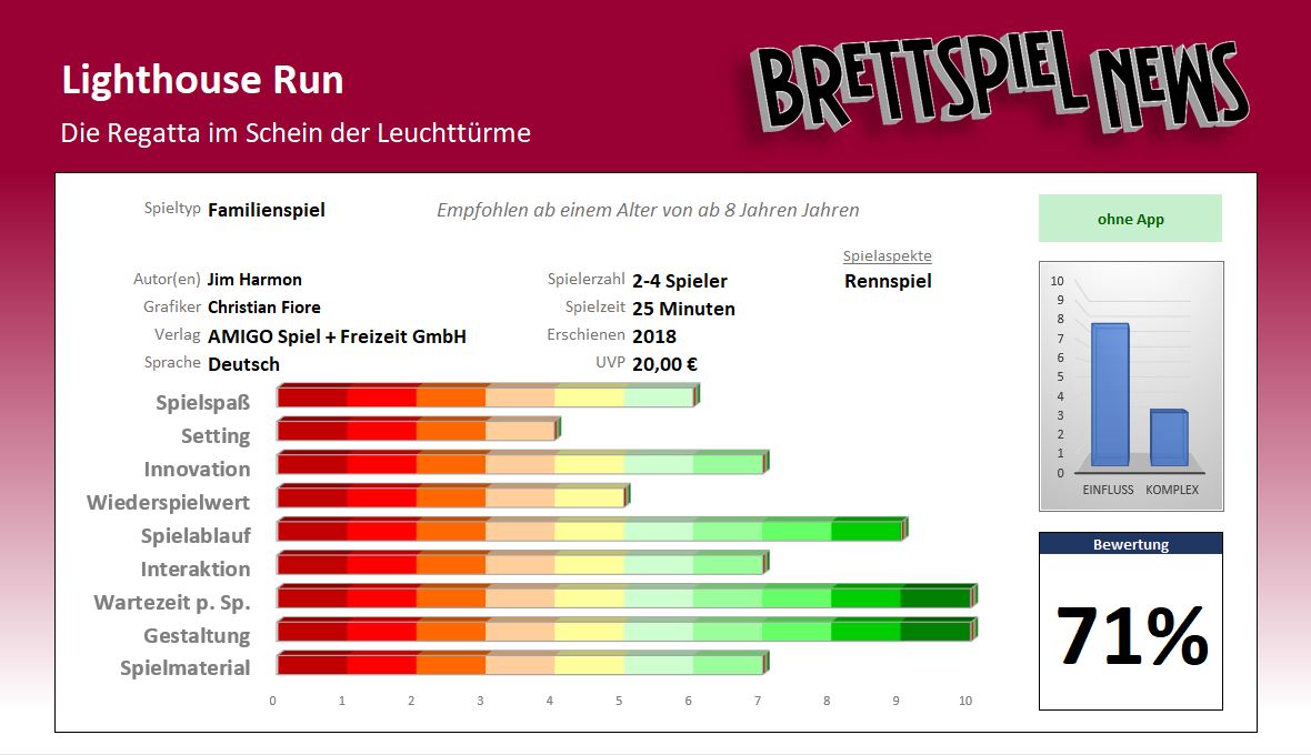 Lighthouse Run ist ein schnelles und einfach zu verstehendes Spiel. Der Inhalt ist schön dekoriert und fühlt sich solide an, wobei die Leuchttürme bei häufigem Gebrauch eventuell kaputt gehen könnten. Es gibt durchaus mehrere Strategien, wie die Spieler an das Spiel heran gehen können. Entweder kämpft jeder für sich selbst und versucht lediglich so viele der eigenen Schiffe wie möglich in den Hafen zu bringen, riskiert aber mehr Schiffe auf dem Weg zu verlieren, oder man spielt miteinander, sodass alle Spieler ziemlich weit kommen.
