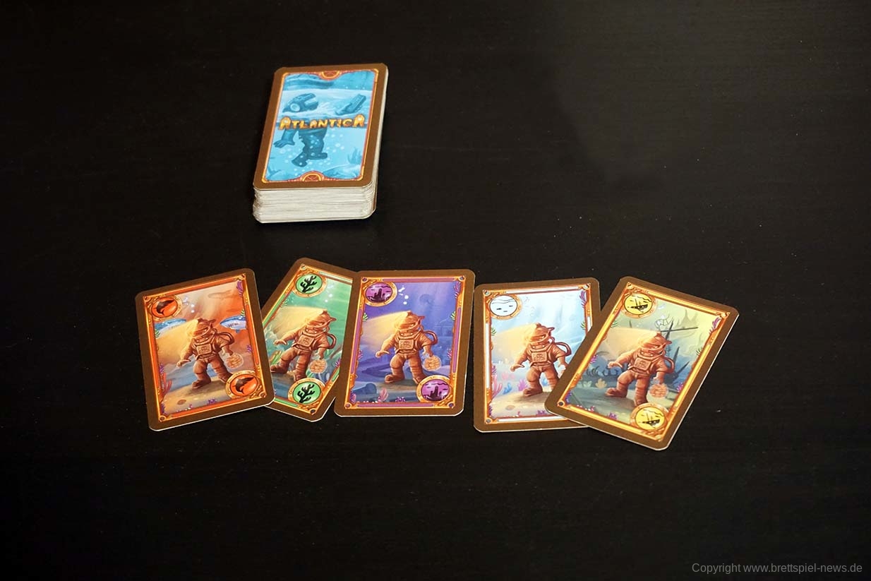 Wer bei „Atlantica“ auf ein innovatives Spielsystem hofft, wird enttäuscht. Denn es handelt sich hier um ein gut funktionierendes Kartensammelspiel für die ganze Familie. Es besteht zurecht aus wenig Regeln, die auch für Kinder leicht umsetzbar sind. Aber auch wenn hier von leichten Regeln und keiner Innovation die Rede ist, so ist die Spielmechanik gar nicht so simpel umzusetzen. Auch hier benötigt jeder ein klein wenig Planung und strategisches Denken. Denn die Besonderheit besteht in der Tatsache, dass maximal nur drei Taucherkarten ausgespielt werden dürfen. Hier muss entschieden werden, ob die drei Karten für nur eine Aktion genutzt werden, um somit beispielsweise mehr Schätze zu bergen, oder ob es sinnvoller ist nur einen Schatz zu bergen und drei neue Taucher für die nächste Spielrunde auf die Hand zu nehmen. Somit entgehen wir der Situation in der kommenden Runde keine Spielkarten mehr auf der Hand zu halten und passen zu müssen.
