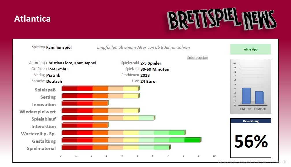 „Atlantica“ ist für 2-5 Spieler ausgelegt und funktioniert mit 2 Spielern und 5 Spielern gleich gut. Zur Steuerung der Spieldauer wird eine vorgegebene Anzahl an Karten aus dem Schatzkartenstapel zufällig entfernt. Als kleines Manko wäre noch die Wartezeit bei 5 Spielern anzumerken. Diese kann bei ungeduldigen Spielern oder Kindern zu Frust führen.