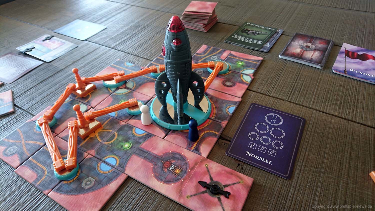 Das Spiel beginnt damit, dass die SpielerInnen sich für den Schwierigkeitsgrad entscheiden. Vom Anfänger bis Legendär habt ihr die Wahl. Der Unterschied der jeweiligen Schwierigkeitsgrade ist die Anzahl an Teilchen, die ihr für den Sieg im Kreis verbinden müsst. Verbunden werden müssen die Raketenplattform, kleine und große Kondensatoren sowie Blitzableiter. Bevor dies möglich ist, müssen diese Elemente erstmal auf das Spielfeld gebracht werden, das selbst erst einmal entdeckt werden will. Dafür stehen jeweils 4 Aktionen pro Zug und SpielerIn zur Verfügung. Nach dem Zug kommt jeweils eine Wetterphase, in der das Unwetter zuschlägt, und dadurch das Ende der Mission stetig vorantreibt.