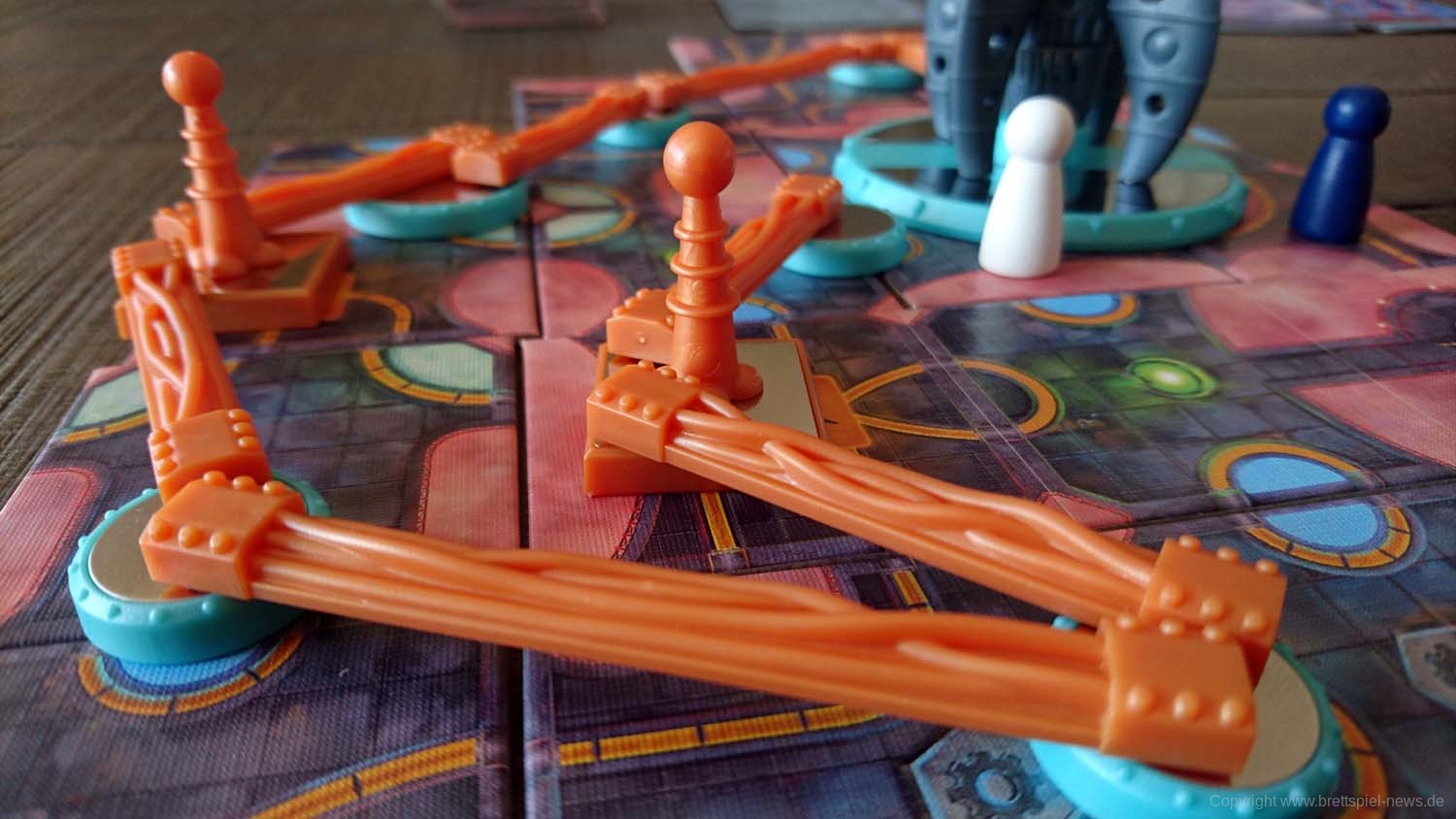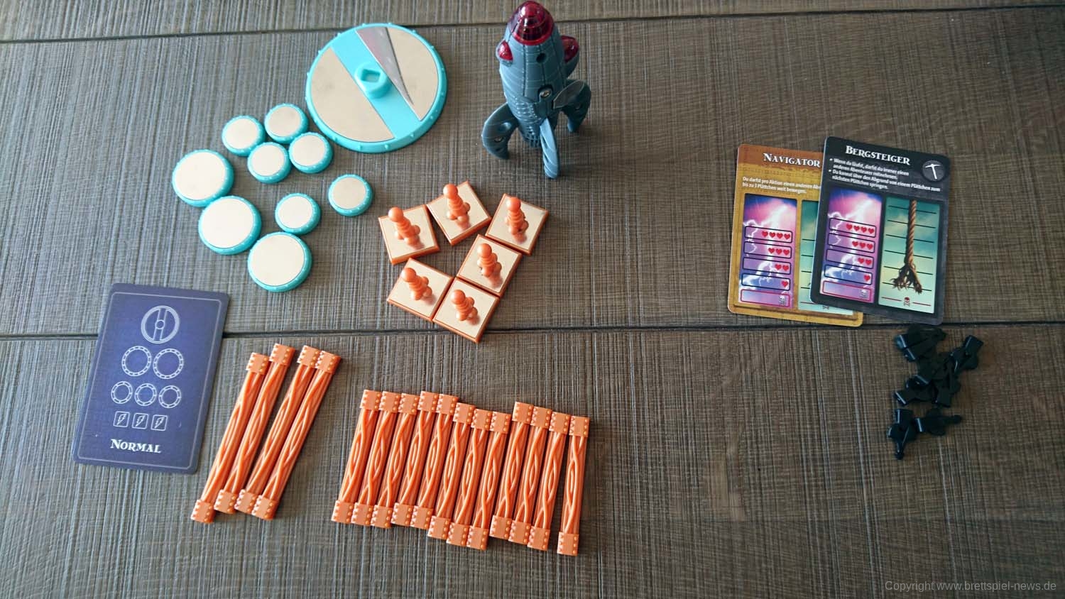 Das Spielmaterial macht einen sehr guten Eindruck. Vor allem die Rakete ist als Gimmick von allererster Güte. Nicht nur, dass sie massiv daherkommt, beginnt sie beim Schließen der Verbindung auch noch zu Blinken und macht Geräusche, die einem Raketenstart nachempfunden sein sollen. Die dafür notwendigen Batterien sind bereits enthalten. Die einzelnen Leitungen, Kondensatoren und die Plattform für die Rakete sind aus stabilem Kunststoff gefertigt und mit einer leitenden Oberfläche sowie im Falle der Leitungen mit Magneten versehen. Die Karten sind dank Leinenabschluss widerstandsfähig, die Plättchen sind aus stabilem Karton gefertigt, die Meeples aus Holz.