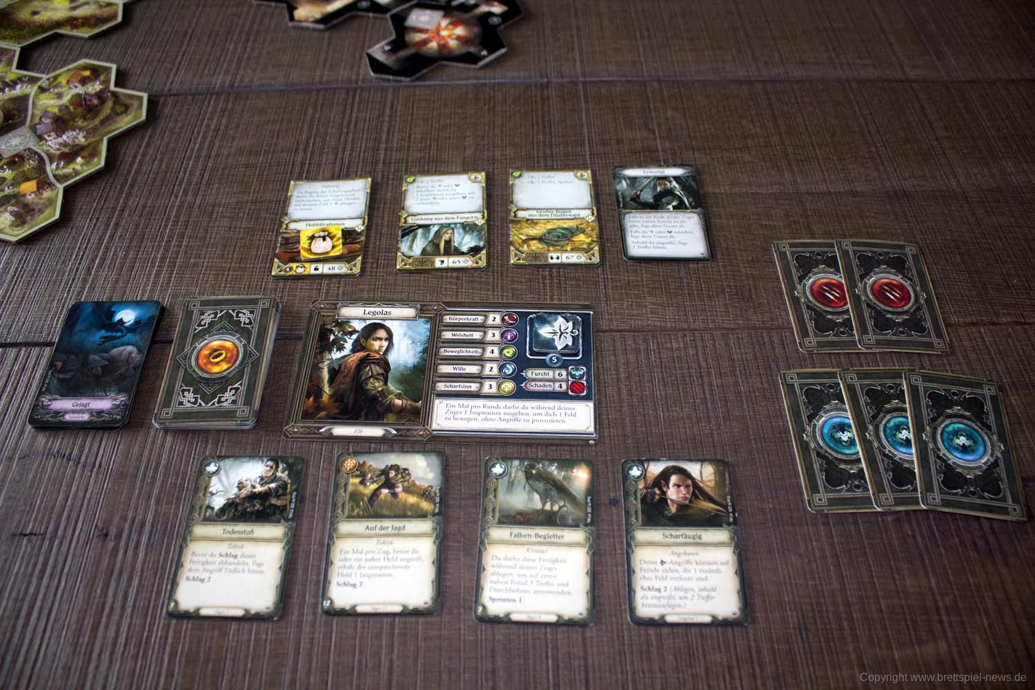 Die im Text beschriebene Fähigkeit in der unteren Hälfte der Karte muss ausgerüstet sein, um sie nutzen zu können. Hierzu wird zu Beginn jeder Runde zunächst das komplette Deck zusammengemischt und anschließend über die Kundschaften-Funktion eine Anzahl Karten, in der Regel 2, vom Nachziehstapel gezogen. Eine Karte darf ausgerüstet und dadurch spielbereit gemacht werden, alle anderen Karten können je nach Belieben auf oder unter das Deck in beliebiger Reihenfolge gelegt werden. Es dürfen insgesamt maximal 4 Karten ausgerüstet sein. Einige Karten geben so einen dauerhaften Effekt, während andere ausgespielt werden können, um einen Effekt auszulösen. Die Symbole in der oberen linken Ecke haben bei ausgerüsteten Karten keinerlei Bedeutung. Es sollte daher wohl überlegt sein, ob eine Karte mit Erfolgssymbol beim Kundschaften ausgerüstet oder lieber oben auf den Nachziehstapel gelegt wird, um somit einen garantierten Erfolg beim Ziehen vom Stapel bei Proben zu erhalten.
