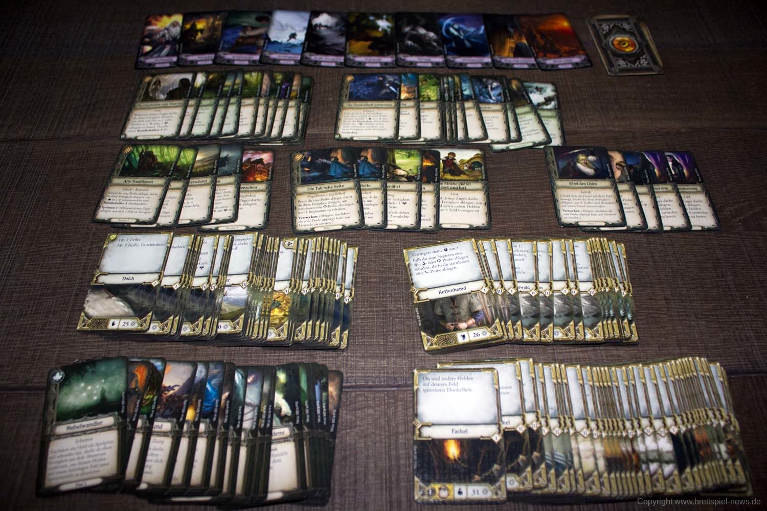 Ich beginne gleich mit dem Minuspunkt beim Spielmaterial. Nicht ganz so gut gefallen mir die Deckkarten, die offensichtlich für Hobbithände und Adleraugen gefertigt wurden. Mit einer Größe von 6,3cmx4cm liegen sie nicht wirklich gut in der Hand, was vor allem beim regelmäßigen Mischen immer wieder auffällt. Zudem ist der Schriftsatz teils doch recht klein geraten, weswegen volle gute Sehkraft und sehr gute Beleuchtung notwendig sind, um erkennen zu können, welche Effekte ausgelöst werden können, geschweige denn zu welcher Kategorie die Karte gehört. Ein etwas größeres Format wäre hier definitiv angebracht gewesen. Die Oberfläche der Karten ist relativ stabil geraten, weswegen auch SpielerInnen ohne Sleeve-Leidenschaft lange etwas von ihnen haben sollten.