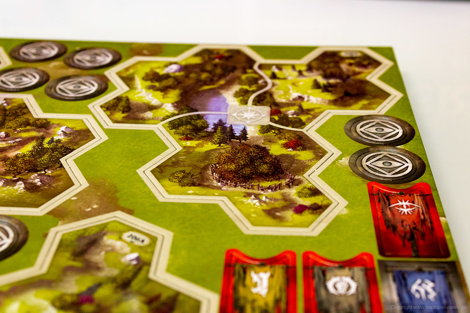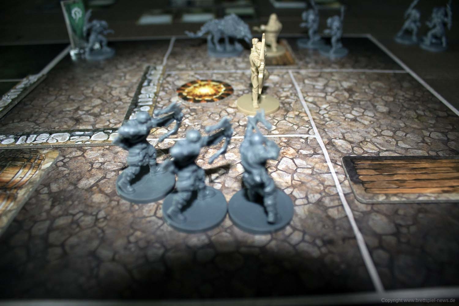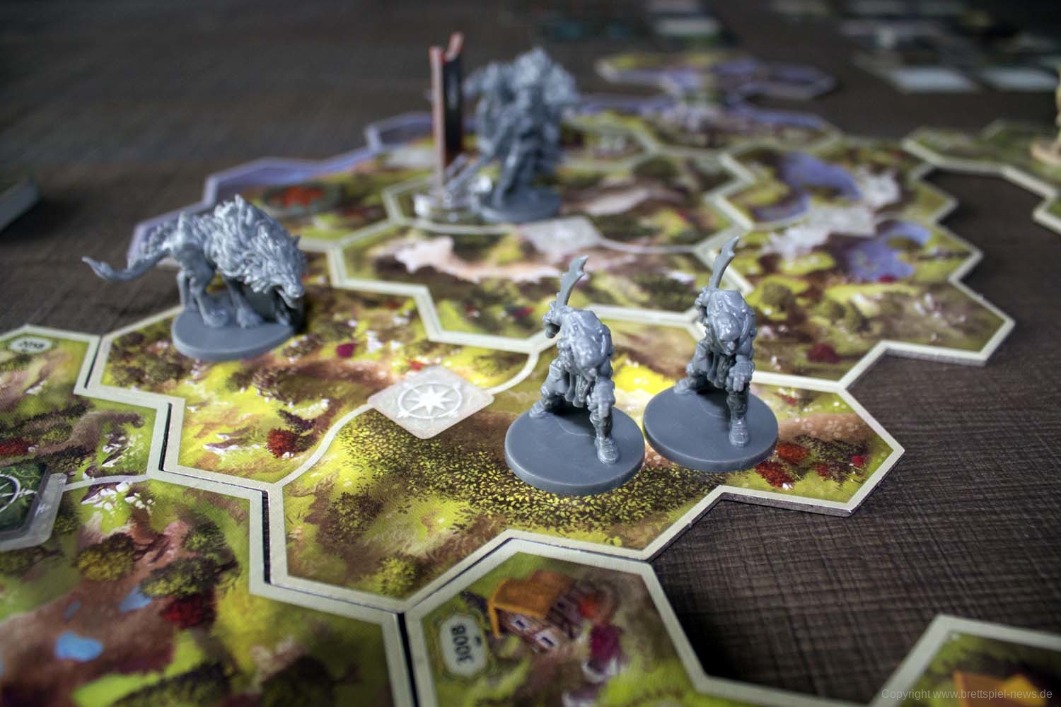 Abgesehen von der Kartengröße hinterlässt das Spielmaterial einen durchweg guten Eindruck. Vor allem die Miniaturen aus stabilem Guss bieten zahlreiche feine Details und hinterlassen ein gutes Bild. Die Spielplanteile sind doppelseitig bedruckt und aus robustem Karton gefertigt. Gleiches gilt für diverse Marker und Geländeteile für das Schlachtfeld.
