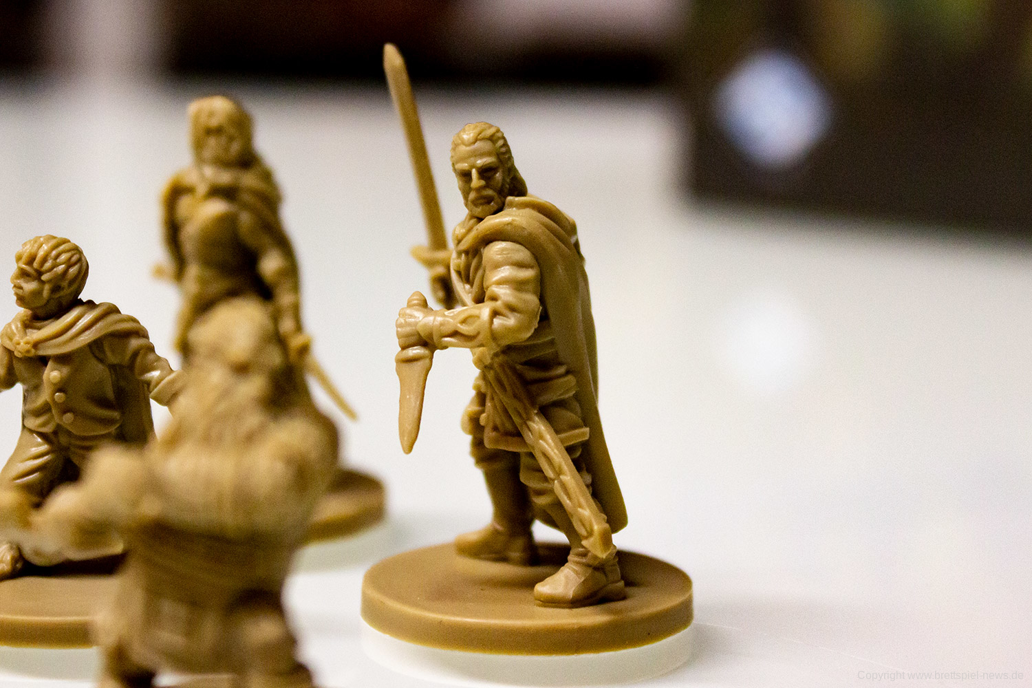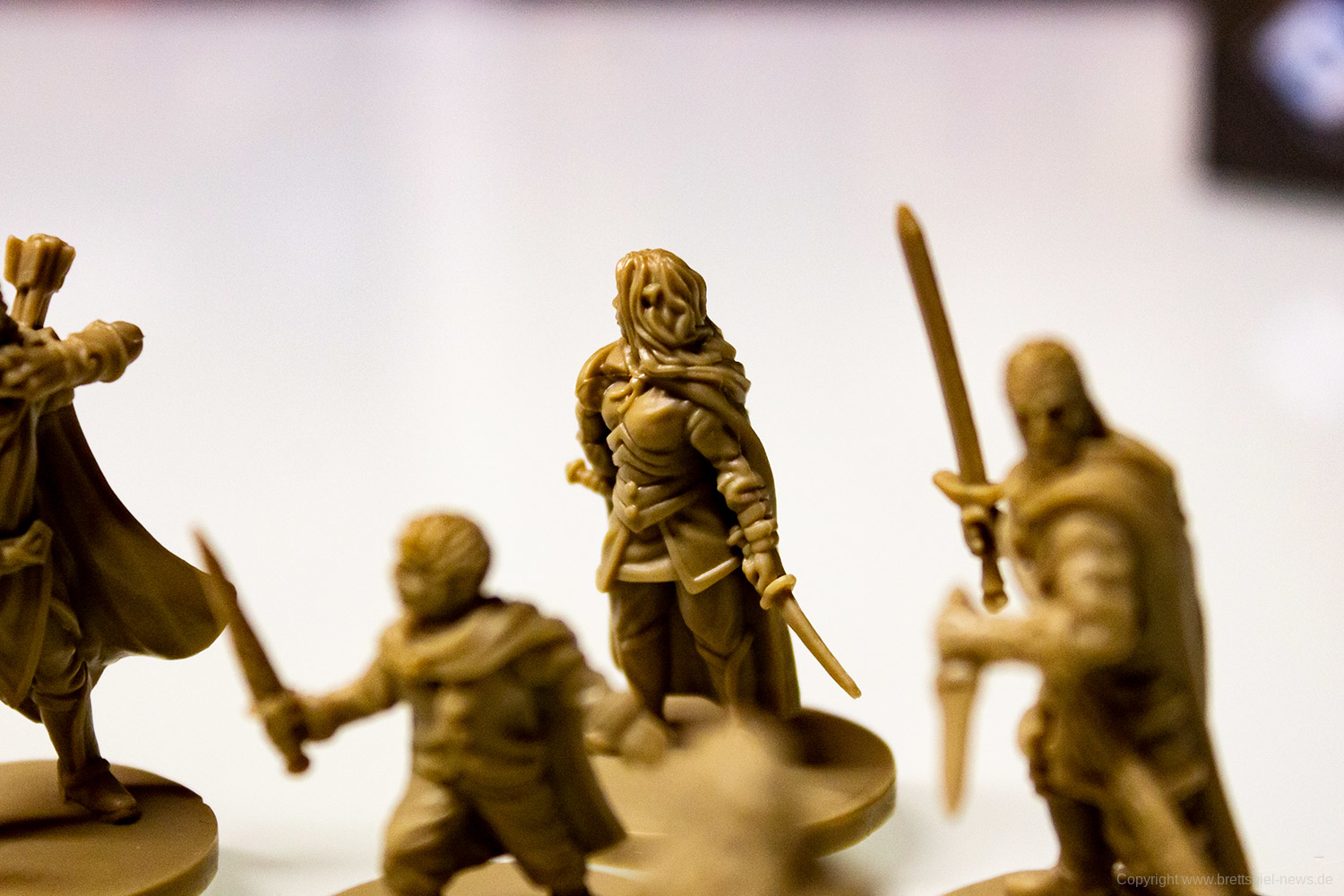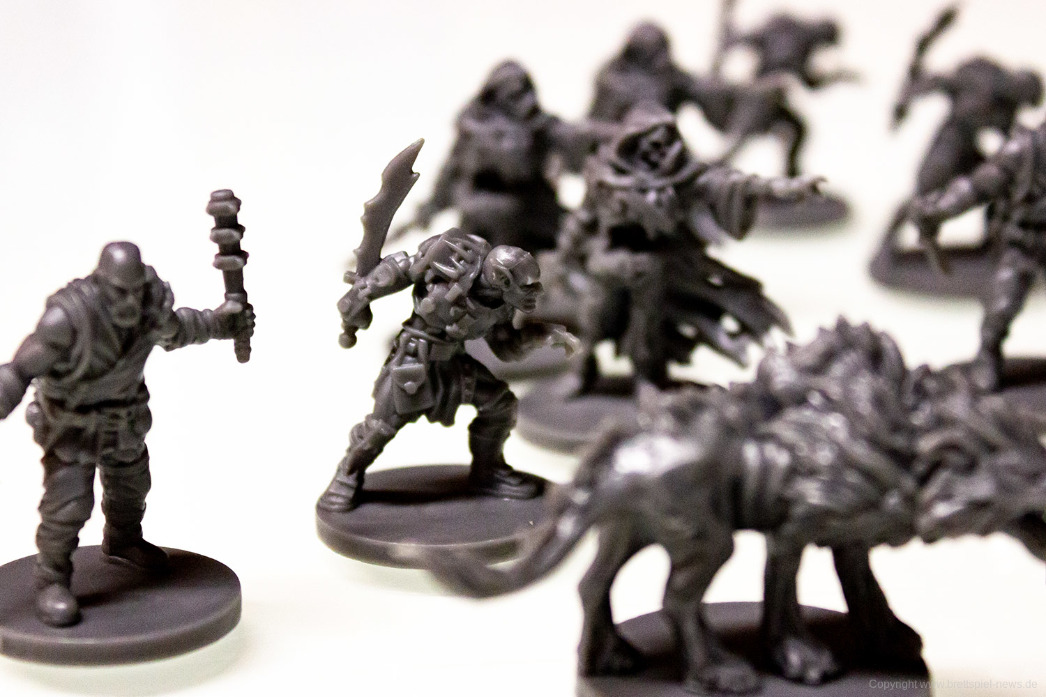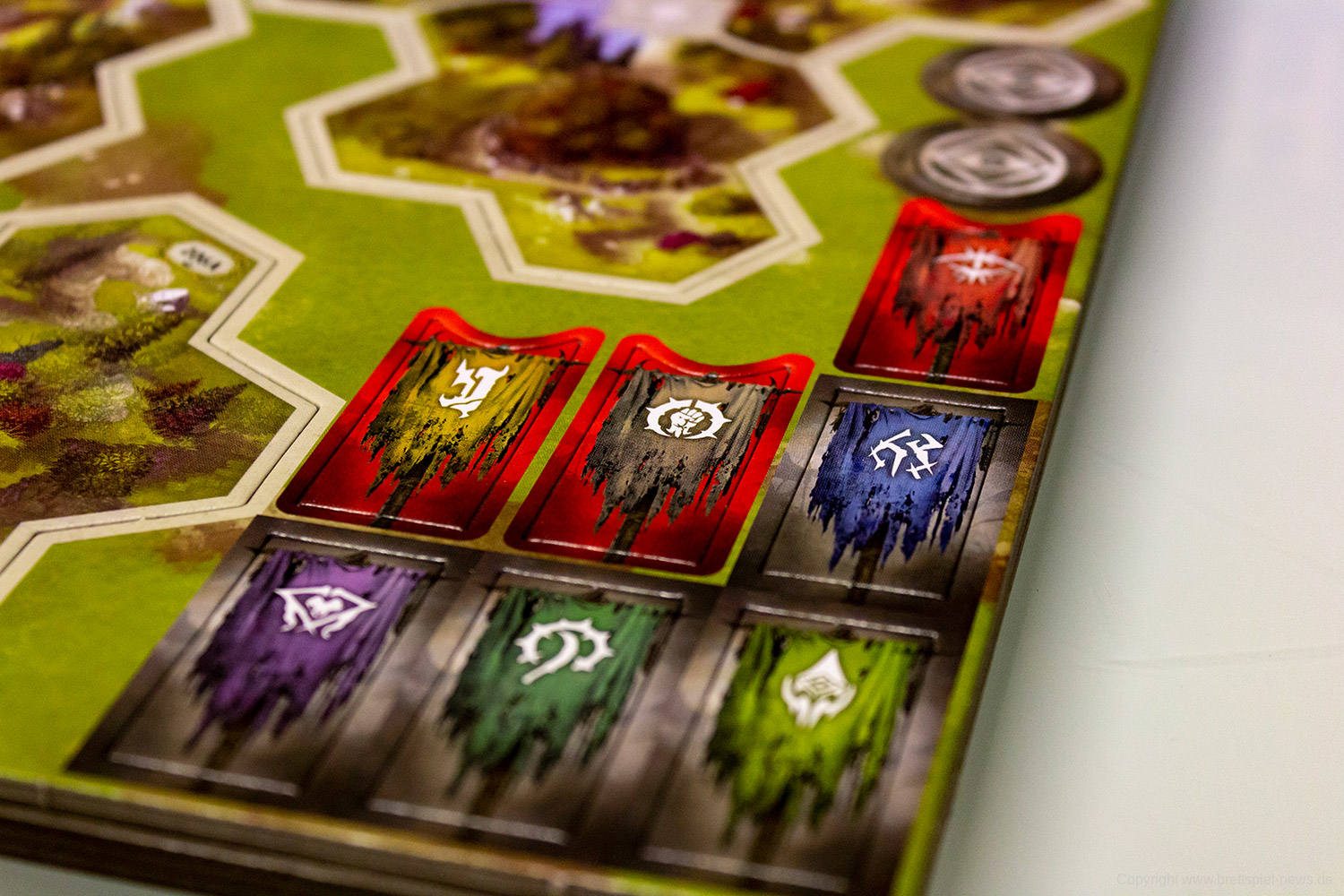 Abgesehen von der Kartengröße hinterlässt das Spielmaterial einen durchweg guten Eindruck. Vor allem die Miniaturen aus stabilem Guss bieten zahlreiche feine Details und hinterlassen ein gutes Bild. Die Spielplanteile sind doppelseitig bedruckt und aus robustem Karton gefertigt. Gleiches gilt für diverse Marker und Geländeteile für das Schlachtfeld.