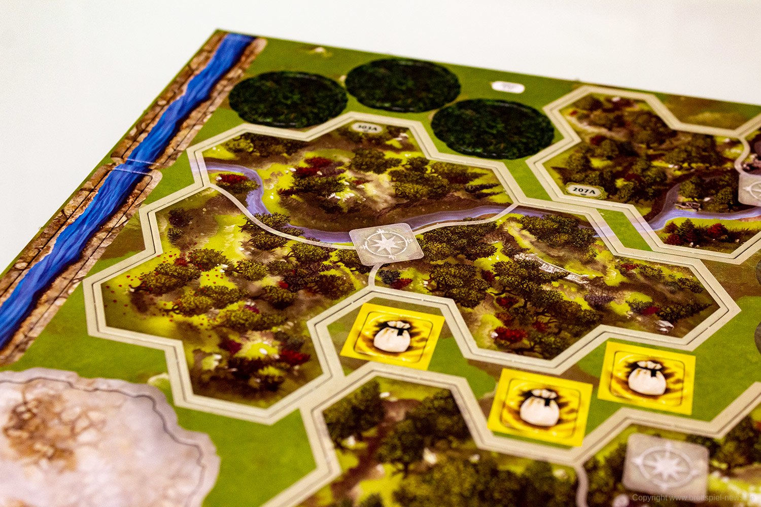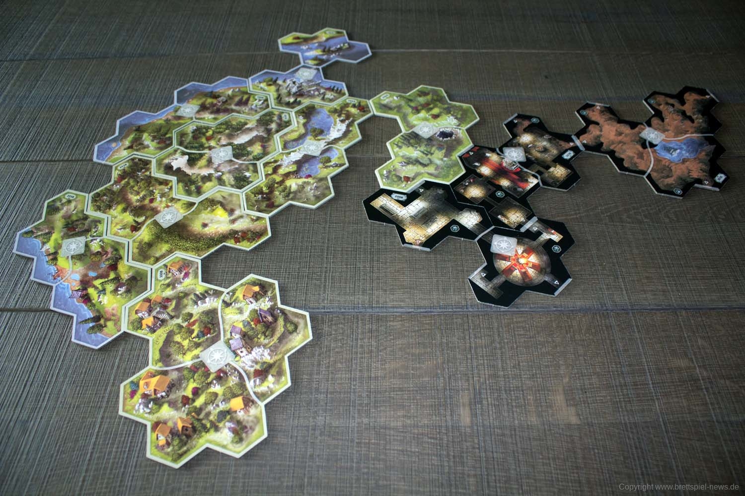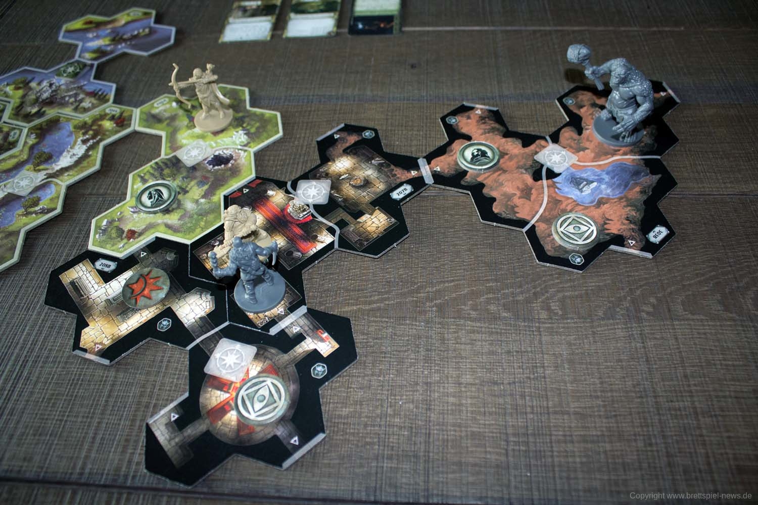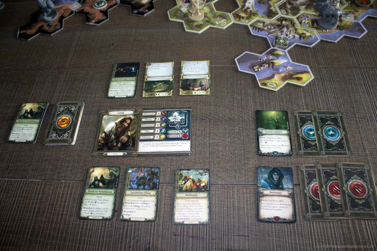 Doch wie funktioniert die Verbindung zwischen Brettspiel und App in diesem Fall? Nun, wer sich mit „Villen des Wahnsinns“ auskennt, wird sich hier sicherlich schnell zurechtfinden. Wie gehabt gibt die App vor, welche Reise-Spielplanteile wie aneinandergelegt werden müssen. Bei Kämpfen geben die SpielerInnen an, wie viel Schaden sie erzielt haben, und bei Interaktionen mit dem Umfeld gibt die App preis, welche Auswirkungen diese haben. Schaden wird, wie bekannt, in körperlichen und geistigen Schaden unterschieden, wobei lediglich aus der Bezeichnung Horror Furcht wurde. Durch erfolgreiche Proben ist es auch hier möglich, Schaden zu negieren. Vieles bleibt somit wie gehabt, teils wurde aber auch Neues eingeführt. Zu den positiven Neuerungen gehört vor allem, dass eine Gefahrenleiste anzeigt, wann negative Effekte eintreten und wieviel Zeit der Gruppe insgesamt bleibt, bevor das Spiel verloren geht. Gerade bei „Villen des Wahnsinns“ konnte man sich nie sicher sein, wieviel Zeit der Gruppe zum Erreichen der Ziele noch bleibt, bevor das Spiel direkt verloren geht. Eine Niederlage in einem Kapitel bedeutet bei der Reise durch Mittelerde zudem auch nicht zwingend das Ende der Kampagne. Wann immer ein Misserfolg in einem Kapitel zum Ende der Kampagne führen wird, wird dies ausdrücklich vor Kapitelbeginn angezeigt. Eine kleinere Neuerung sind die Spielplanteile in Wabenform. Allerdings eine, die beim Anlegen neuer Teile zeitweise zu einem Mini-Ubongo gerät. Zumindest bei uns ist es des Öfteren vorgekommen, dass wir erst ein paar Ansätze brauchten, bis alles passte.