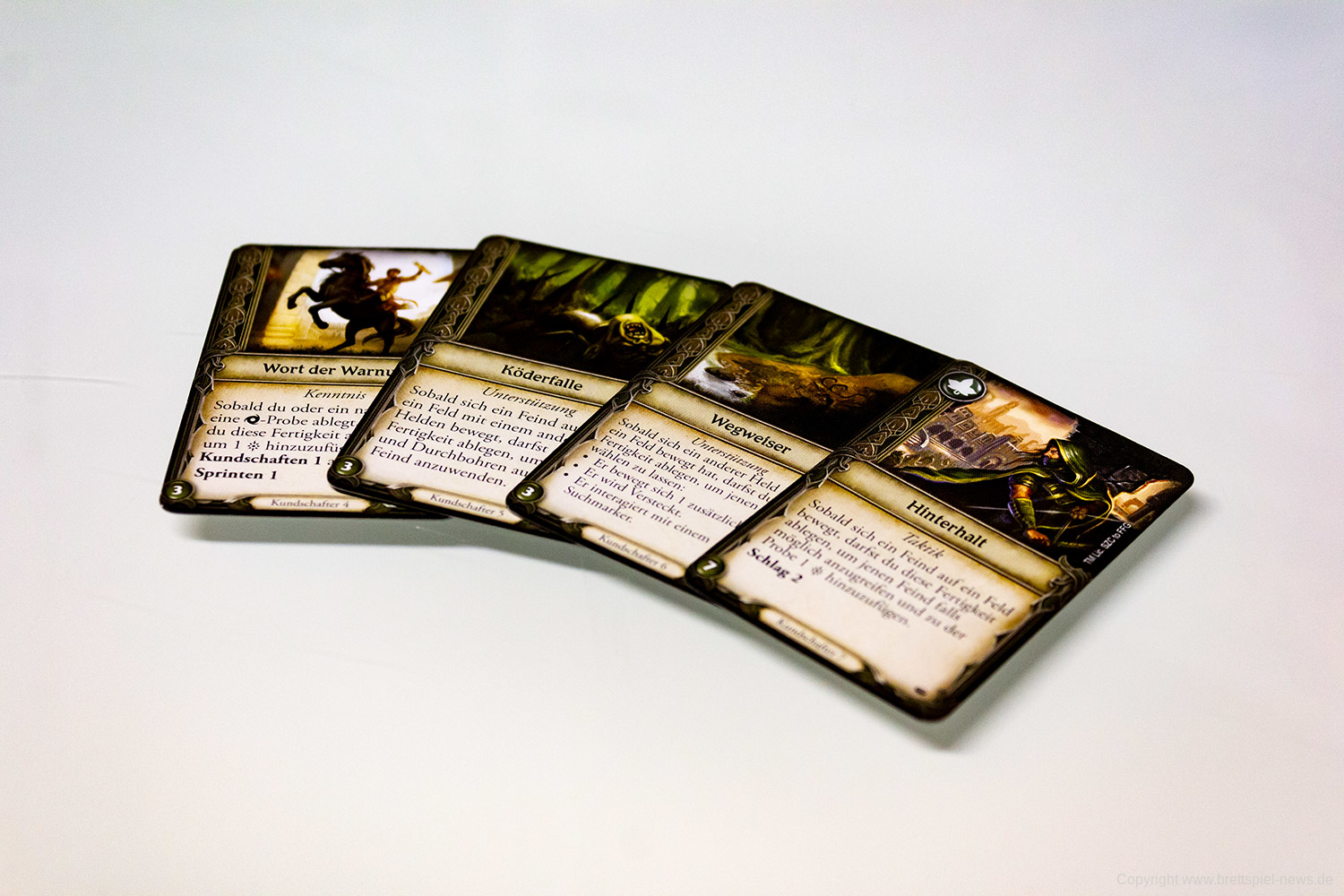 Die im Text beschriebene Fähigkeit in der unteren Hälfte der Karte muss ausgerüstet sein, um sie nutzen zu können. Hierzu wird zu Beginn jeder Runde zunächst das komplette Deck zusammengemischt und anschließend über die Kundschaften-Funktion eine Anzahl Karten, in der Regel 2, vom Nachziehstapel gezogen. Eine Karte darf ausgerüstet und dadurch spielbereit gemacht werden, alle anderen Karten können je nach Belieben auf oder unter das Deck in beliebiger Reihenfolge gelegt werden. Es dürfen insgesamt maximal 4 Karten ausgerüstet sein. Einige Karten geben so einen dauerhaften Effekt, während andere ausgespielt werden können, um einen Effekt auszulösen. Die Symbole in der oberen linken Ecke haben bei ausgerüsteten Karten keinerlei Bedeutung. Es sollte daher wohl überlegt sein, ob eine Karte mit Erfolgssymbol beim Kundschaften ausgerüstet oder lieber oben auf den Nachziehstapel gelegt wird, um somit einen garantierten Erfolg beim Ziehen vom Stapel bei Proben zu erhalten.